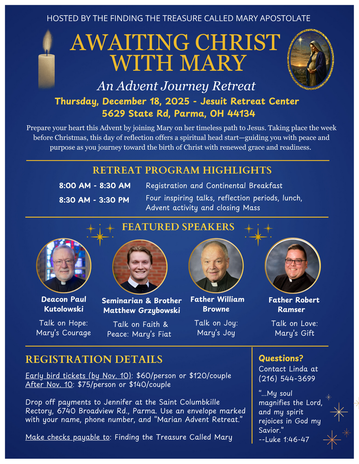 The day includes quiet reflection, Mass, and lunch. Registration and continental breakfast begin at 8:00 AM, the talks begin at 8:30 AM. Early bird tickets (until Friday, November 7) are $60/person or $120/couple; afterwards, tickets are $75/person or $140/couple. Drop off payments to Jennifer at the Saint Columbkille Church Rectory, 6740 Broadview Rd., Parma, OH 44134, in an envelope marked with your name, phone number, and “Marian Advent Retreat.” Make checks payable to Finding the Treasure Called Mary. For alternate payment methods or delivery, contact Linda Lagunzad at (216) 544-3699. Space is limited—register early!