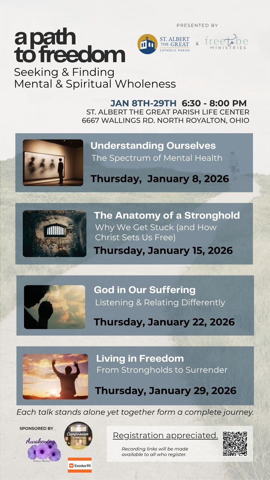 A 4-part speaker series will be offered 4 Thursday evenings in January. Free To Be Ministries counselors will blend wisdom from Scripture and the medical approach to mental health to help participants understand mental, spiritual, and emotional struggles we all face, what it means to be fully human, and, within the context of relationships, including our relationship with God and others, access interior freedom. Registration is recommended. Please call the parish office at (440) 237-6760.