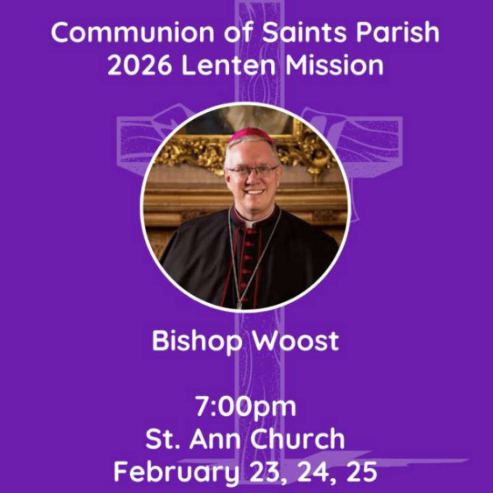 Auxiliary Bishop Woost will be coming to Communion of Saints Parish to give our annual 3-night Lenten Mission on the Eucharist as our Source and Summit on Monday, February 23 - Wednesday, February 25, 7-8pm each night at St. Ann Church. There will be Eucharistic Adoration each evening as part of the talks. No need to register!
