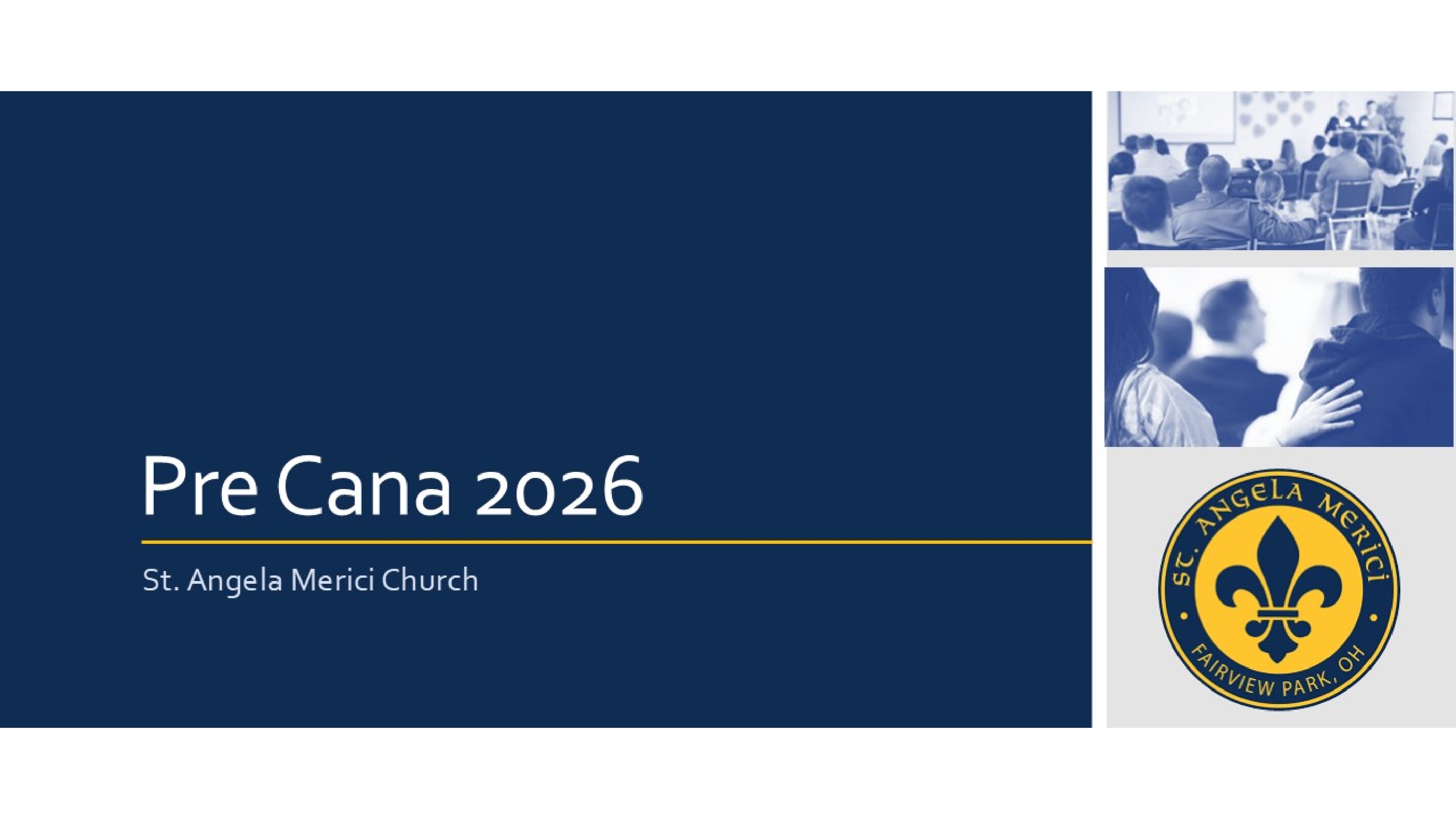 St. Angela Merici hosts a one-day Pre Cana retreat each year to help engaged couples prepare for marriage in the Catholic Church. Married couples from our Marriage Ministry team plan a day for engaged couples to explore communication, spirituality, values, and practical matters in marriage. The day’s format is a mix of married couples sharing their experiences, interactive breakout sessions, and time for couples to discuss presented topics. Pre Cana includes breakfast, lunch, and dinner-time appetizers. All retreat participants will attend the parish's 4:30 p.m. Mass. Cost is $85/couple.