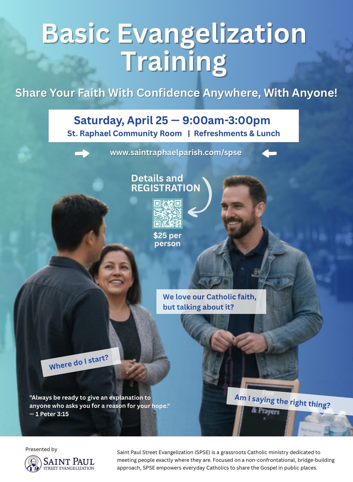 Share Your Faith With Confidence! We love our Catholic faith, but talking about it? That can feel a little intimidating. Whether you’re worried about saying the wrong thing or just don't know where to start, we’re here to help. Join us for a one-day Basic Evangelization Training workshop presented by Bob Wilson, Saint Paul Street Evangelist. The presentation is designed to make sharing the Gospel as natural as having a conversation over coffee. Registration: $25 (includes lunch)