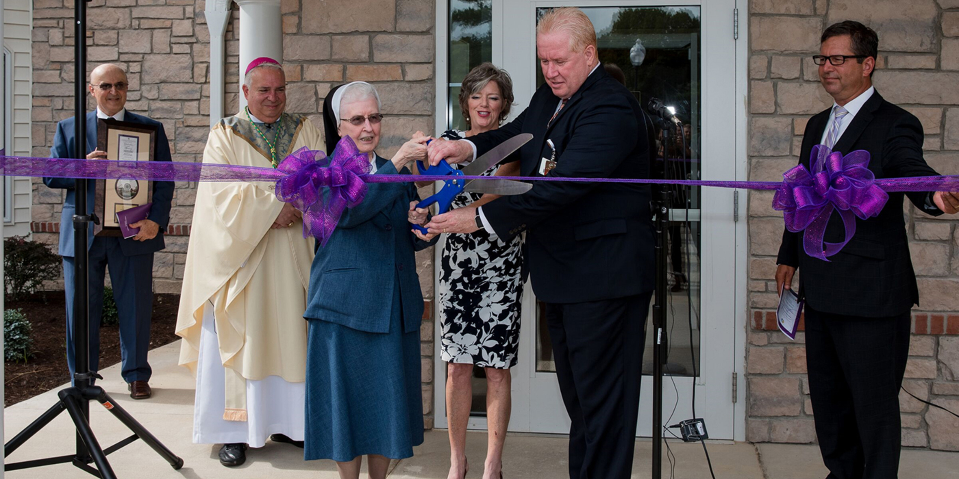 Prior to the Mass, a ribbon-cutting ceremony took place at the main entrance to the memory support services unit. Judy Amiano, president and CEO of Franciscan Ministries, was joined by Bishop Perez, Parma Mayor Tim DeGeeter and Patrick Welsh, Mount Alverna executive director, to cut the purple ribbon symbolically opening the facility. Ancora Memory Support will open officially to residents in August.