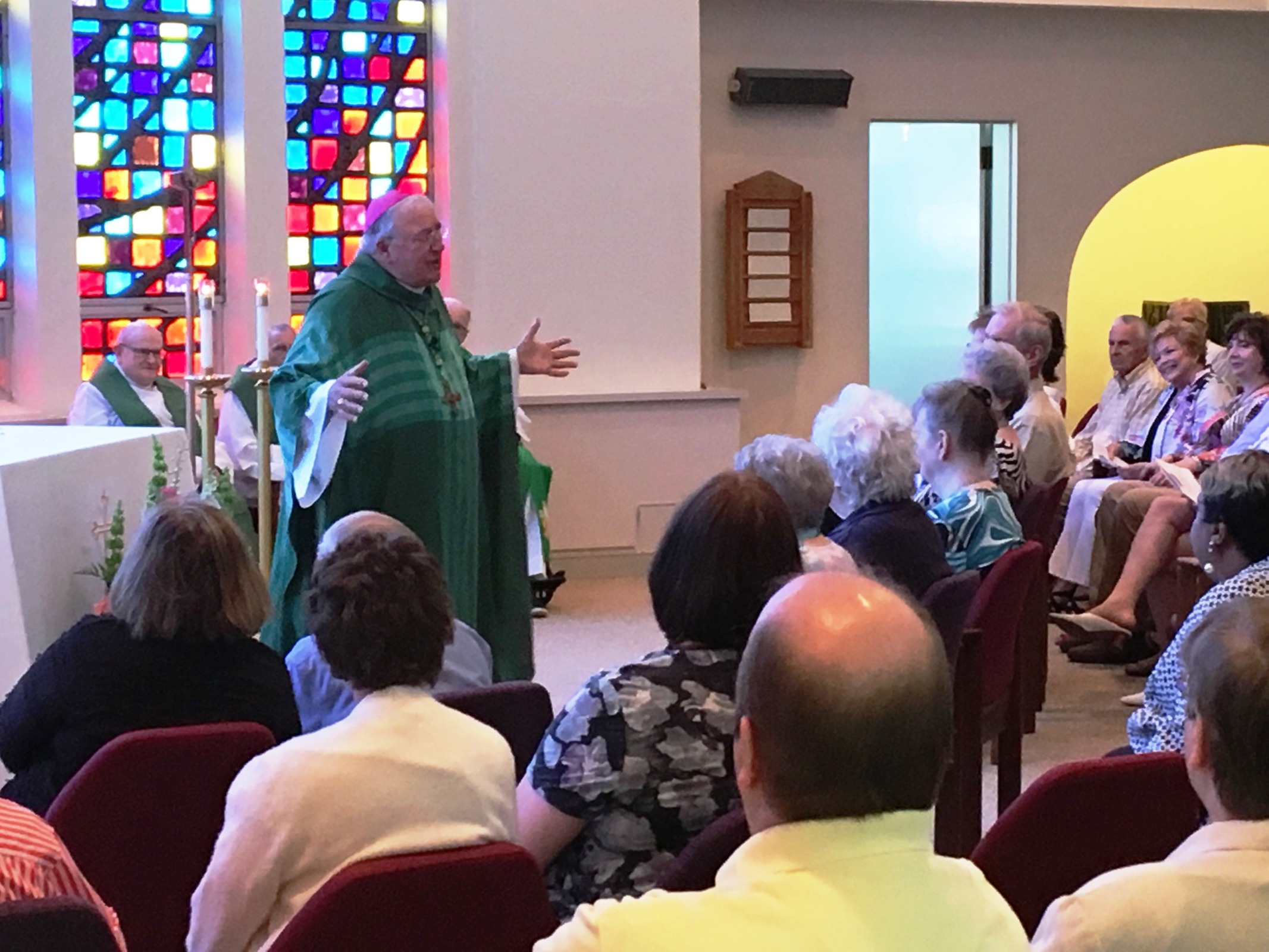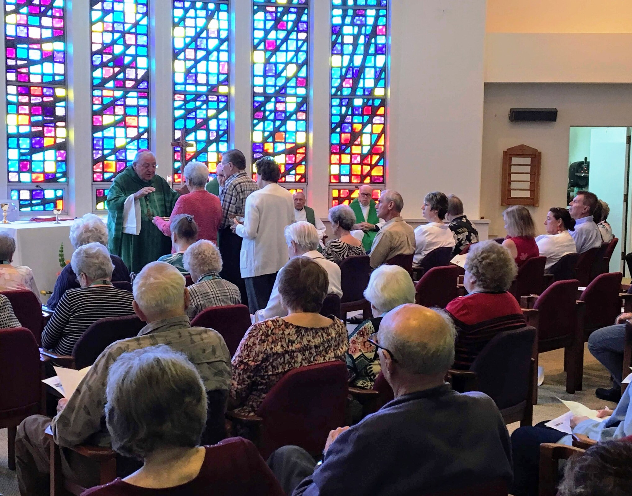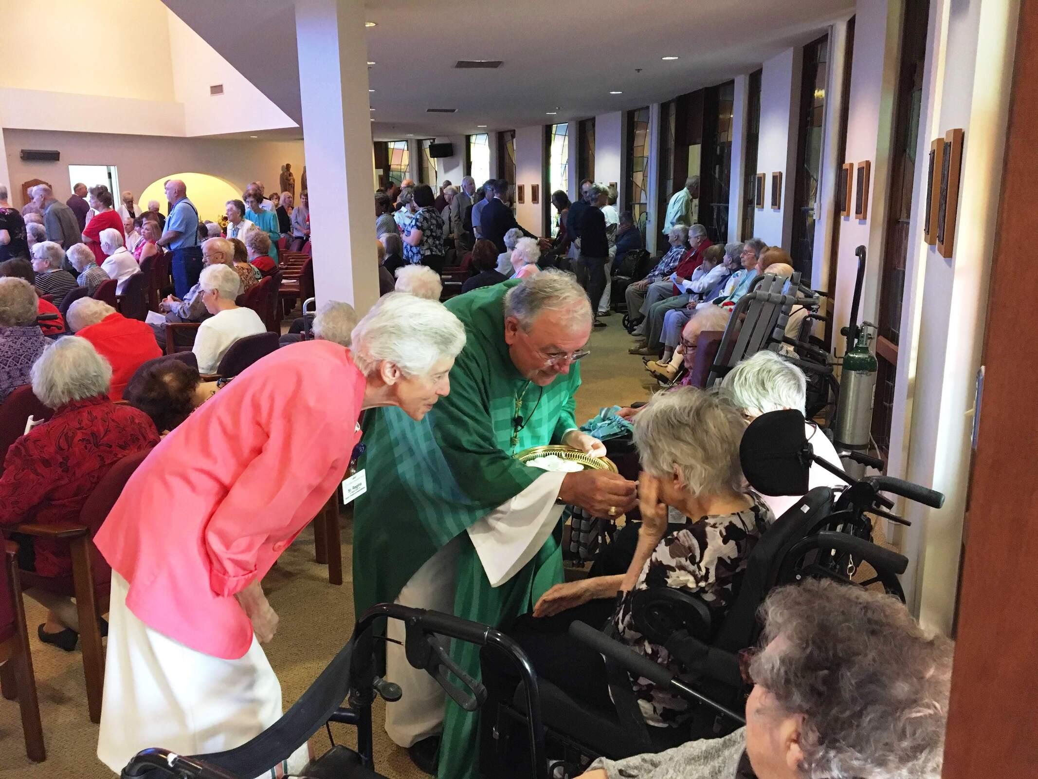 Bishop Roger Gries joined more than 100 people at Light of Hearts Villa in Bedford to celebrate the senior living facility’s 30th anniversary with a Mass and brunch on Sept. 1. Father Thomas O’Donnell, a resident of the facility, concelebrated Mass.