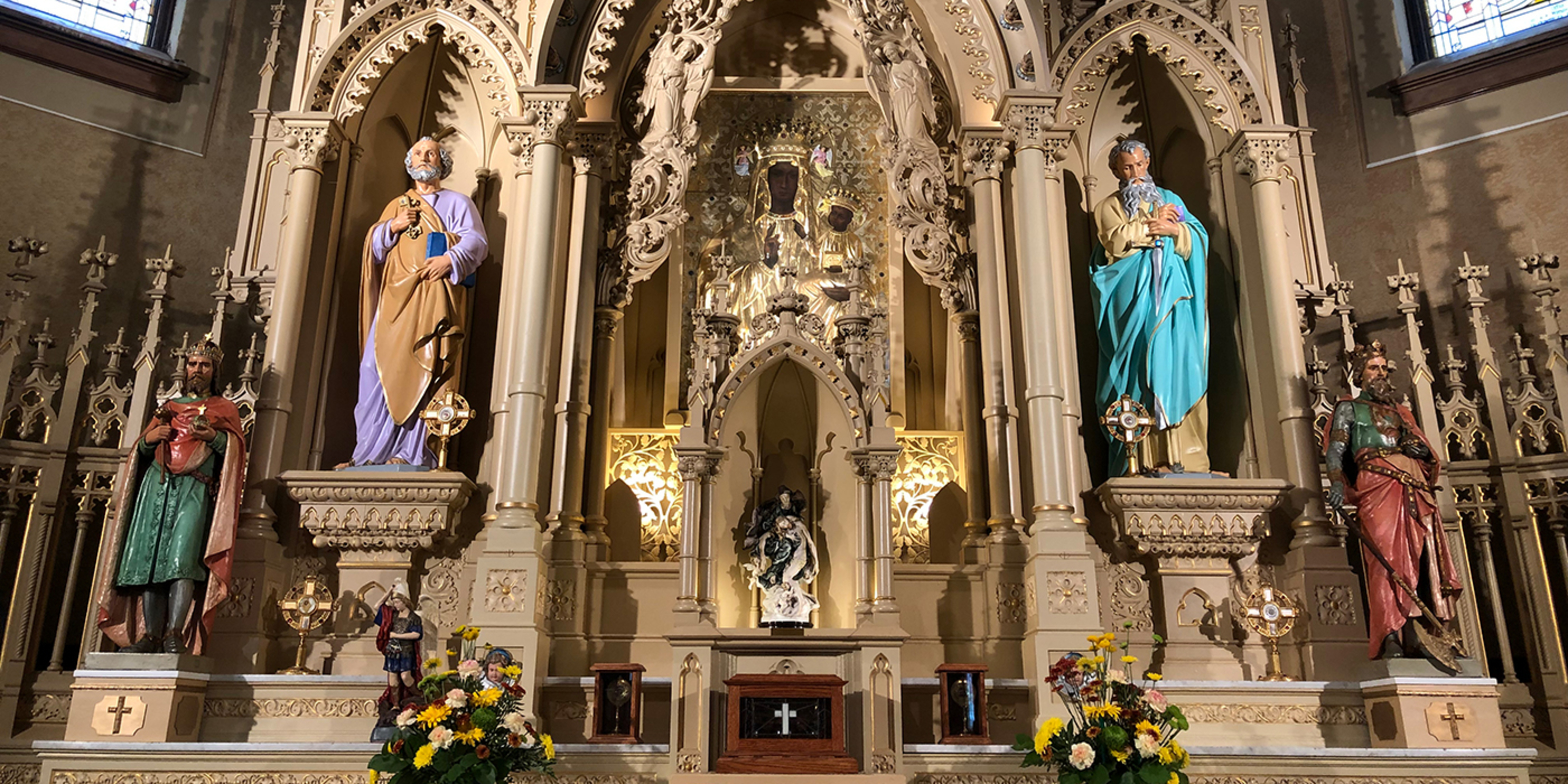 Although Nativity of the Blessed Virgin Mary has a Polish heritage, it also includes other ethnicities. Hungarian statues adorn the altar, including St. Peter and St. Paul, whose relics are next to each. The restored stained-glass windows are from an unknown German artist.