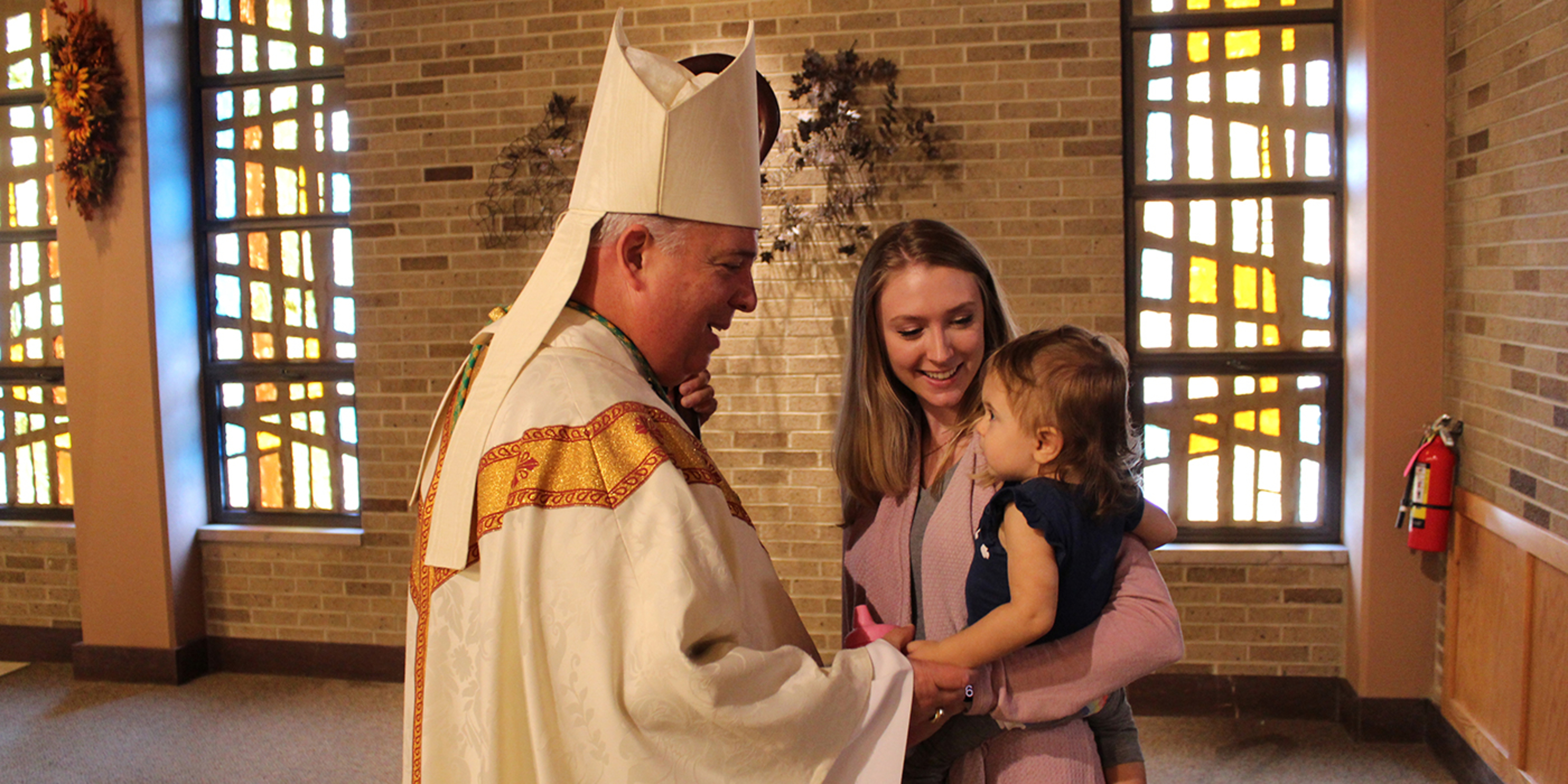 On Oct. 7, Bishop Nelson Perez toured this section of SS. Robert & William when he visited the school for the first time. The students were anxious to show off their new classrooms, books and snack area and even performed their song from the ribbon-cutting for him. In the area for Baby Angels, for those 6 weeks through 18 months, a baby named Kennedy was captivated by the bishop. She smiled and cooed as he held her for a blessing.