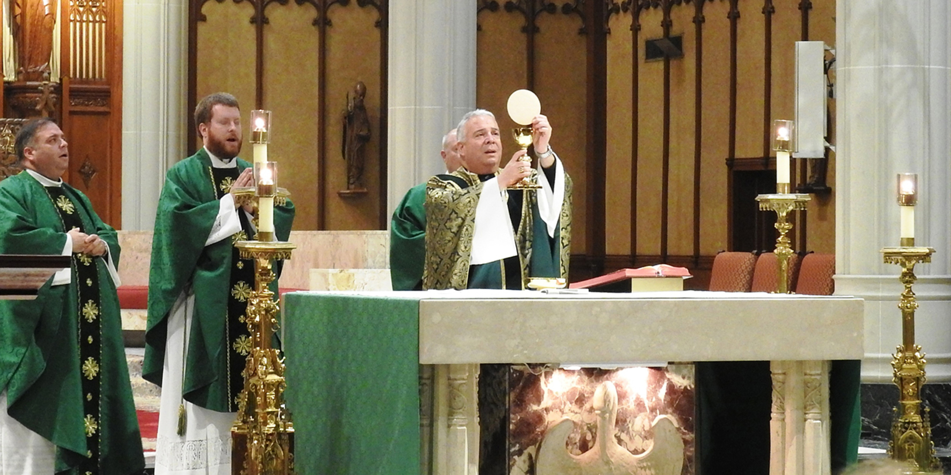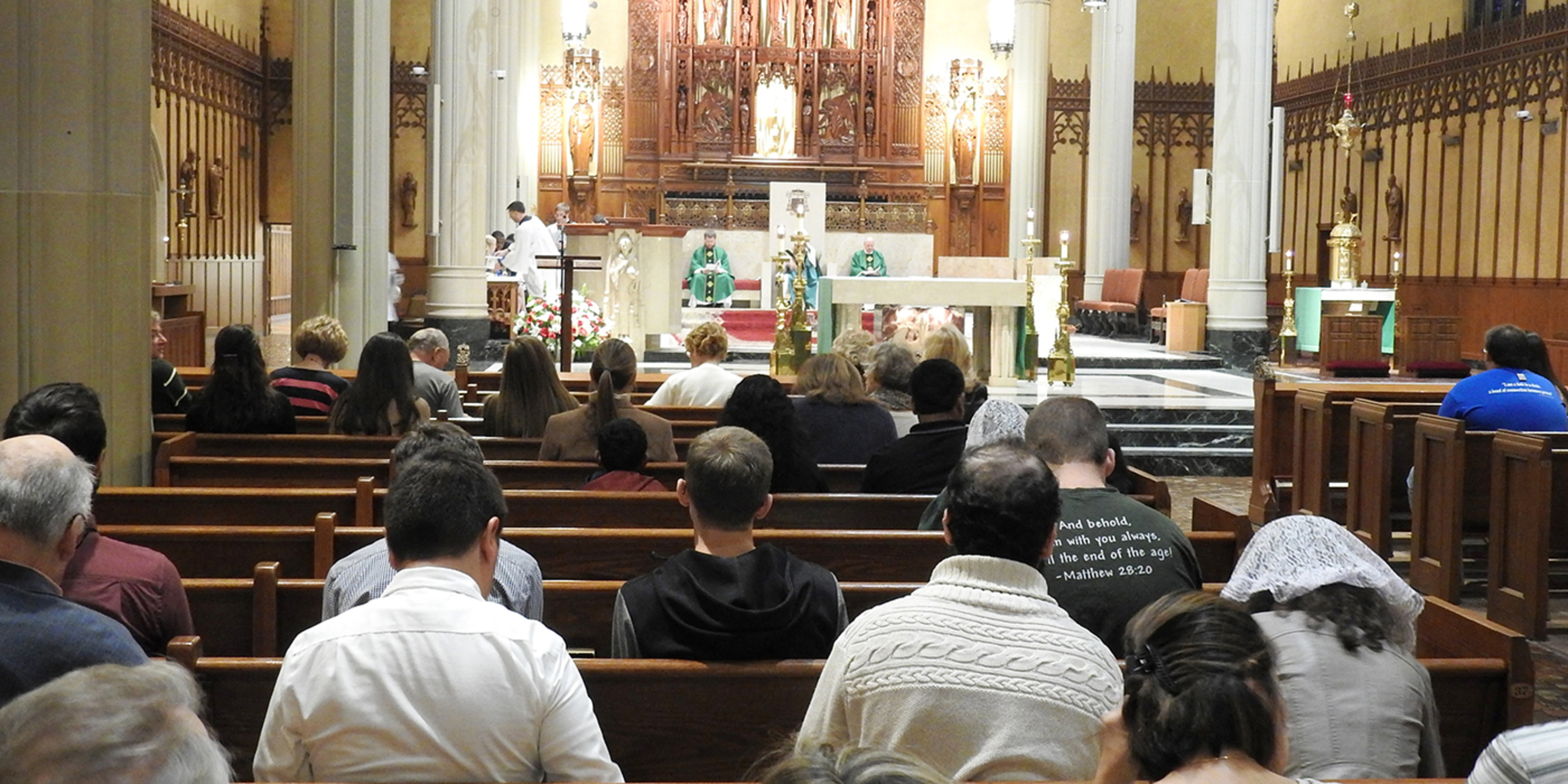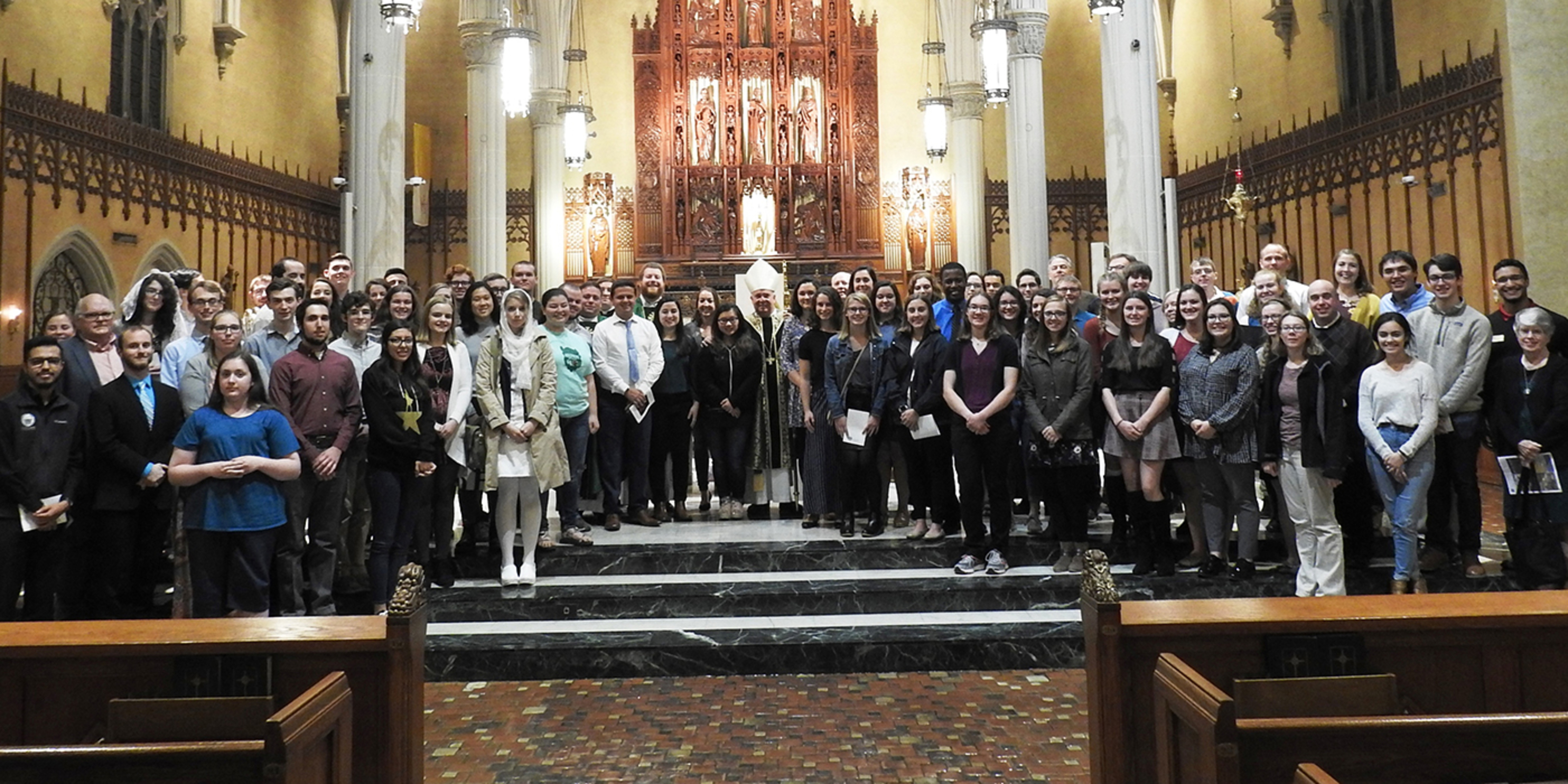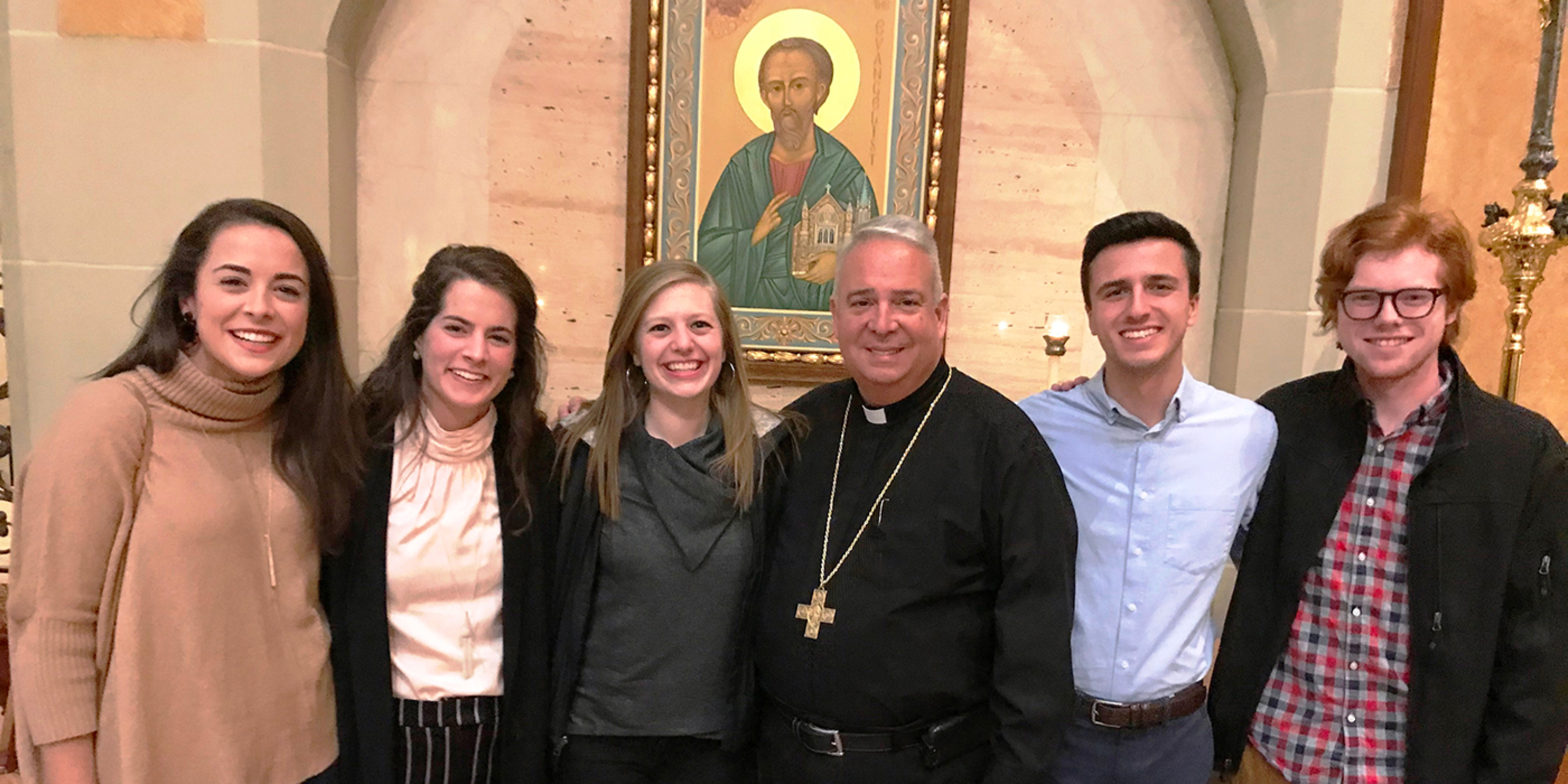 The students, who are involved in Newman Campus Ministry at their respective schools, joined campus ministers and others for the 5:30 p.m. liturgy at the Cathedral of St. John the Evangelist to celebrate the canonization of a new saint: Cardinal John Henry Newman, after whom the campus ministry program is named. Bishop Nelson Perez presided at the Mass, with Father Vince Hawk, pastor of St. Peter Parish in Loudonville, director of Newman Campus Ministry in the Catholic Diocese of Cleveland and chaplain for Ashland’s Newman Campus Ministry; Father Dan Schlegel, diocesan vicar for clergy and religious; and Father Rich Samide, parochial vicar at St. Mary of the Immaculate Conception Parish in Wooster, as concelebrants.