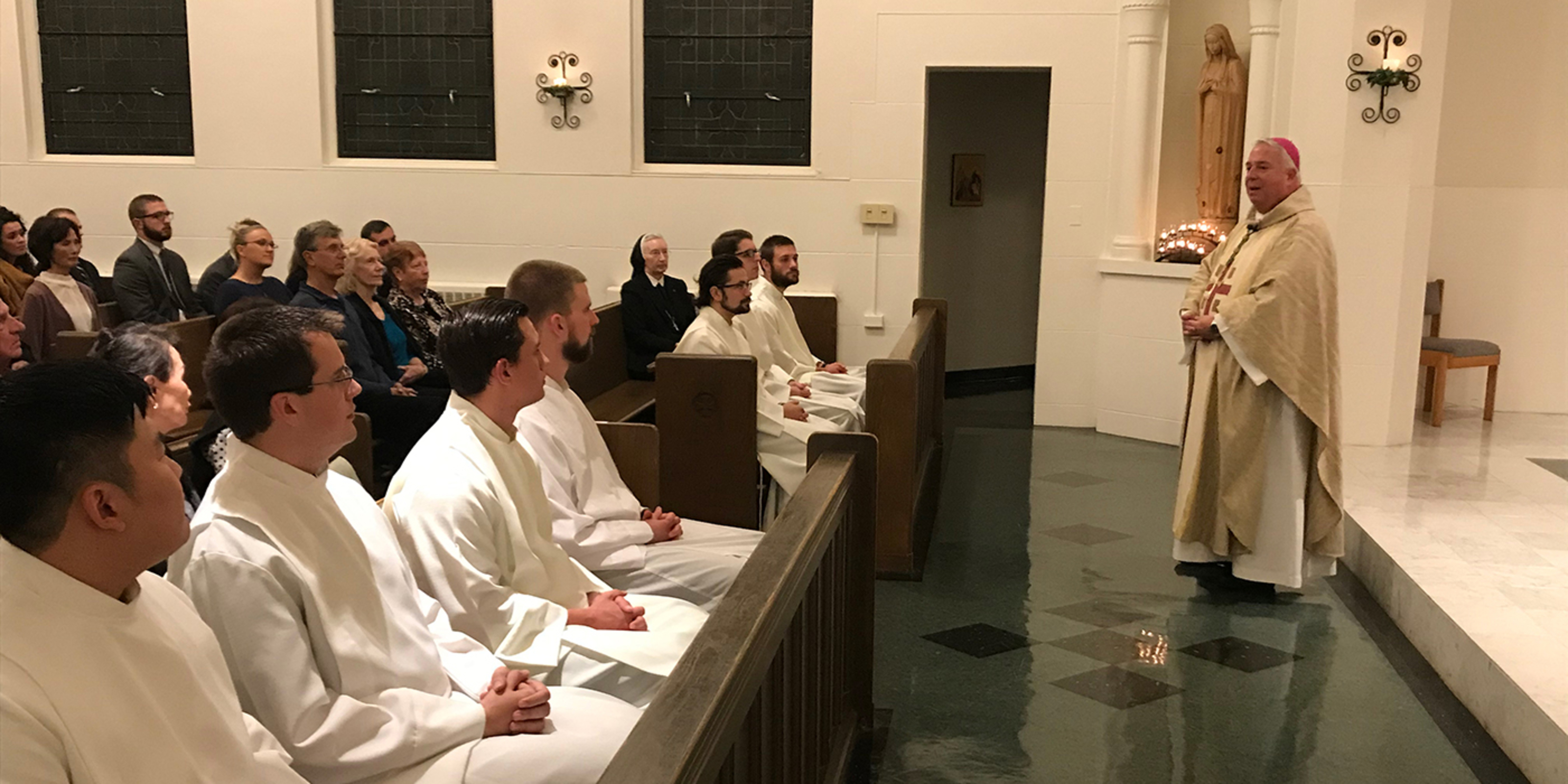 As another step in their journey toward the priesthood, seven students of Saint Mary Seminary were instituted into the ministry of lector by Bishop Nelson Perez during a Mass on Oct. 11 in Resurrection Chapel at the Center for Pastoral Leadership in Wickliffe, where the seminary is located.