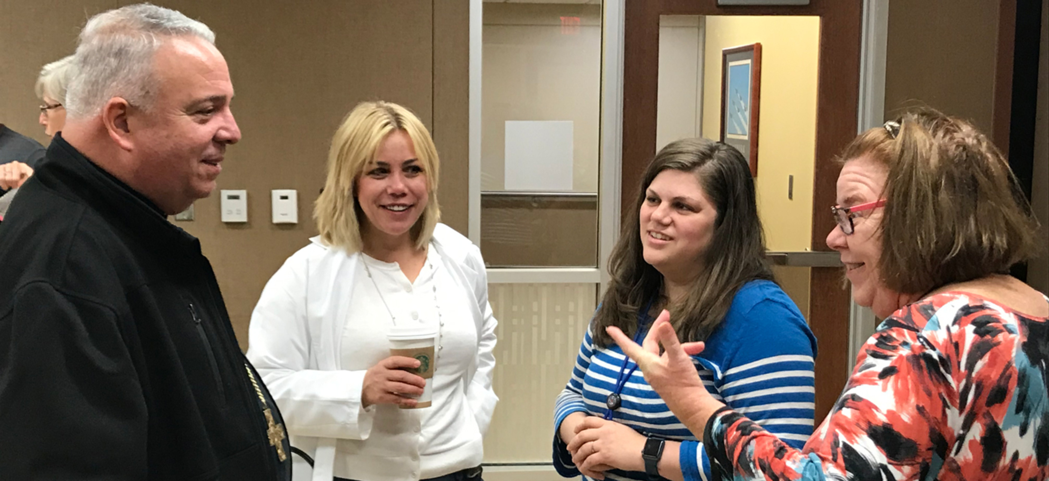 Father Maurice D’Souza, a VA chaplain, guided the bishop through a maze of hallways explaining services and introducing the leader of the Catholic Diocese of Cleveland to the facility’s administrators, fellow chaplains, patients, staff and others.