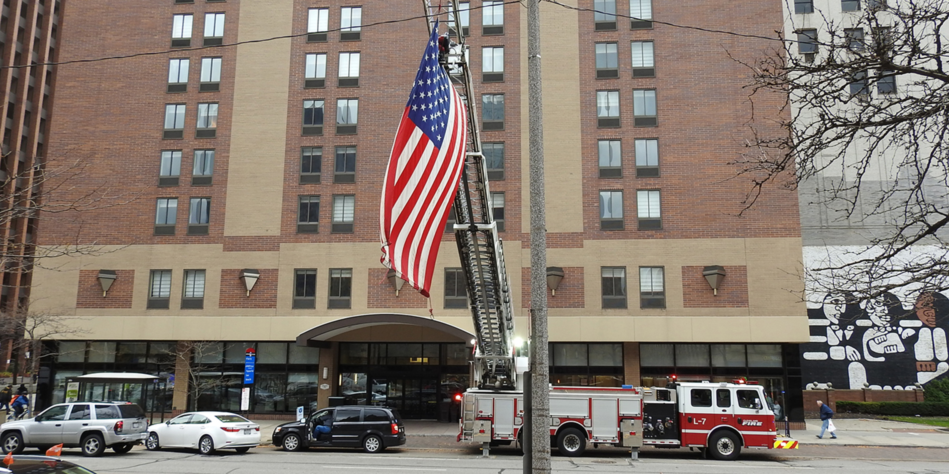 Those arriving at the cathedral for the Mass saw a Cleveland fire truck with its ladder extended across East Ninth Street in front of the cathedral as a tribute to Bishop Lennon. A large American flag hung from the ladder. The late bishop’s father was deputy fire chief in his hometown of Arlington, Massachusetts and Bishop Lennon served as a fire department chaplain, a ministry he cherished.