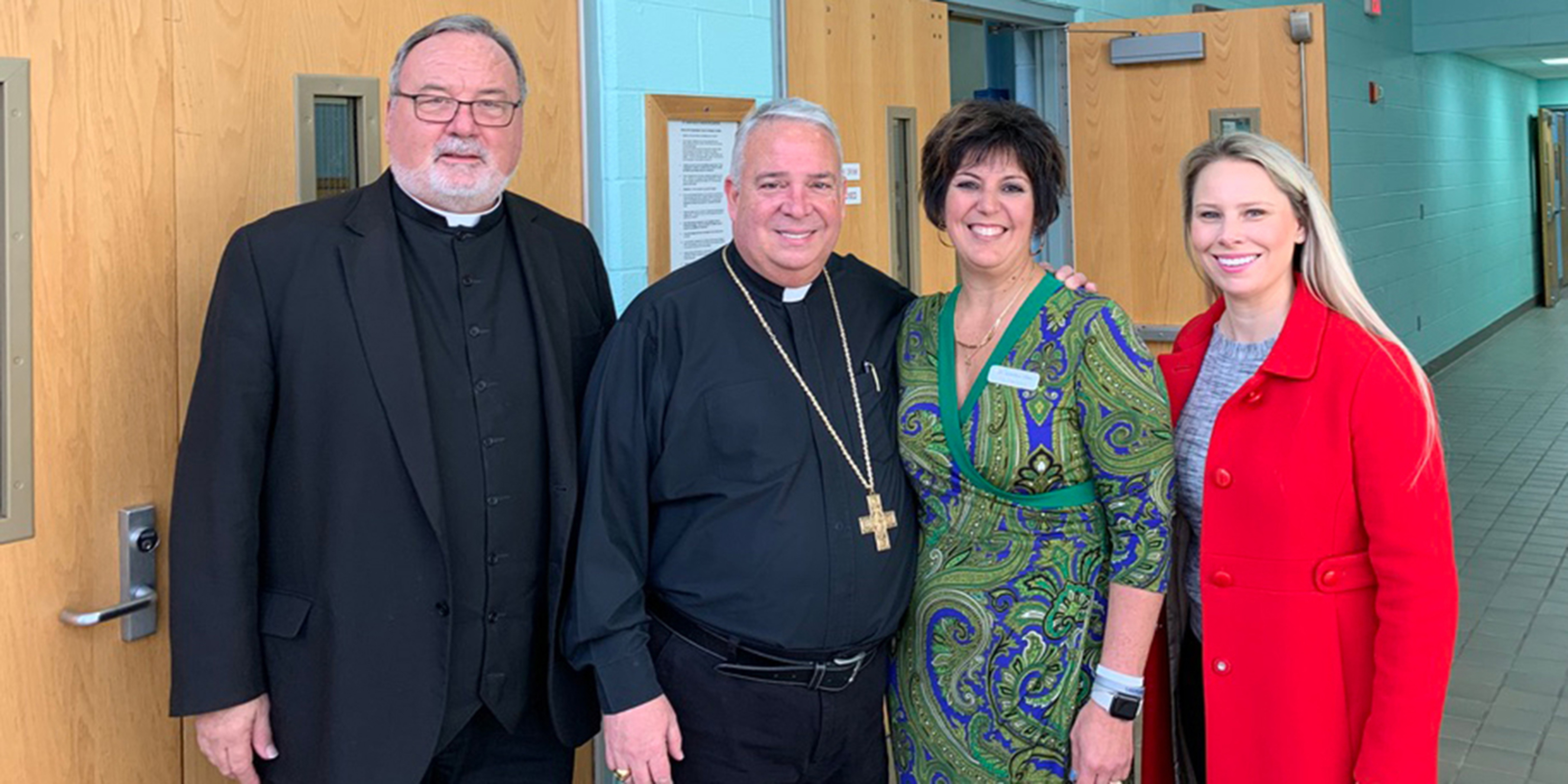 Students guided the bishop on a tour of the school, showing off the newly renovated DREAM Den, where some students were engaged in a robotics lesson.