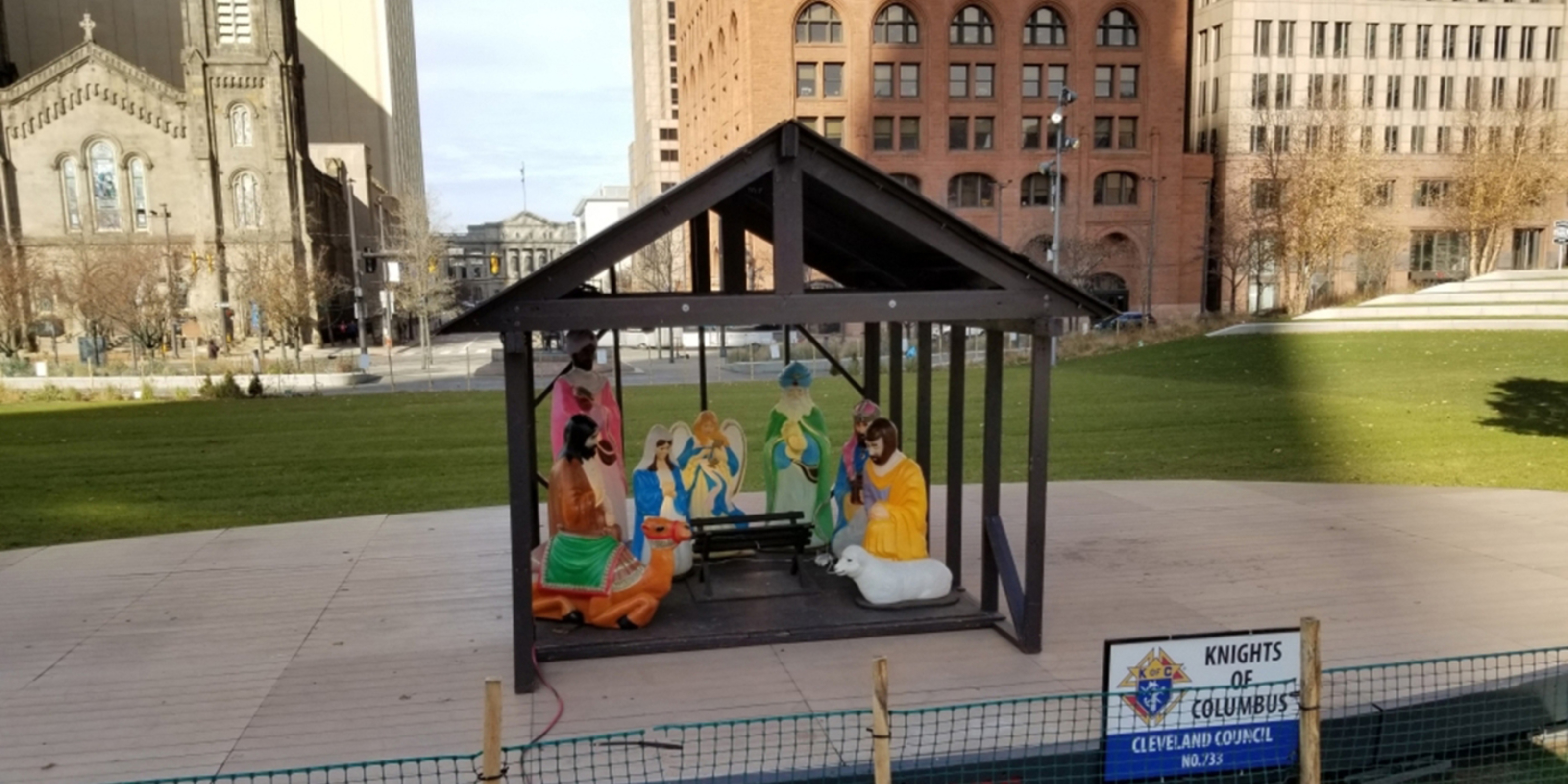 The Nativity sits on the main stage in the center of Public Square on Superior Avenue, facing the Terminal Tower. Also included in that quadrant of the square is the Jewish grand menorah.