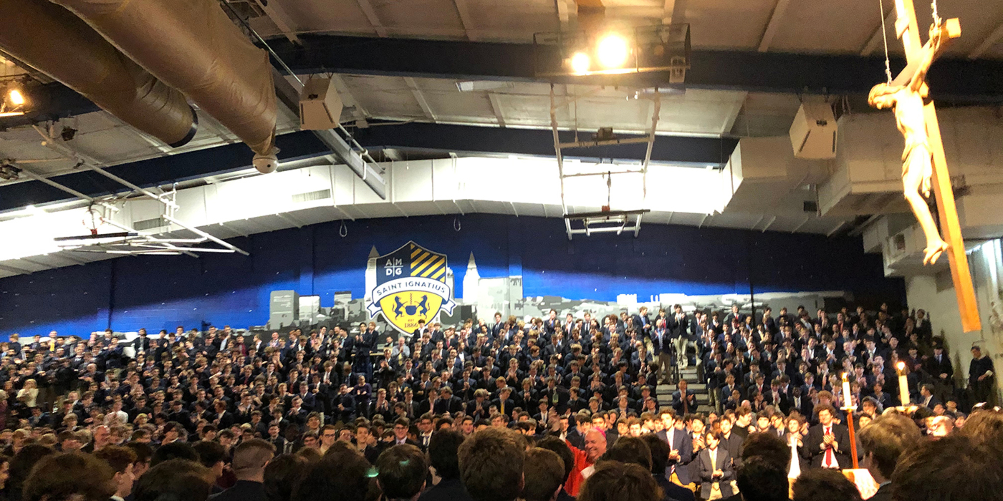 During the Communion reflection, a slideshow was played showing the various works of mercy performed during the year by St. Ignatius students. The works include feeding the homeless, serving as pall bearers for those who have none, neighborhood cleanup, mentoring younger students and more.