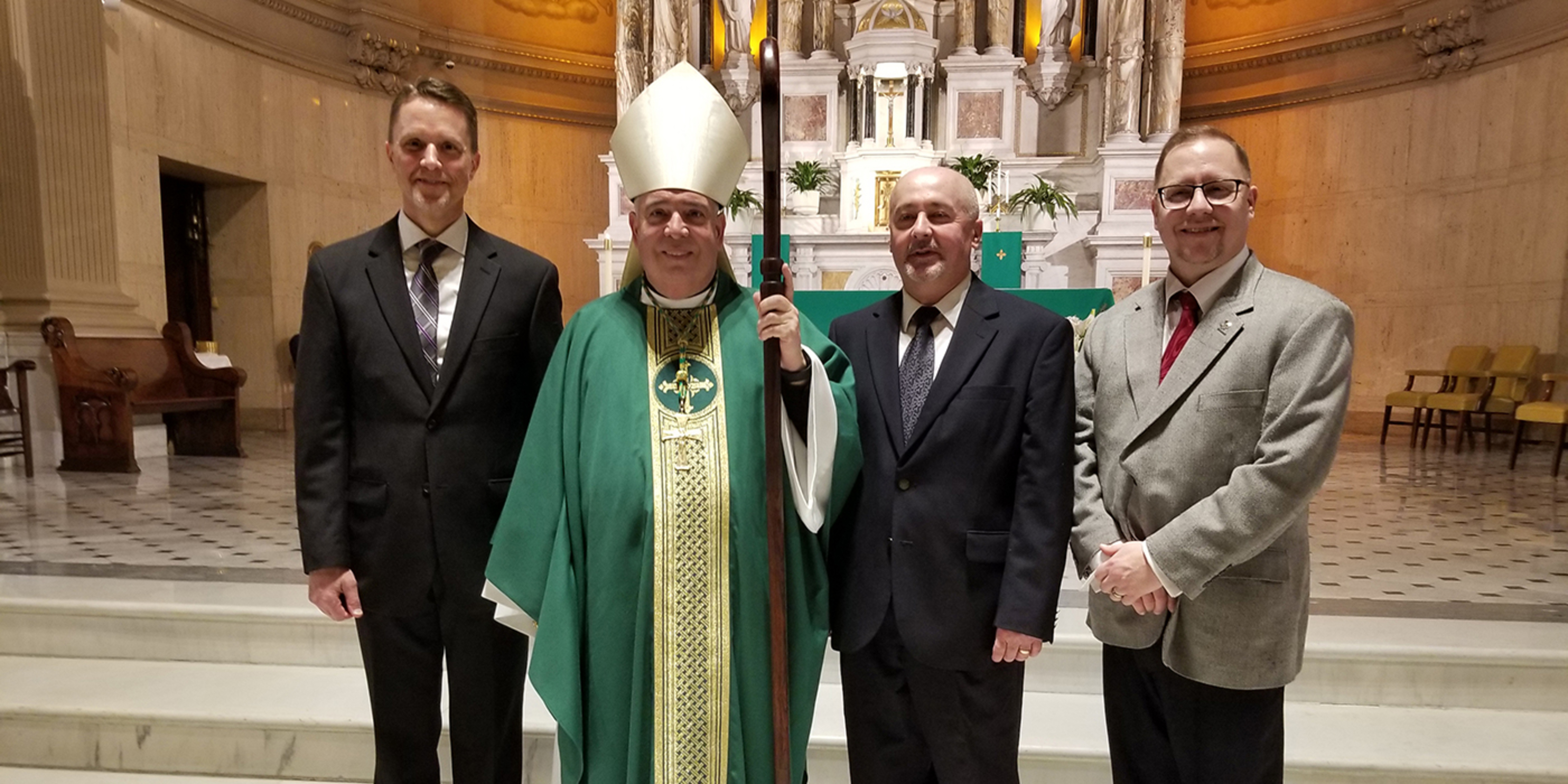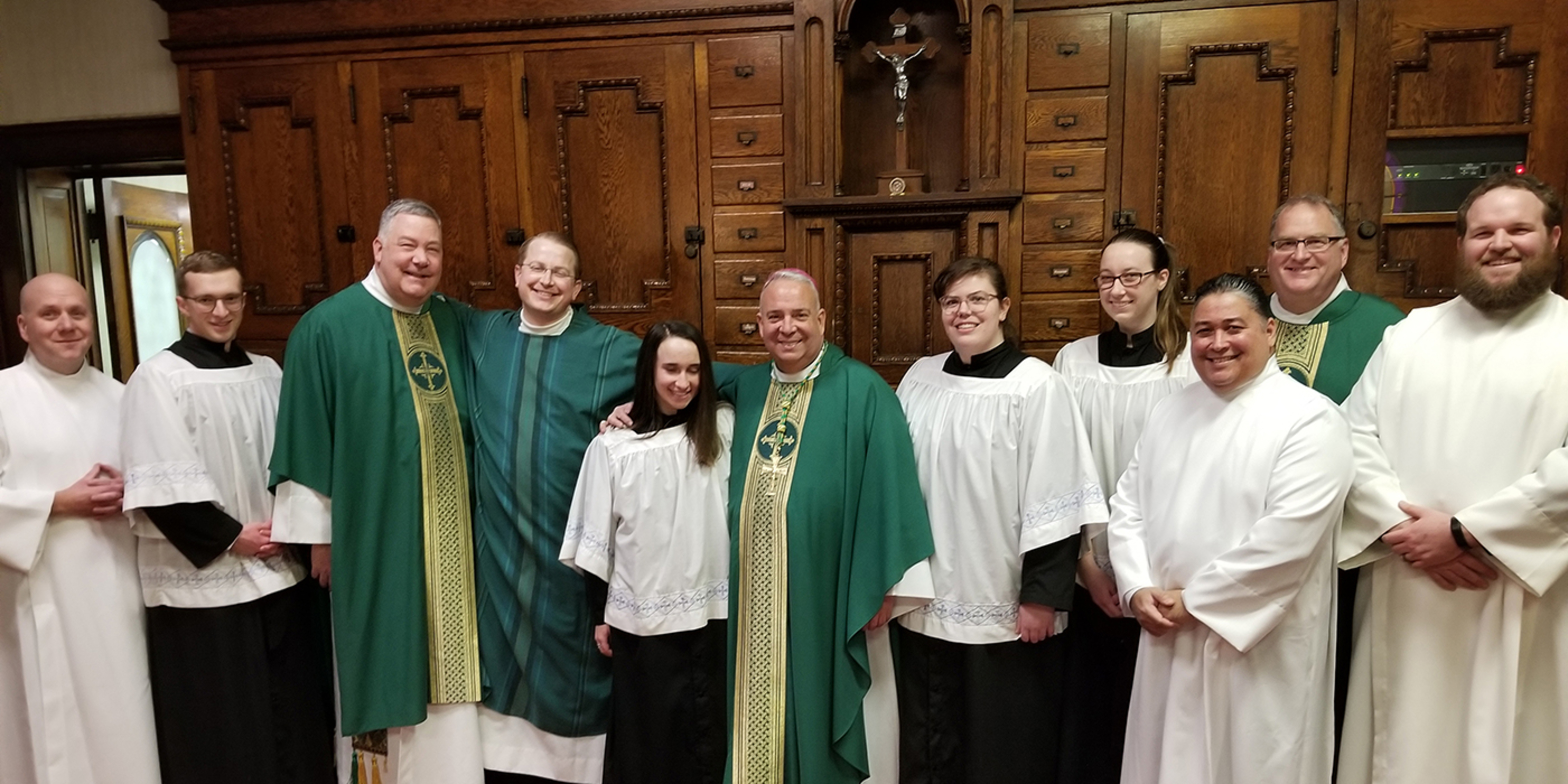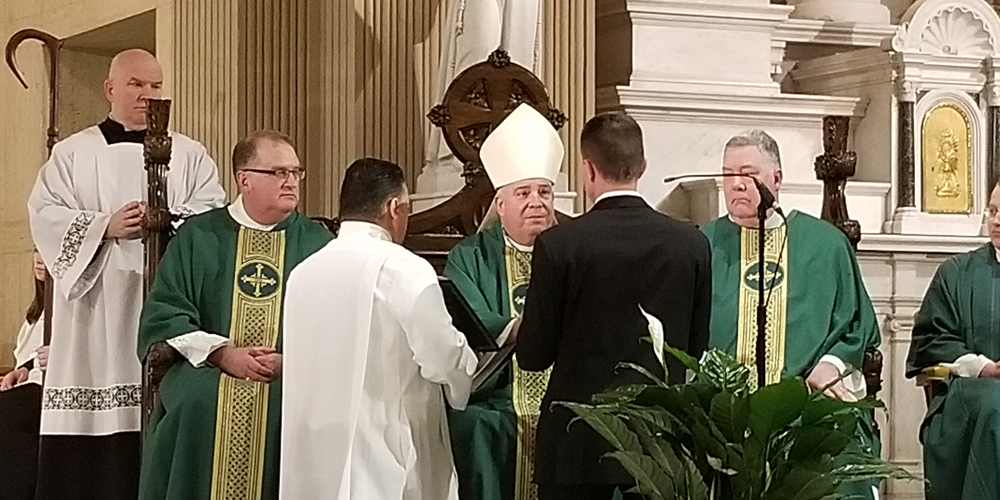 Three men in formation to become permanent deacons for the Catholic Diocese of Cleveland were instituted to the ministry of acolyte by Archbishop-designate Nelson Perez during the Saturday vigil Mass at St. Bernard Church in downtown Akron on Feb. 8.