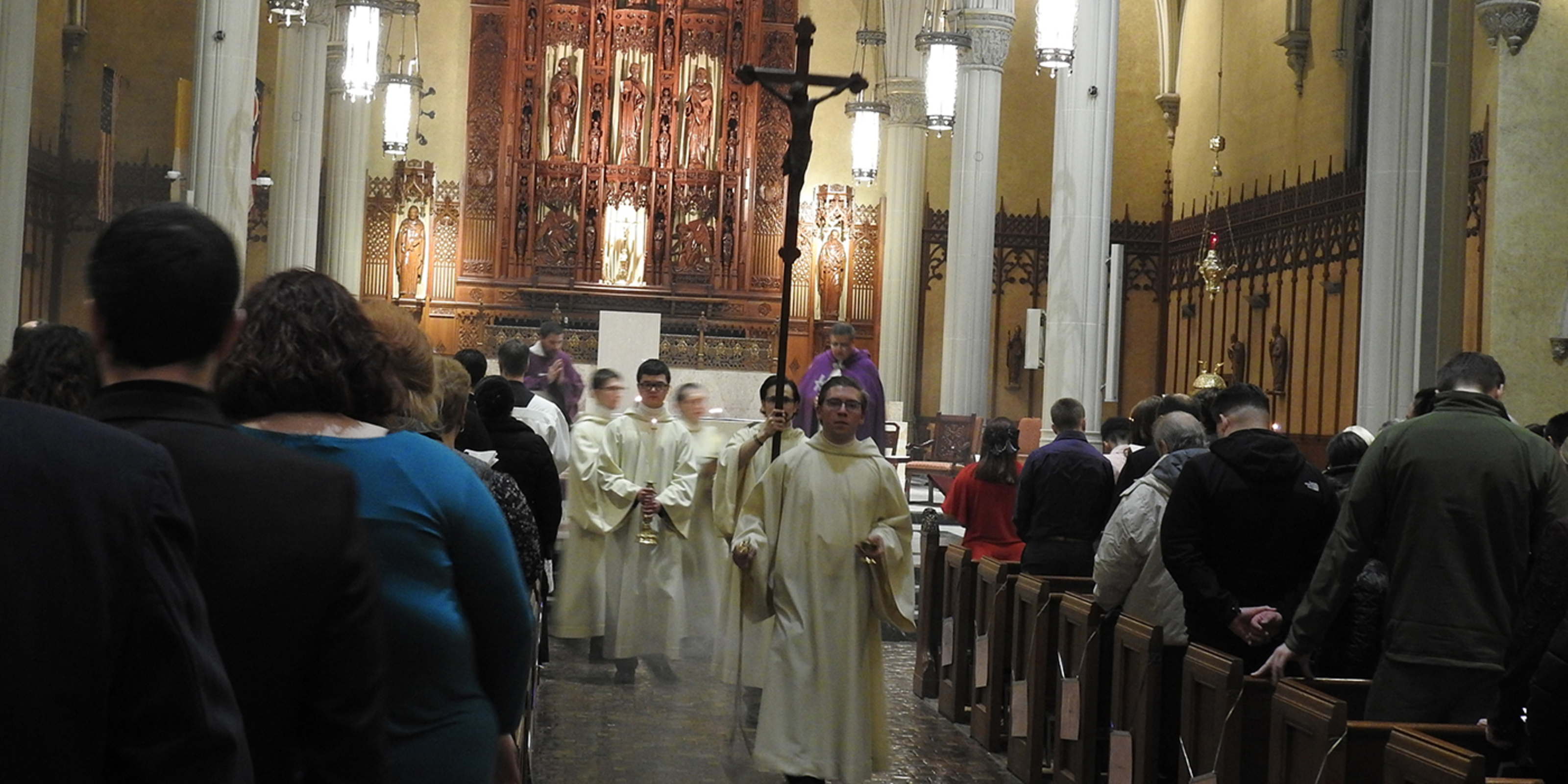 After the homily, Jeanne Marie Miles, director of the diocesan Office for Worship, announced the names of parishes as the catechumens and their godparents processed up the main aisle of the cathedral where they were greeted by Father Oleksiak. A representative of each parish presented the book with their names to him. Each parish group was accompanied by two acolytes.