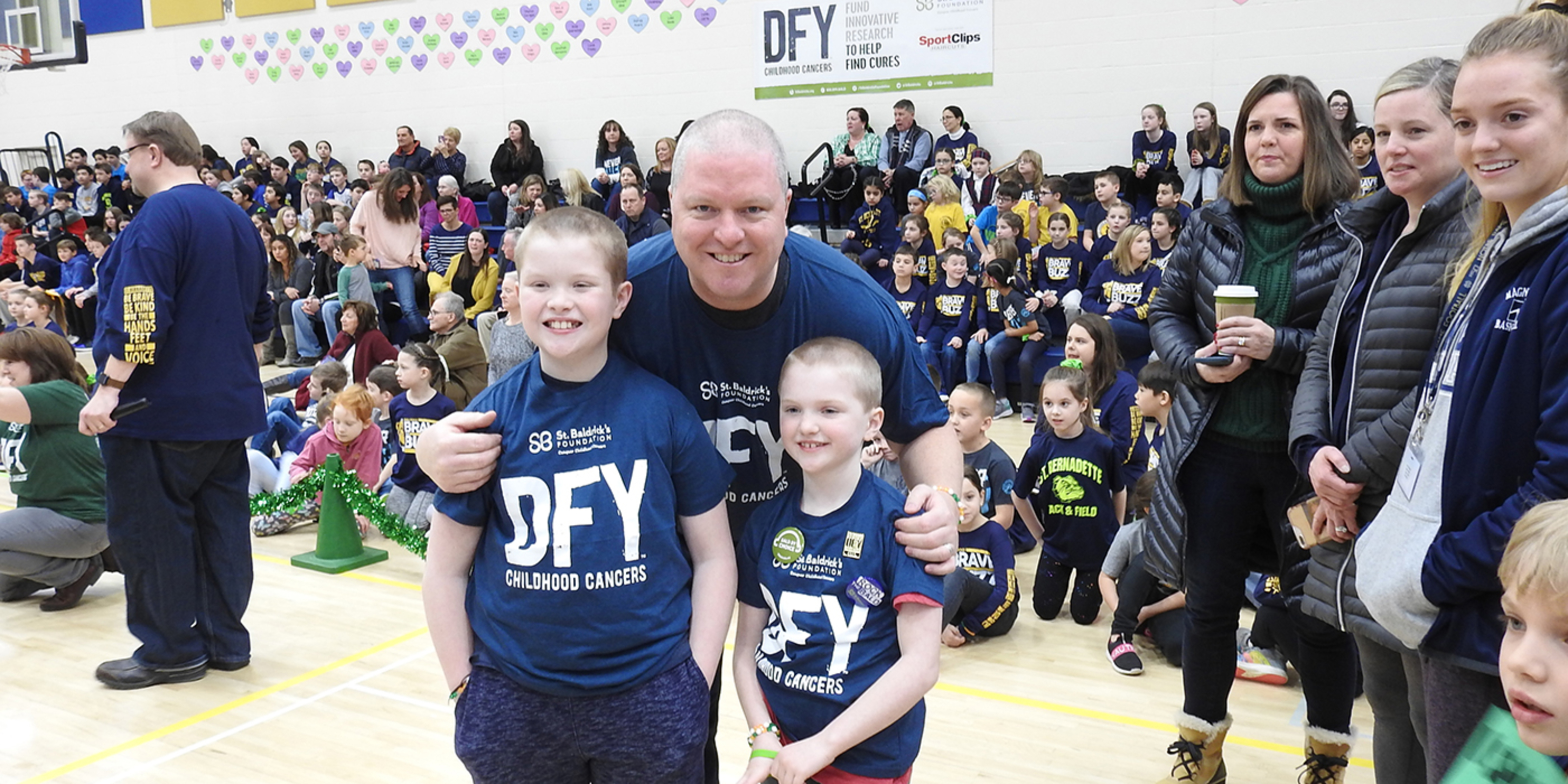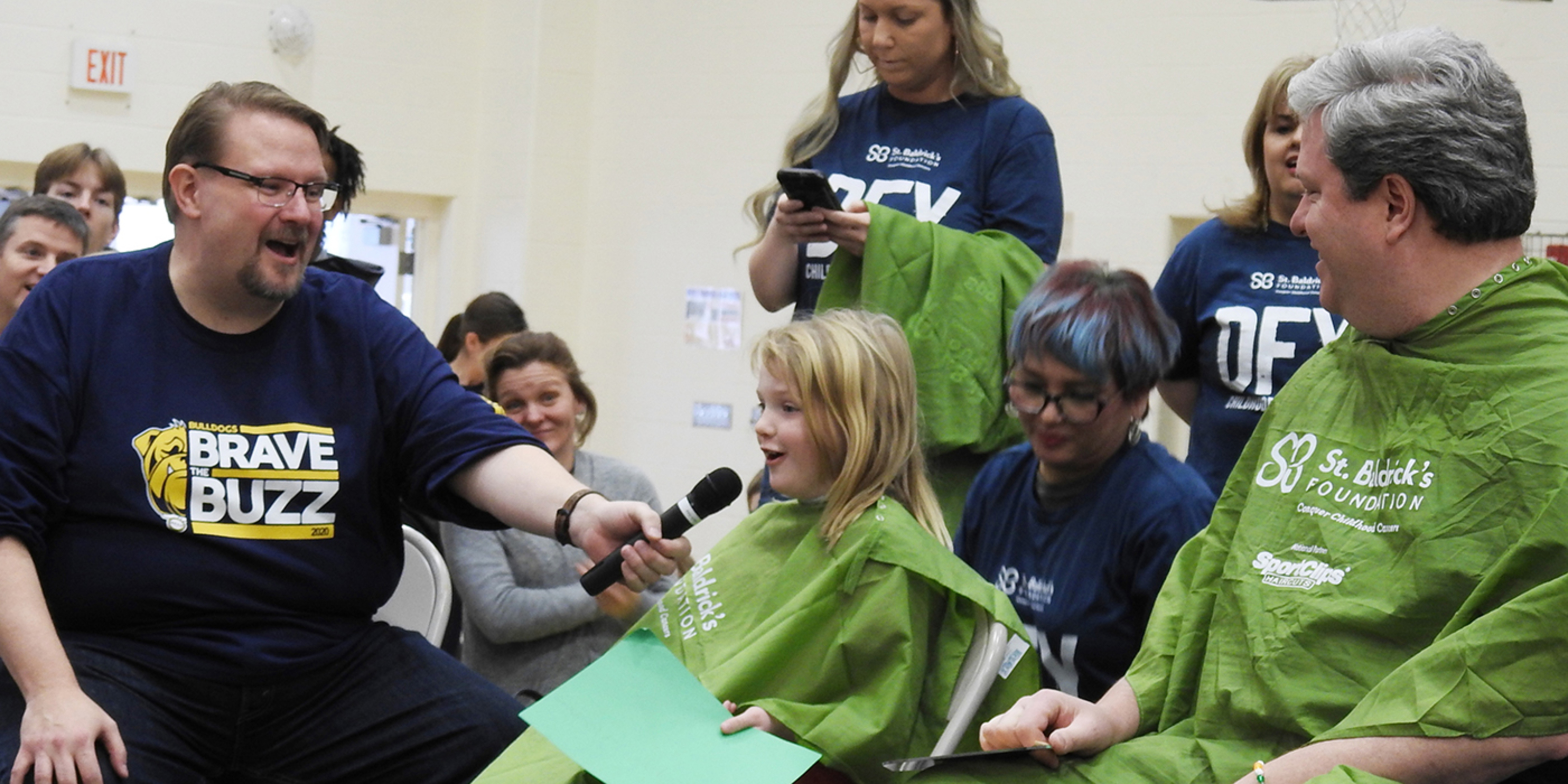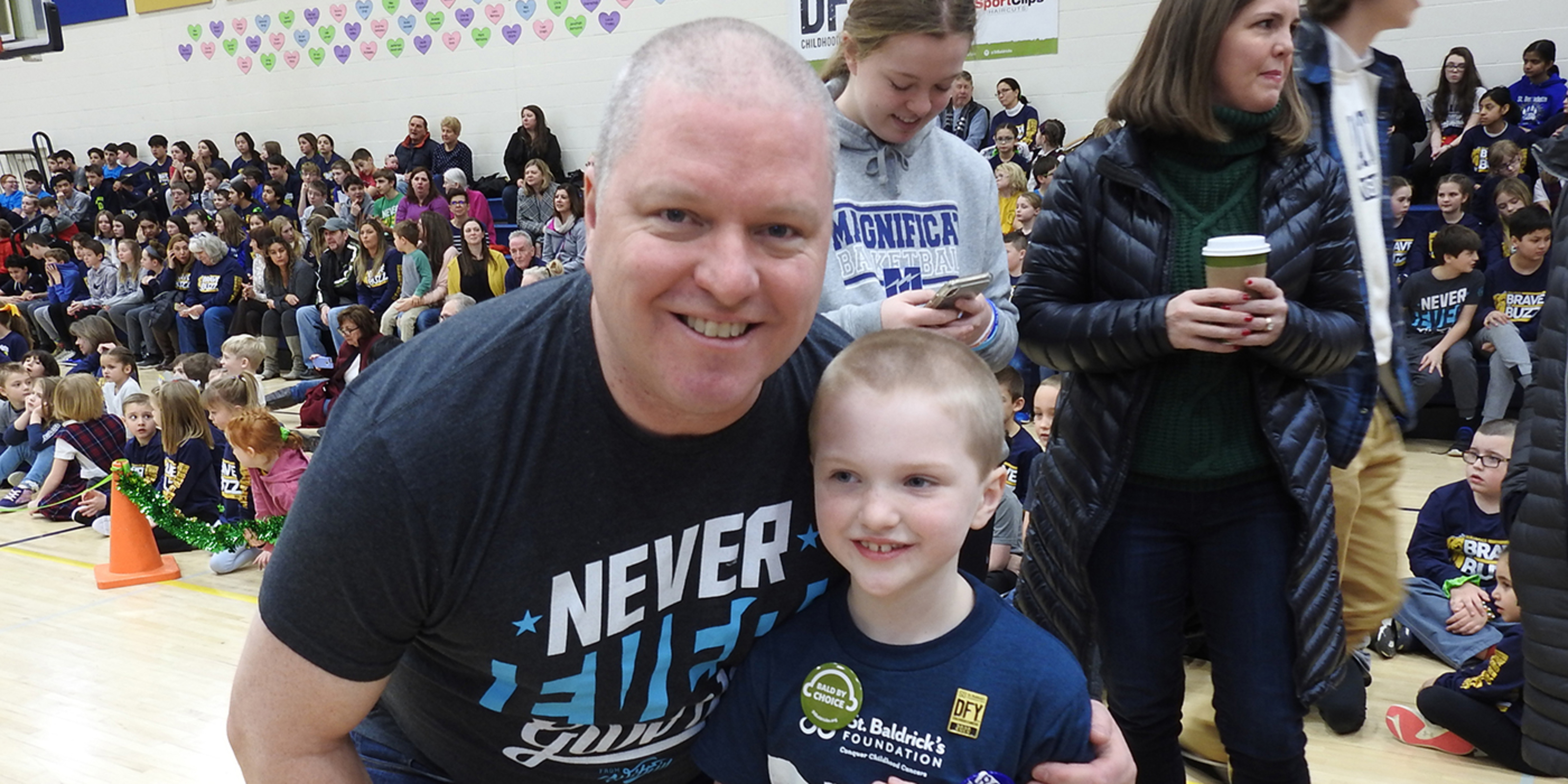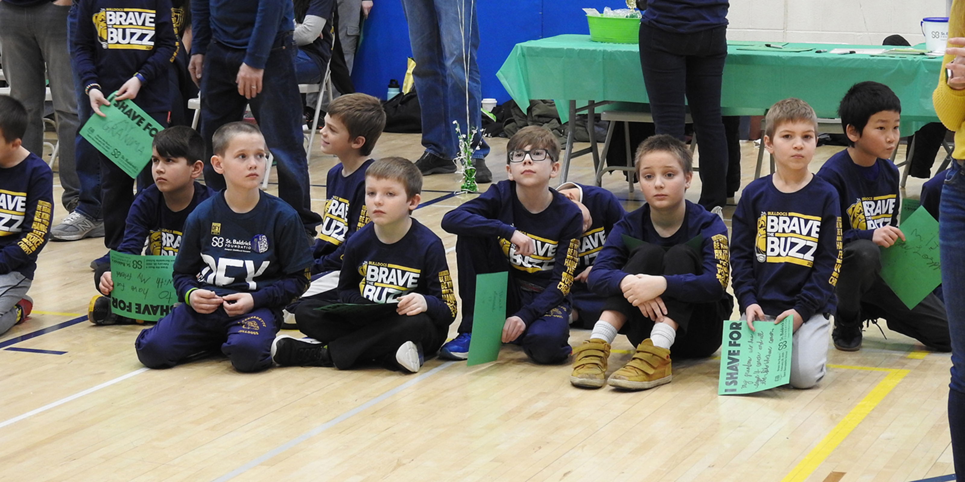 But it was a different story in the school gym where the school’s nearly 500 students, teachers, many parents and other supporters gathered for Brave the Buzz 4. Many were wearing navy blue and gold BB4 T-shirts, one way to support the event that raised funds for the St. Baldrick’s Foundation, a nonprofit organization that supports childhood cancer research.