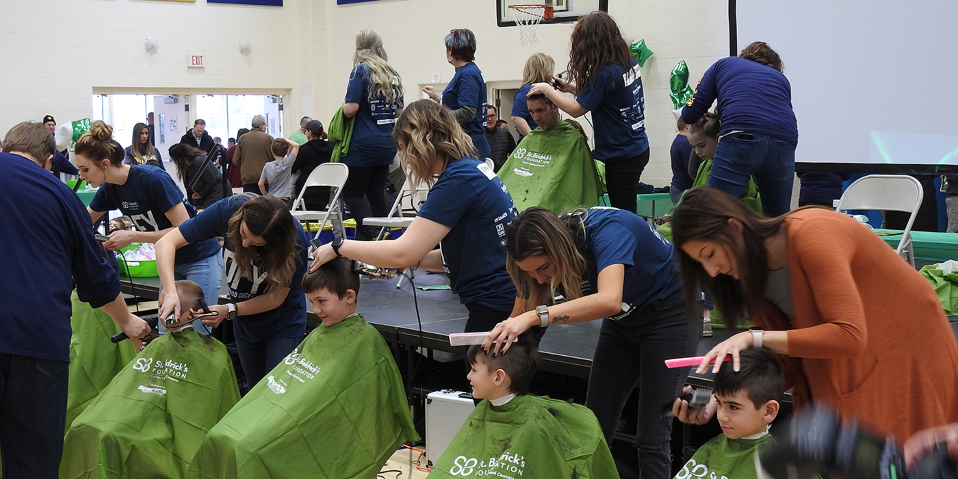 Dozens of volunteers assisted with the event, including many parents and staff members at the school The Buzz 4 Core Committee included Mary Sue Anders, lead organizer and treasurer; Debbie Chinchar, treasurer; Mary Beth Sullivan, shavee recruiter; Mandy Sinchak, barber coordinator; and Jen Niehaus, volunteer coordinator. Students and parent volunteers helped sweep hair up after each group of shaves. They also helped sell “Lucky Charms” after weekend Masses, distributed posters and brochures throughout the community, greeted guests at the event, distributed T-shirts, helped coordinate shaves, speakers, activities and other functions at the event and coordinated and cleaned up refreshments and lunch.