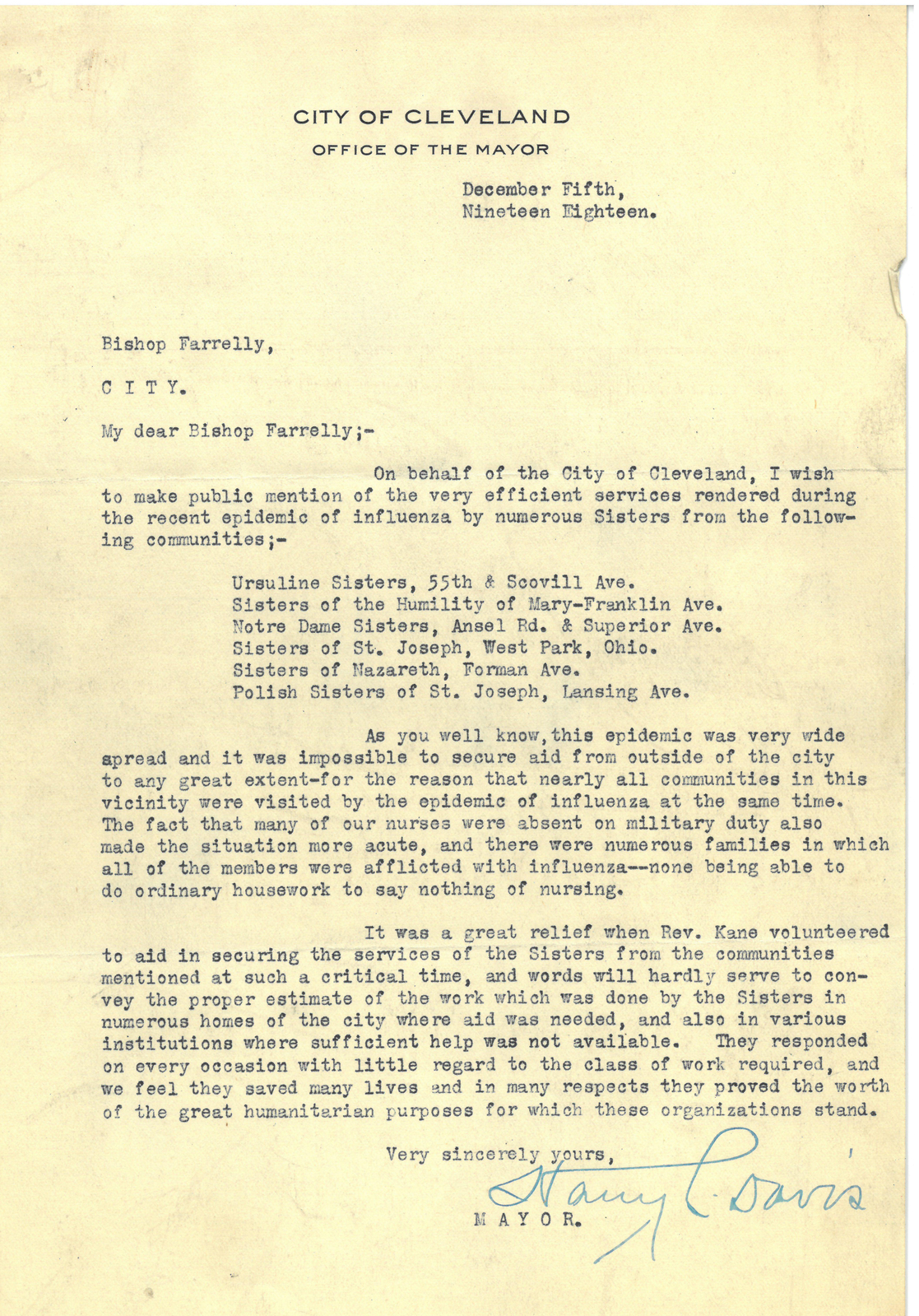 And when the worst of it was over in December 1918, Mayor Davis penned a letter to Bishop Farrelly thanking him and the local Church for their assistance and support. He specifically called attention to the efforts of the following orders of religious sisters: the Ursulines, Sisters of the Humility of Mary, Notre Dame Sisters, Sisters of Nazareth and Polish Sisters of St. Joseph, all in the city of Cleveland, and the Sisters of St. Joseph in West Park (which at that time was a separate city before its annexation to Cleveland).