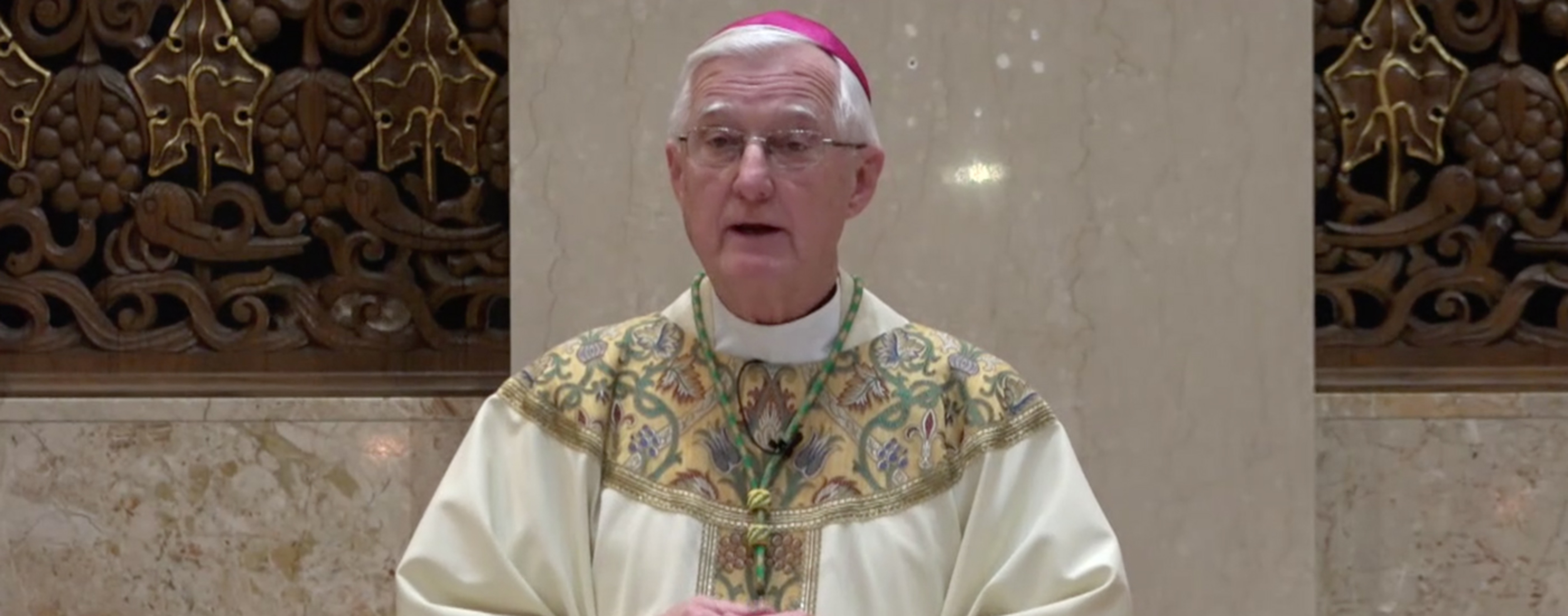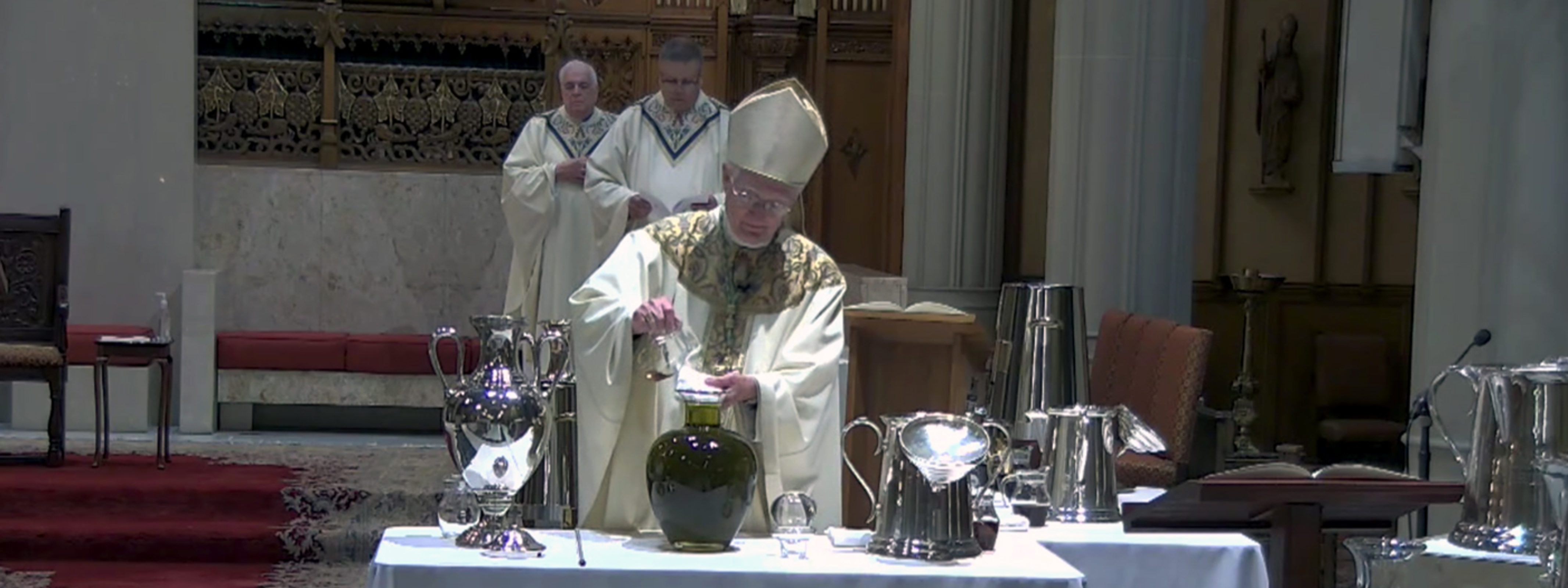 Bishop Martin Amos, retired bishop of Davenport, Iowa and a former priest of the Catholic Diocese of Cleveland, celebrated a private, livestreamed chrism Mass on April 7 from the empty Cathedral of St. John the Evangelist in downtown Cleveland. Faithful from across the eight-county Catholic Diocese of Cleveland – and beyond – saw the liturgy live while others watched it later on the diocesan website.