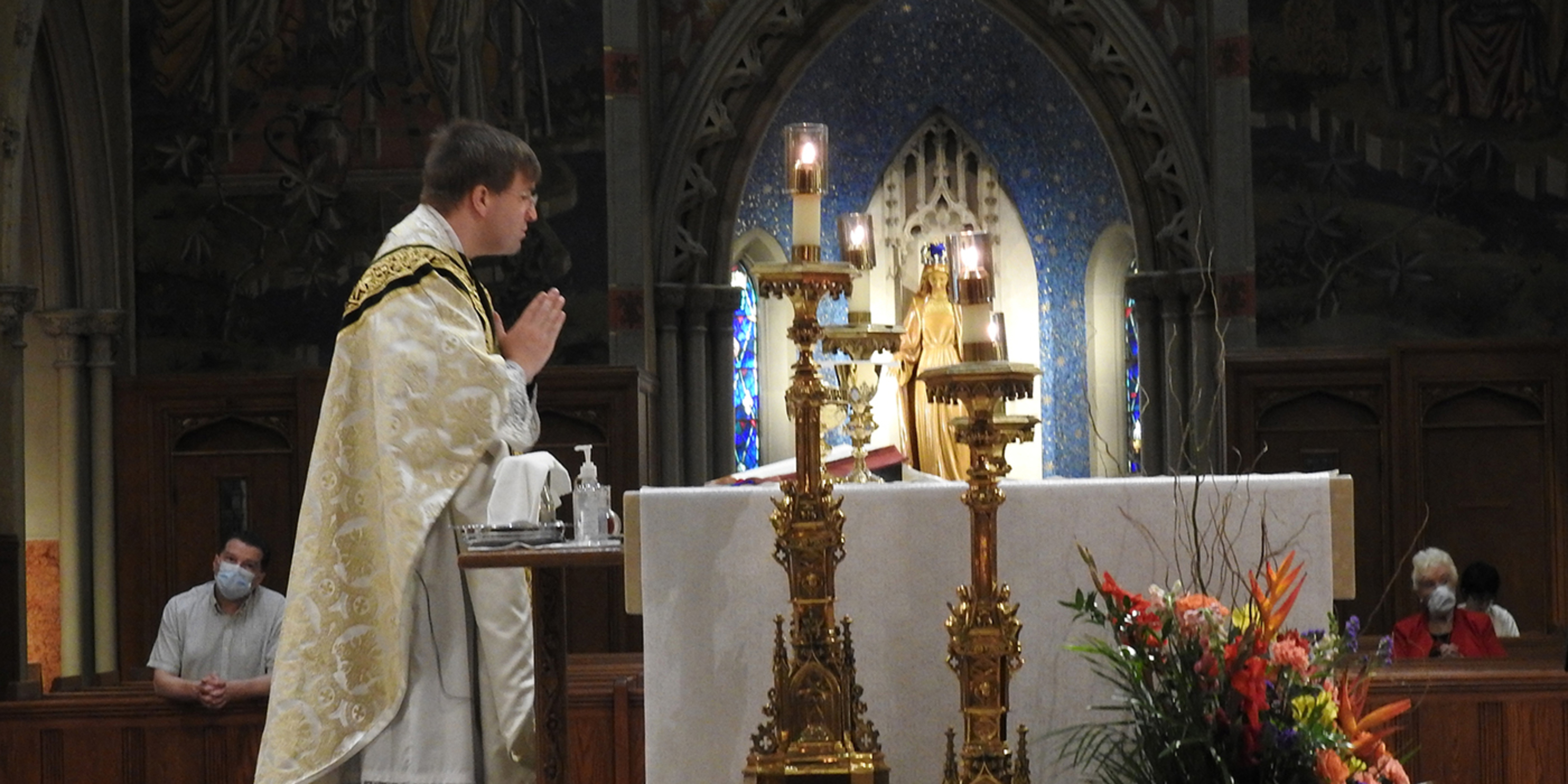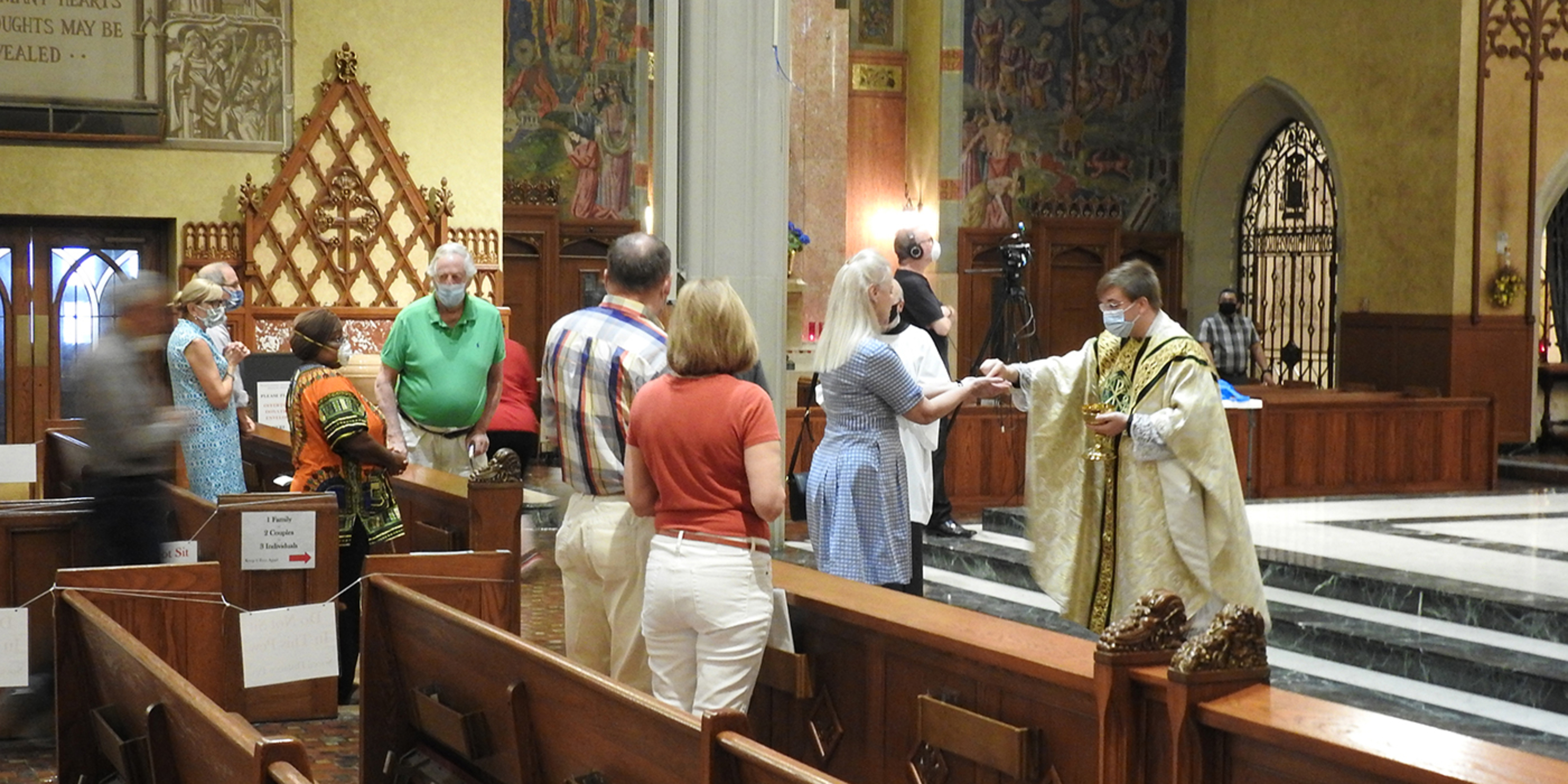 Welcome back,” Father Sean Ralph said to the nearly 60 people who attended the 9:30 a.m. Mass on Memorial Day at the Cathedral of St. John the Evangelist in downtown Cleveland. It was the first Mass celebrated publicly at the cathedral since the suspension of public liturgies in March due to the coronavirus health crisis. “I am delighted to be here with you to celebrate the most important thing we do,” he added. Father Ralph is cathedral rector.