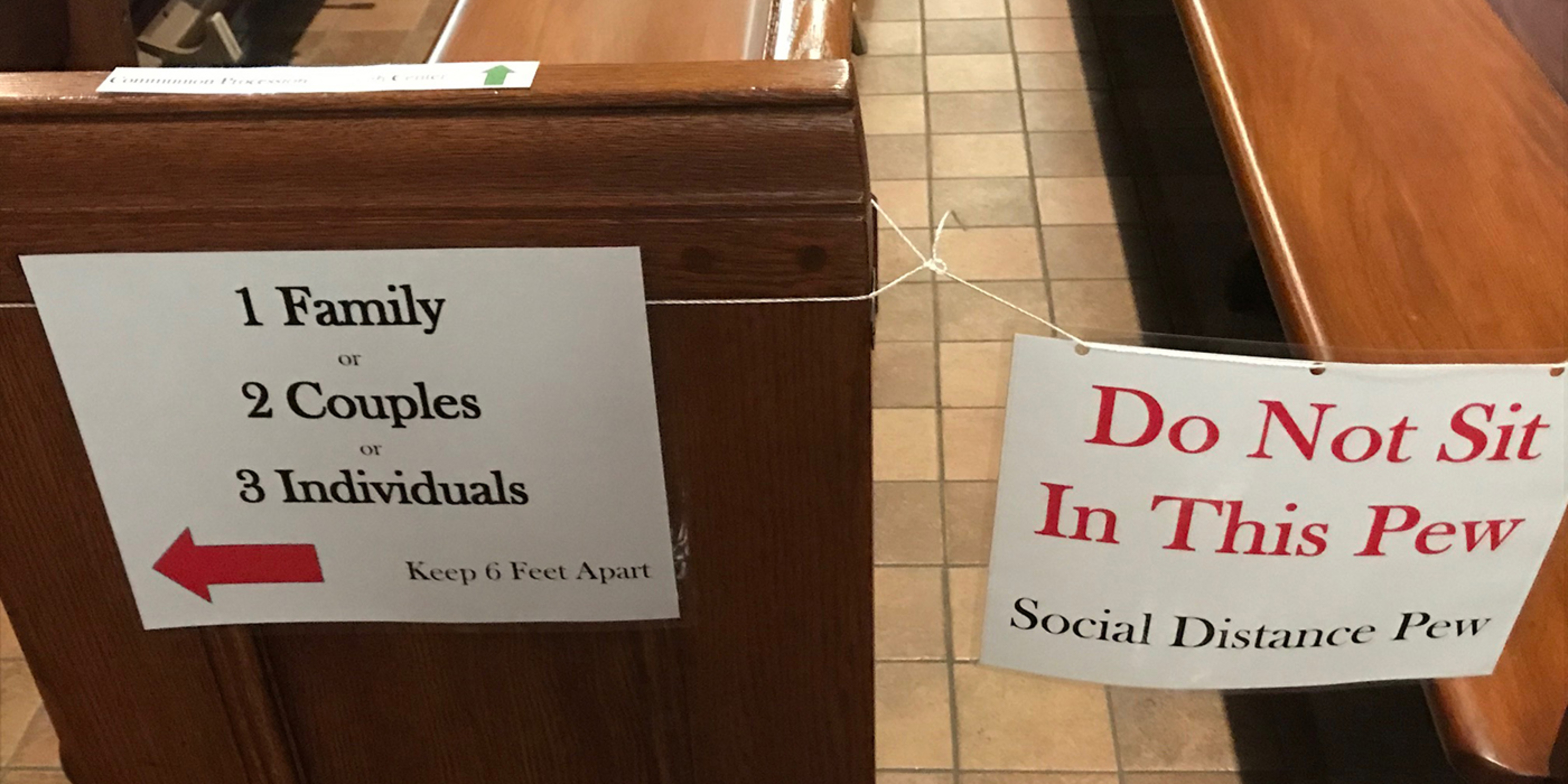 Social distancing is the rule inside the church with every third pew available for seating. Signs remind the faithful that only one family, two couples or three individuals should sit in any open pew.