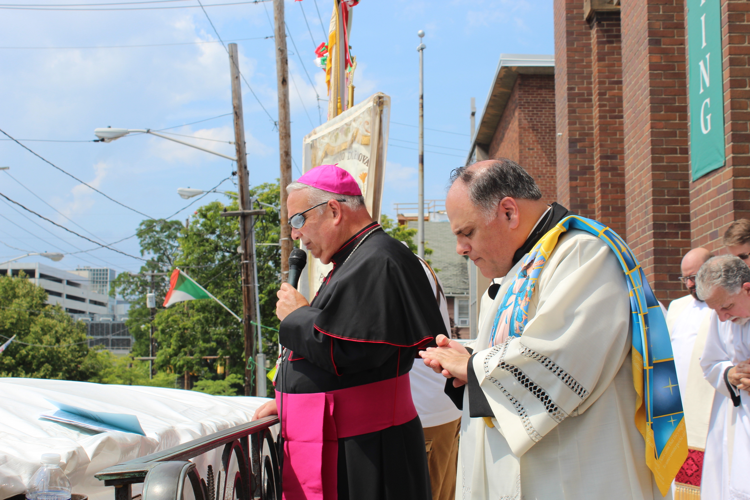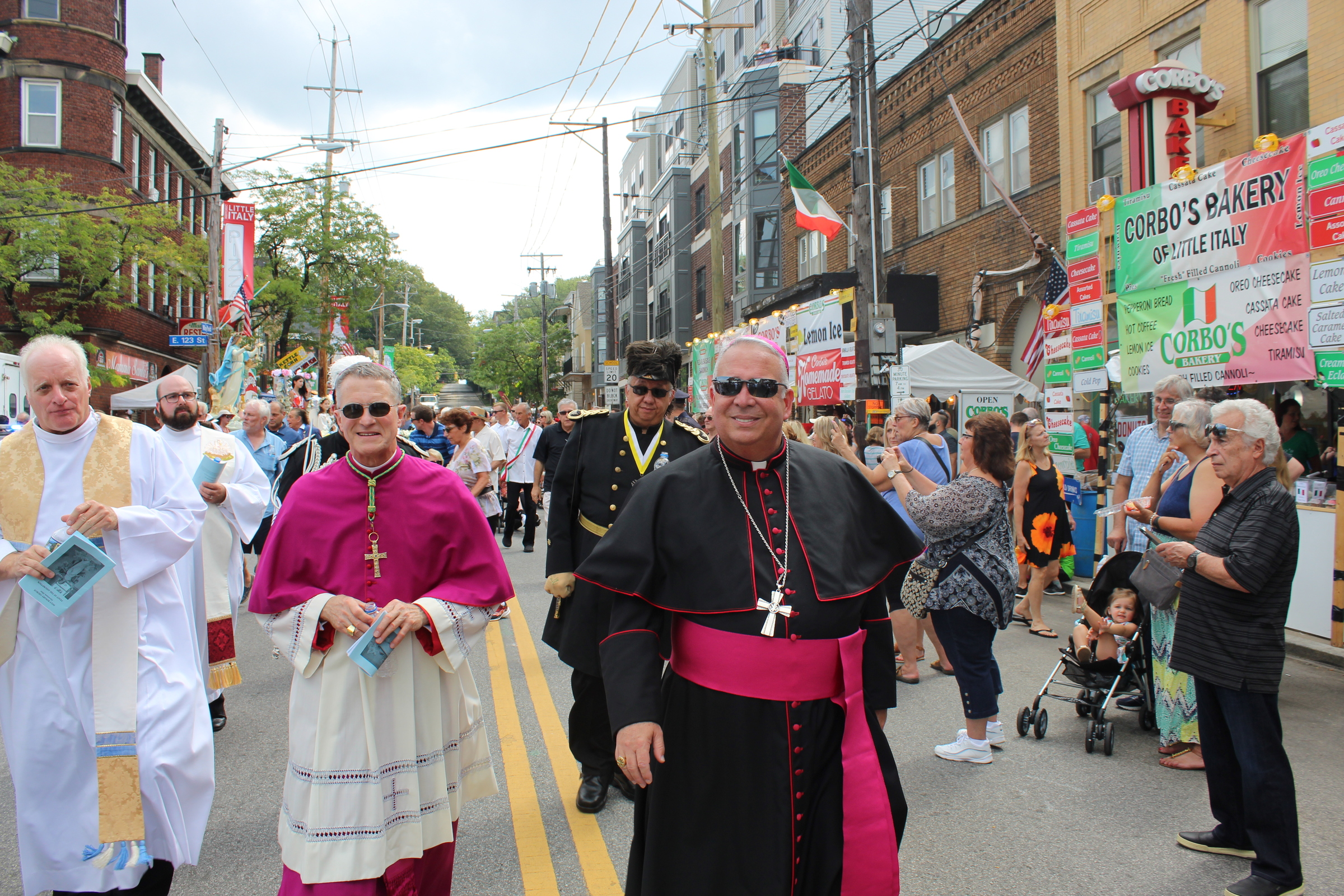 After Mass, a procession including hundreds of people moves through the neighborhood while participants, many in native dress from various regions of Italy, members of the clergy, community and parish organizations sing and pray. Focal point of the procession is a statue of the Blessed Mother. After the procession, the statue is returned to a special shrine area on the east side of the church where the faithful can light votive candles and pray throughout the festival.