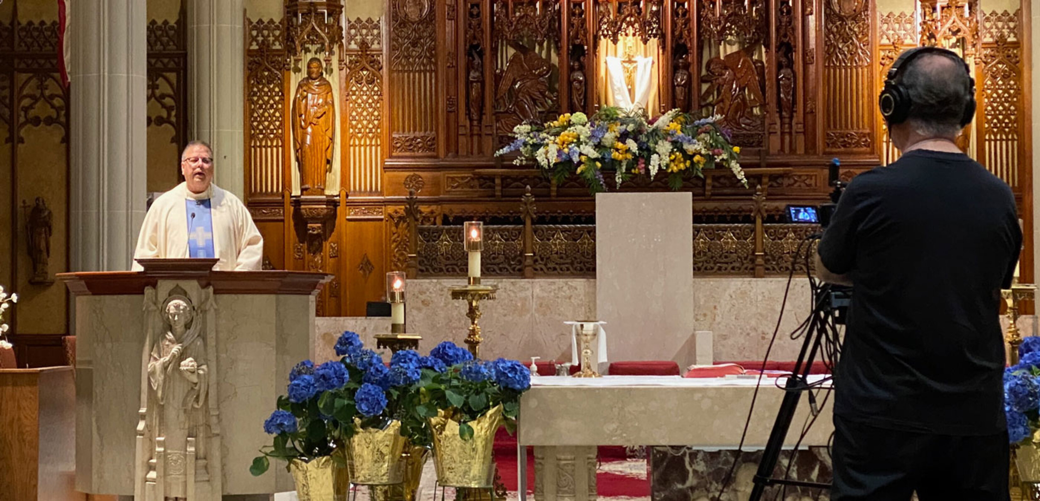 Staff members from the diocesan Communications Department record the Sunday TV Mass and livestream liturgies daily -- except for Saturday – with a portable video cameras in the cathedral.