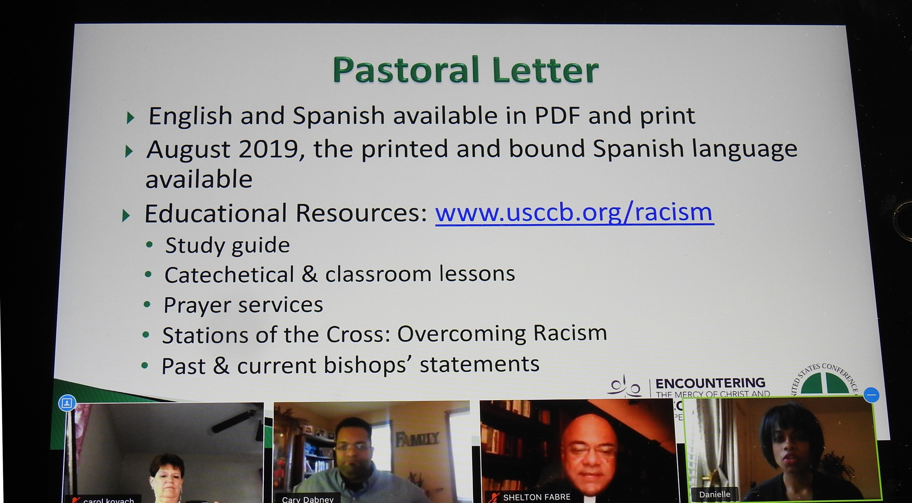Dabney said the July 1 session was recorded so others could view it on the African American Ministry’s YouTube channel. A link is available in the resource section on the AAM page. It is one of several dozen resources that have been added to the page in recent weeks. Dabney said there are resources for parents, articles to read, videos to watch, books to read, articles from Catholic media and webinars to watch, as well as statements and articles from the USCCB on the topic of racism.