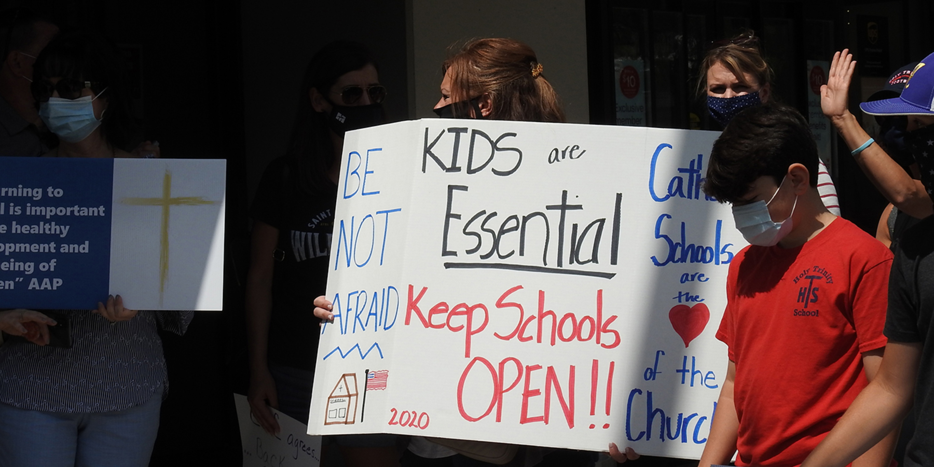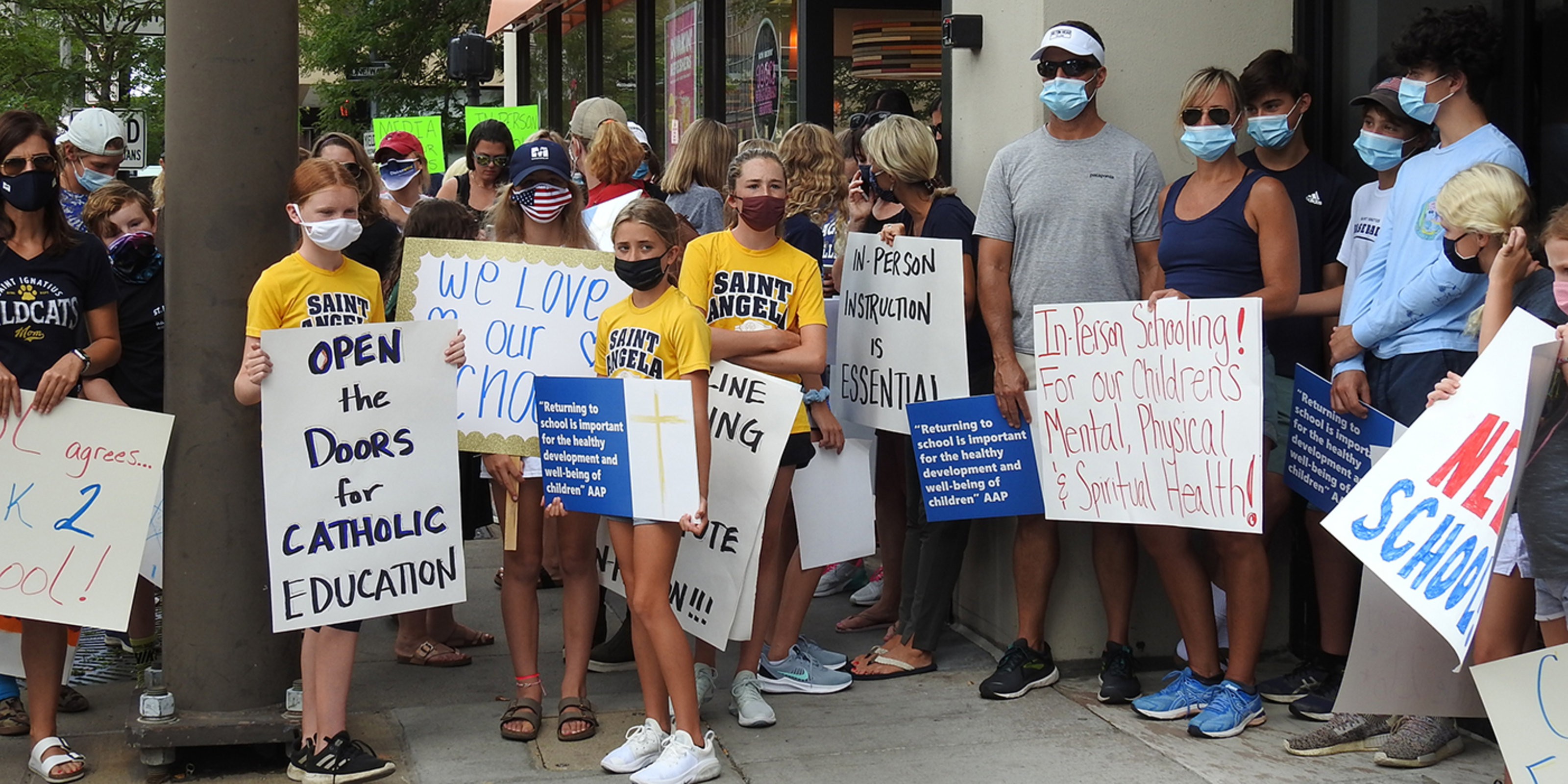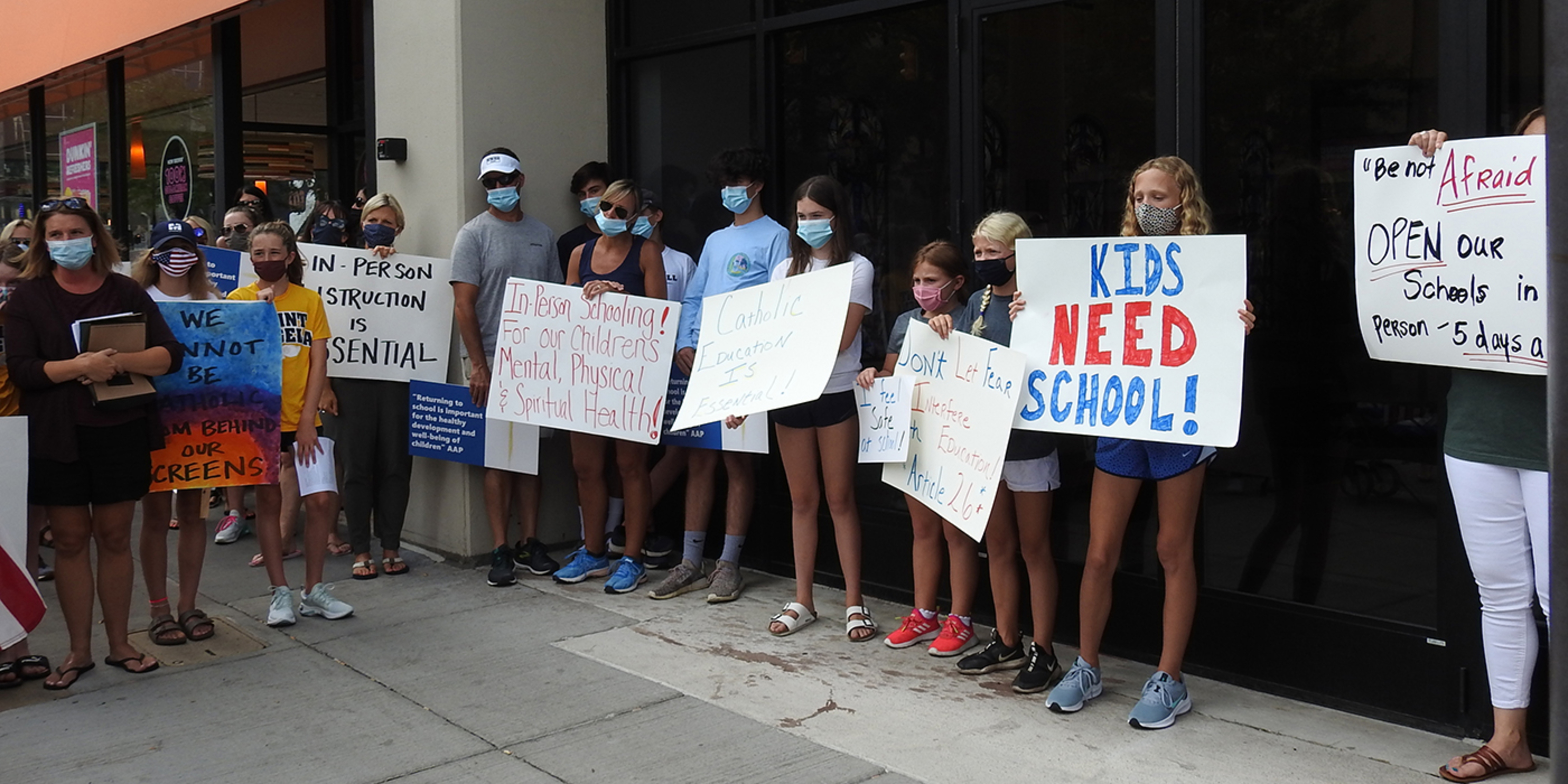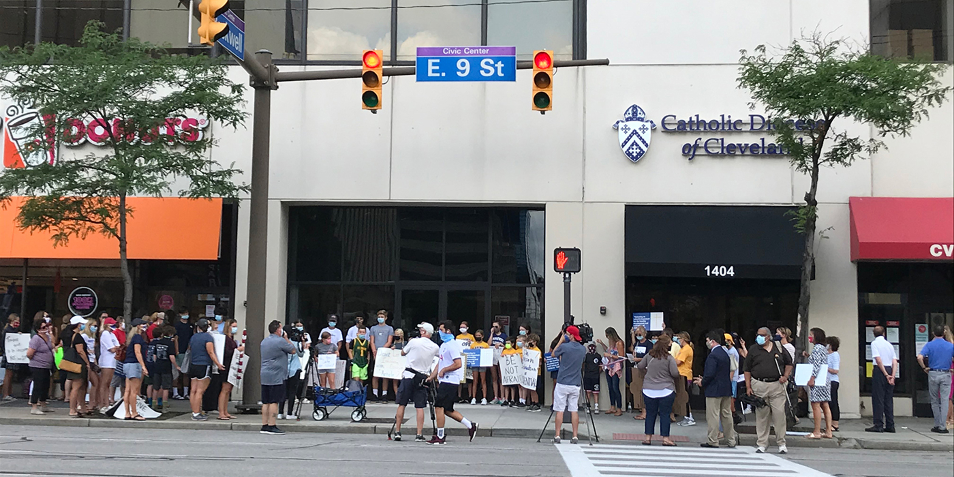 About 75 people – mainly parents and students -- gathered on the sidewalk outside Cathedral Square Plaza on East Ninth Street in downtown Cleveland. The group was respectful. They wore face masks and many carried signs with messages such as “Be not afraid – Open our schools in person 5 days a week,” “Keep our Catholic schools open,” “In-person instruction is essential,” “Jesus taught in person – so can we,” “Kids need school,” “We love our schools,” “Being in school is a matter of social justice” and “Catholic schools are the heart of the Church.”