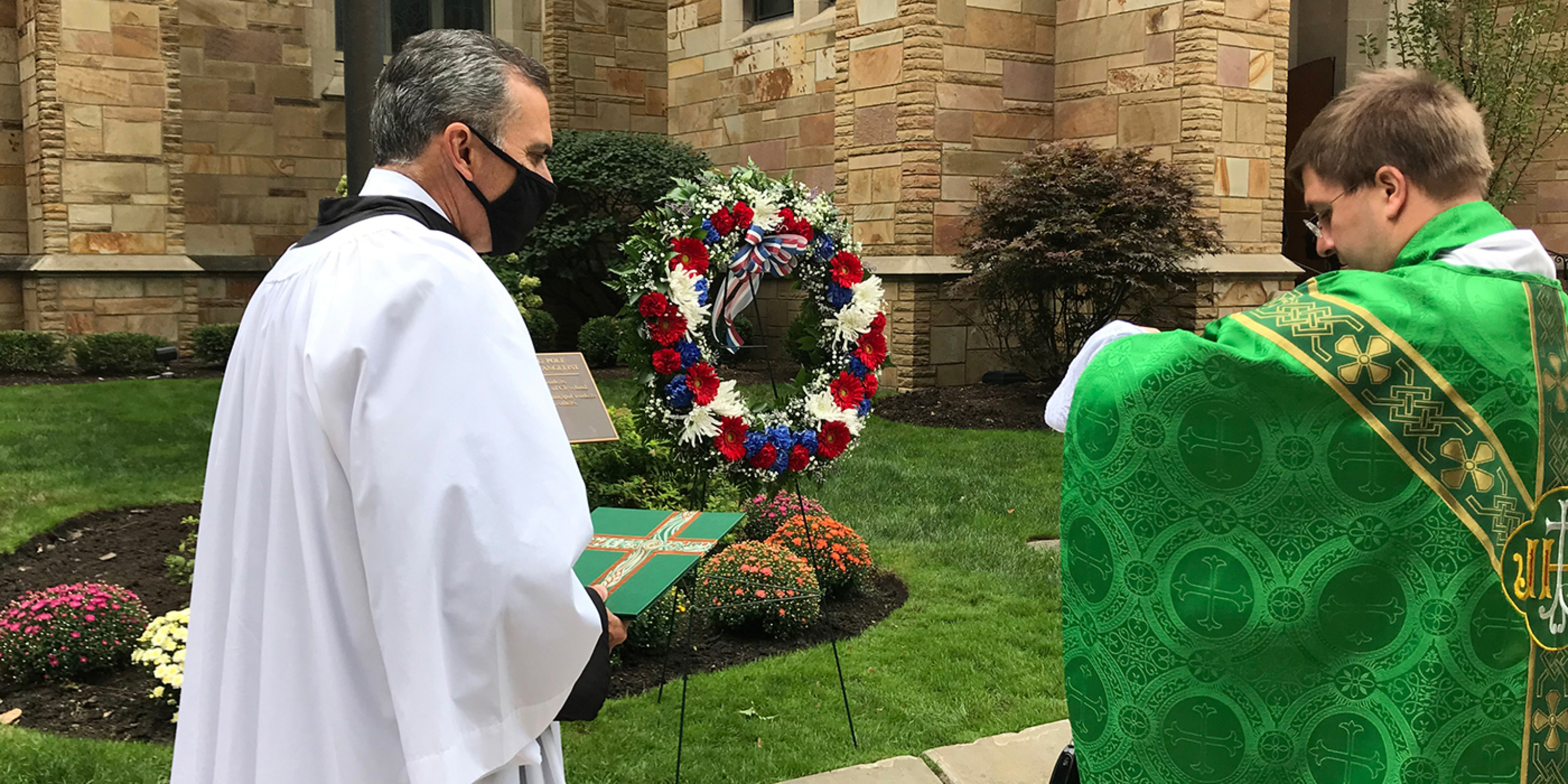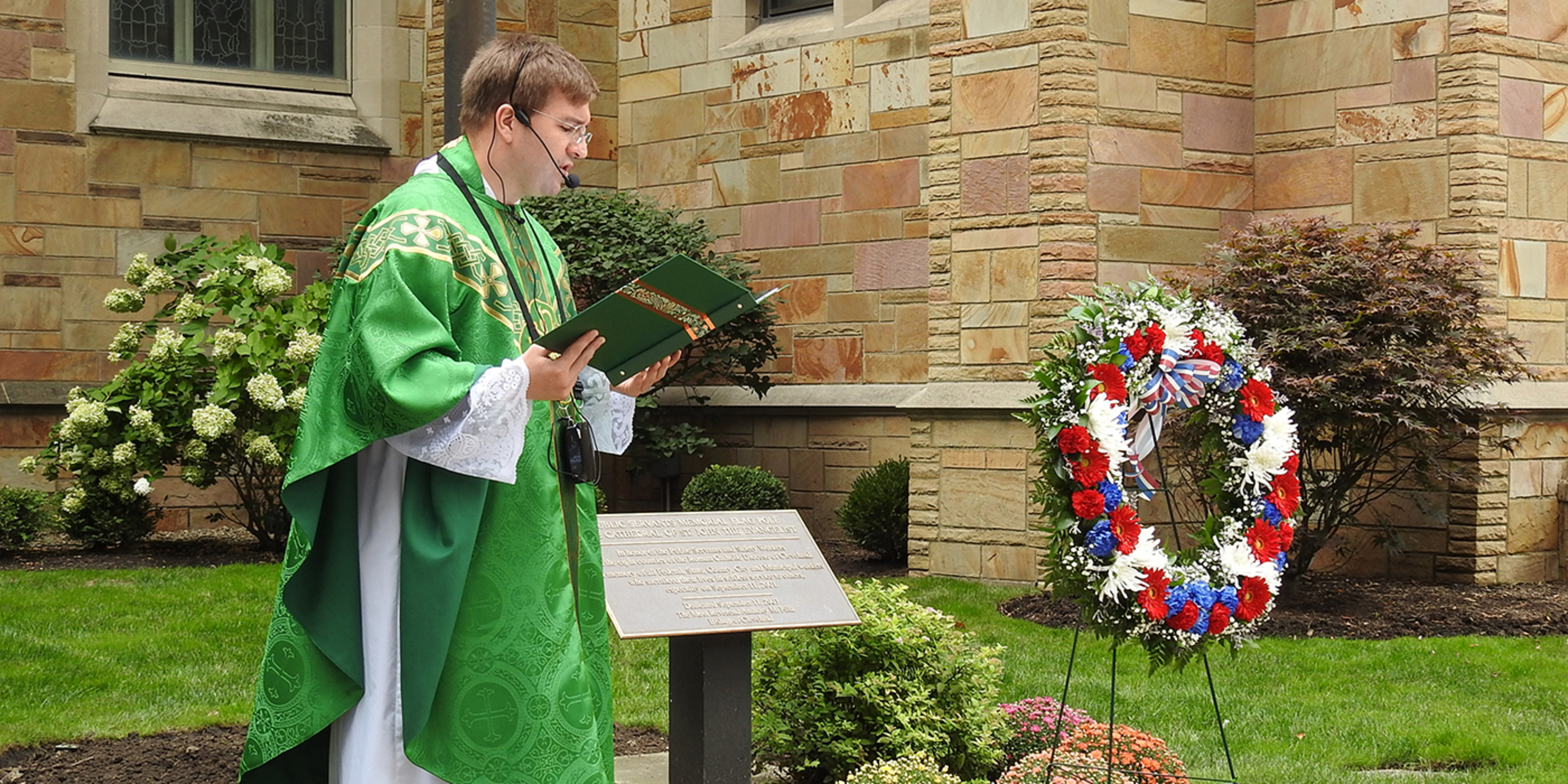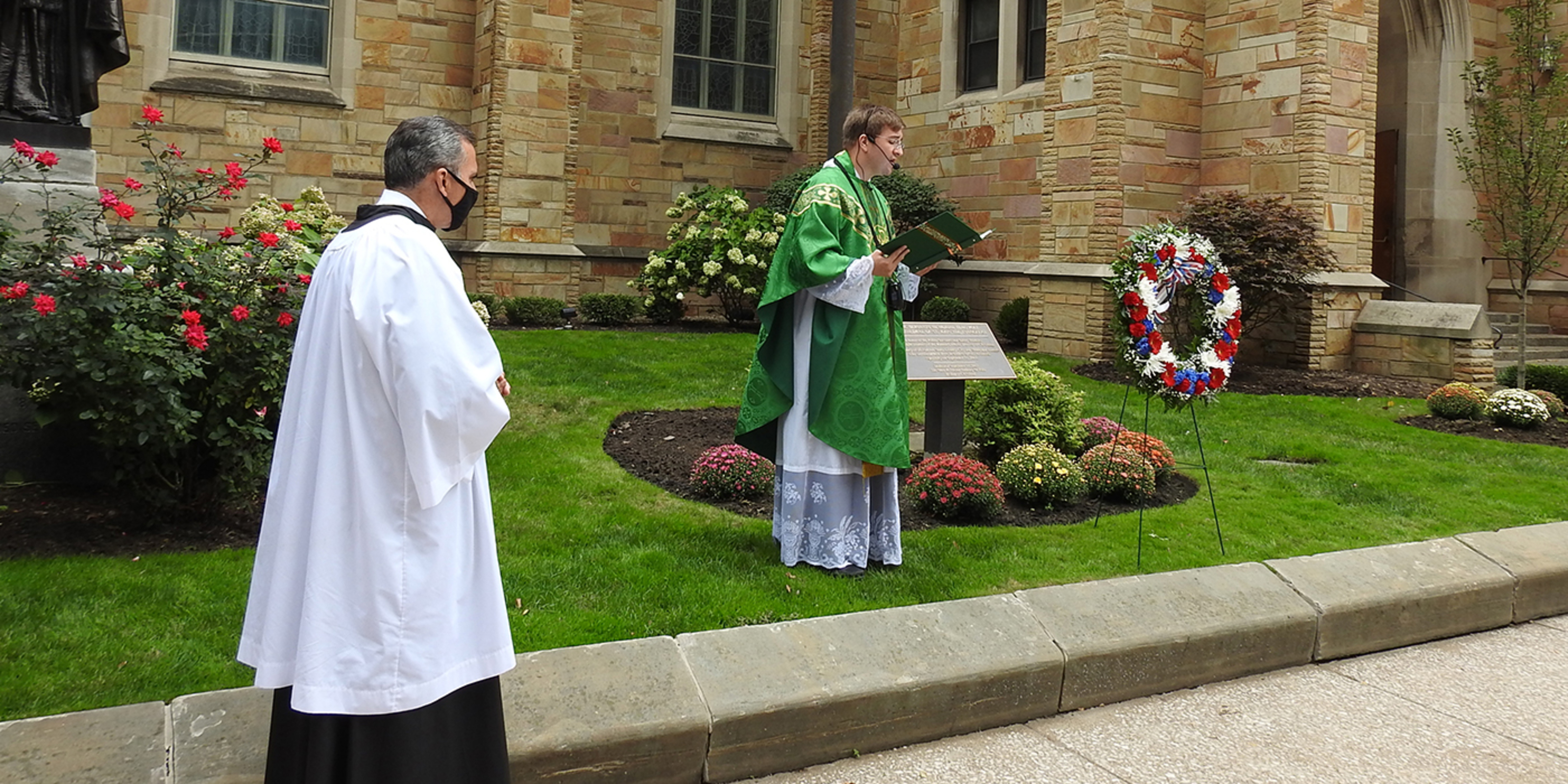 Each Sept. 11, a prayer service is conducted and a wreath is placed next to the flag pole, which was dedicated by Bishop emeritus Anthony Pilla on Sept. 11, 2003. The prayer service remembers those who died in the Sept. 11, 2001 terrorist attacks on the twin towers of the World Trade Center in New York City, at the Pentagon in Washington, D.C. and on Flight 93, the plane that crashed into a field near Shanksville, Pennsylvania.