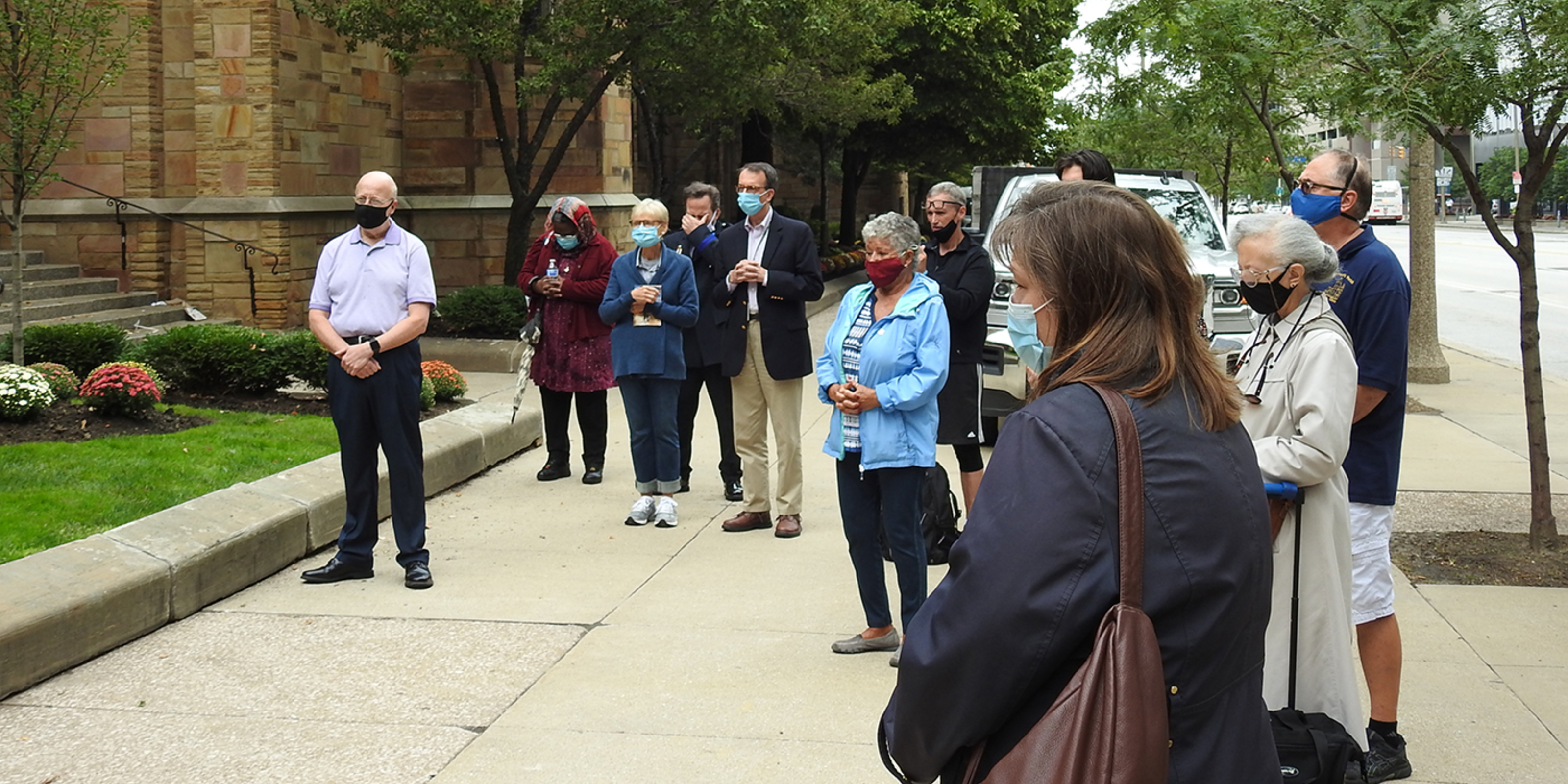 Father Sean Ralph, rector of the Cathedral of St. John the Evangelist, presided at a brief prayer service after the noon Mass on Sept. 11 at the Public Servants Memorial Flag Pole on the south side (Superior Avenue) of the cathedral. A group of people gathered on the sidewalk near the flag pole to pray with him.