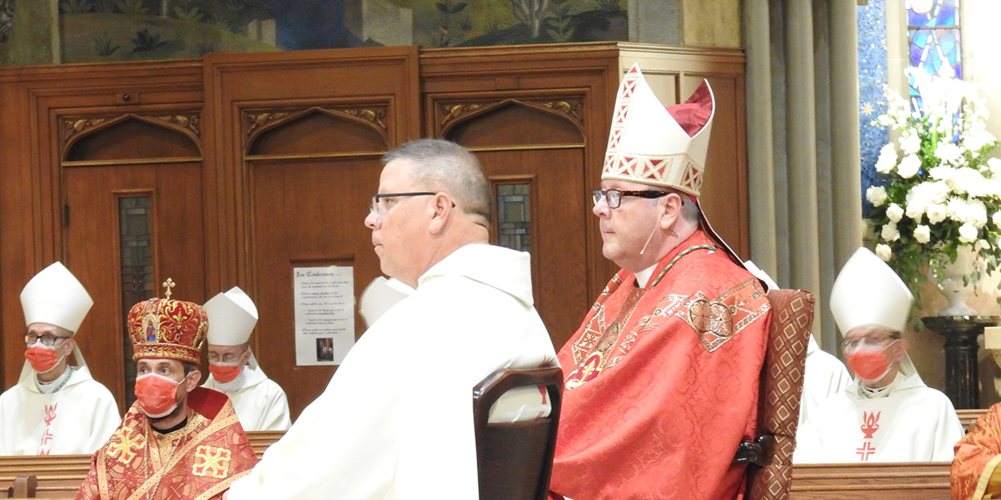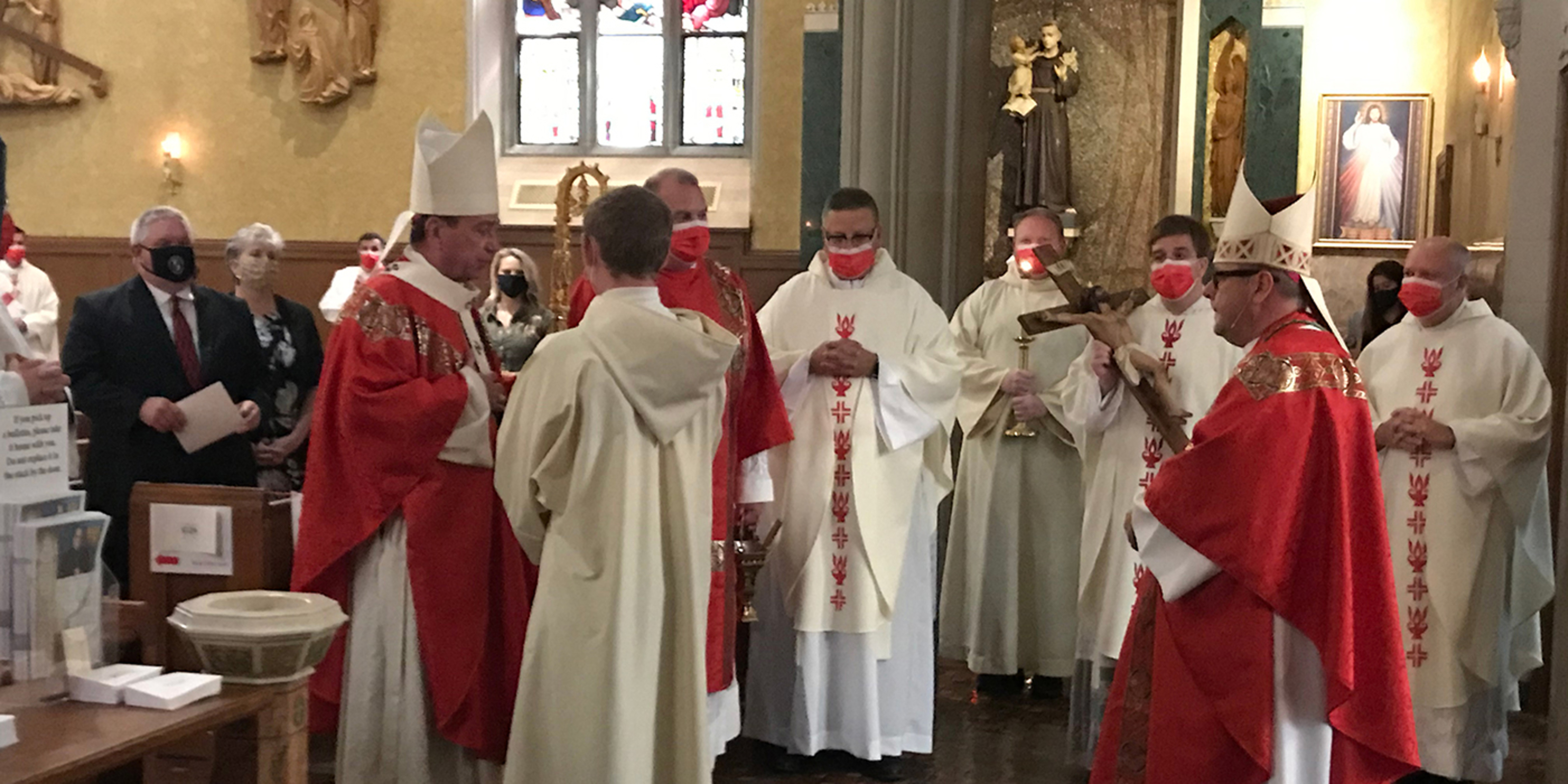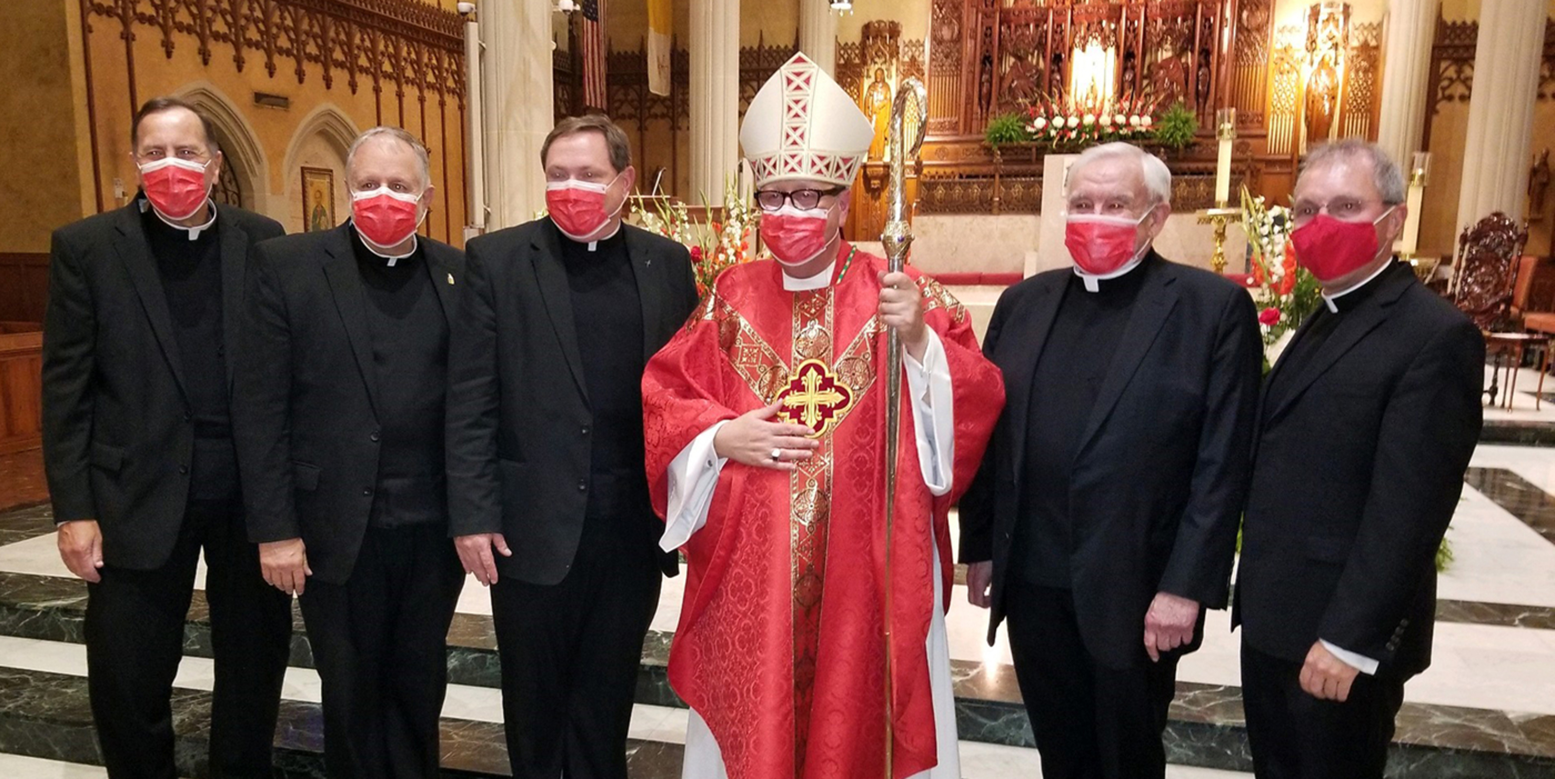 The pandemic precluded the traditional outdoor procession of clergy into the cathedral. Instead, they processed inside to their assigned, socially distanced seats. Attendees were provided with red face masks in keeping with the liturgical color of the day for the feast of the Exaltation of the Cross.