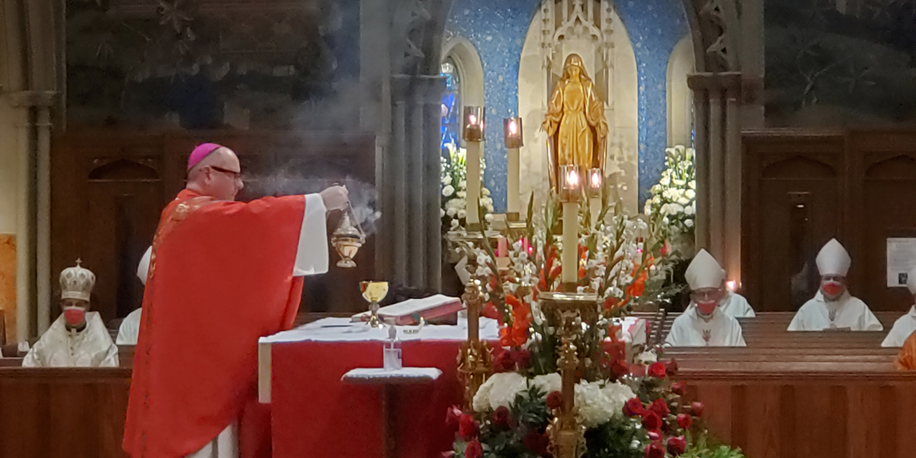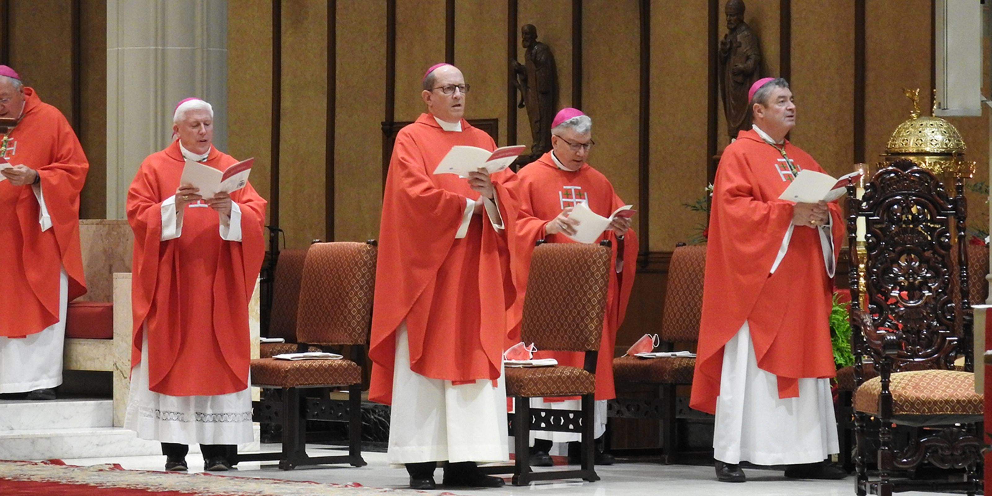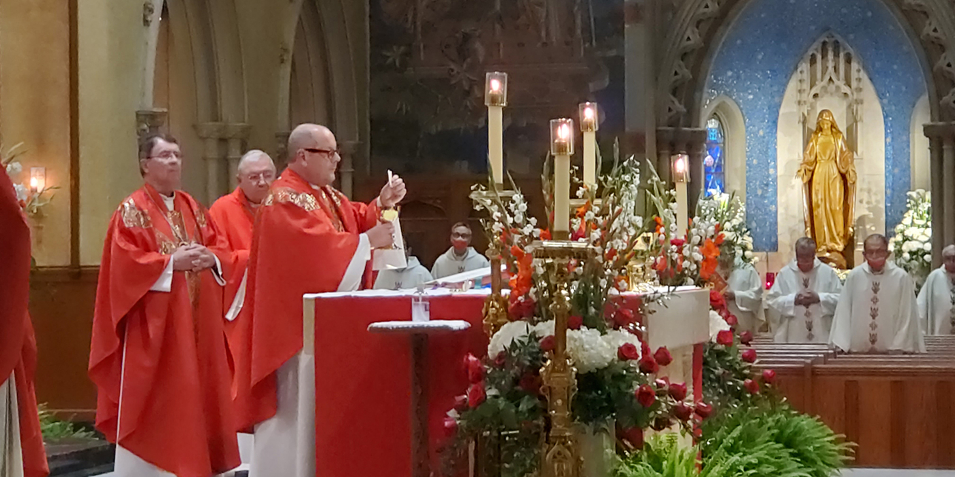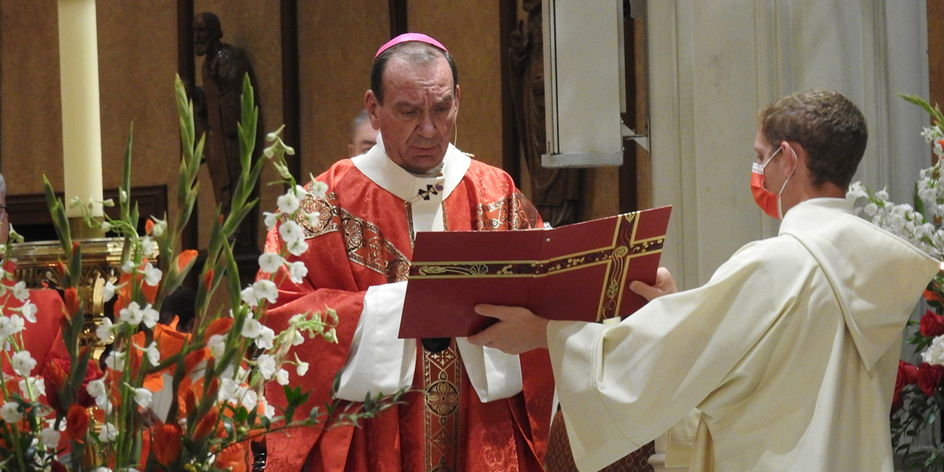 The pandemic precluded the traditional outdoor procession of clergy into the cathedral. Instead, they processed inside to their assigned, socially distanced seats. Attendees were provided with red face masks in keeping with the liturgical color of the day for the feast of the Exaltation of the Cross.