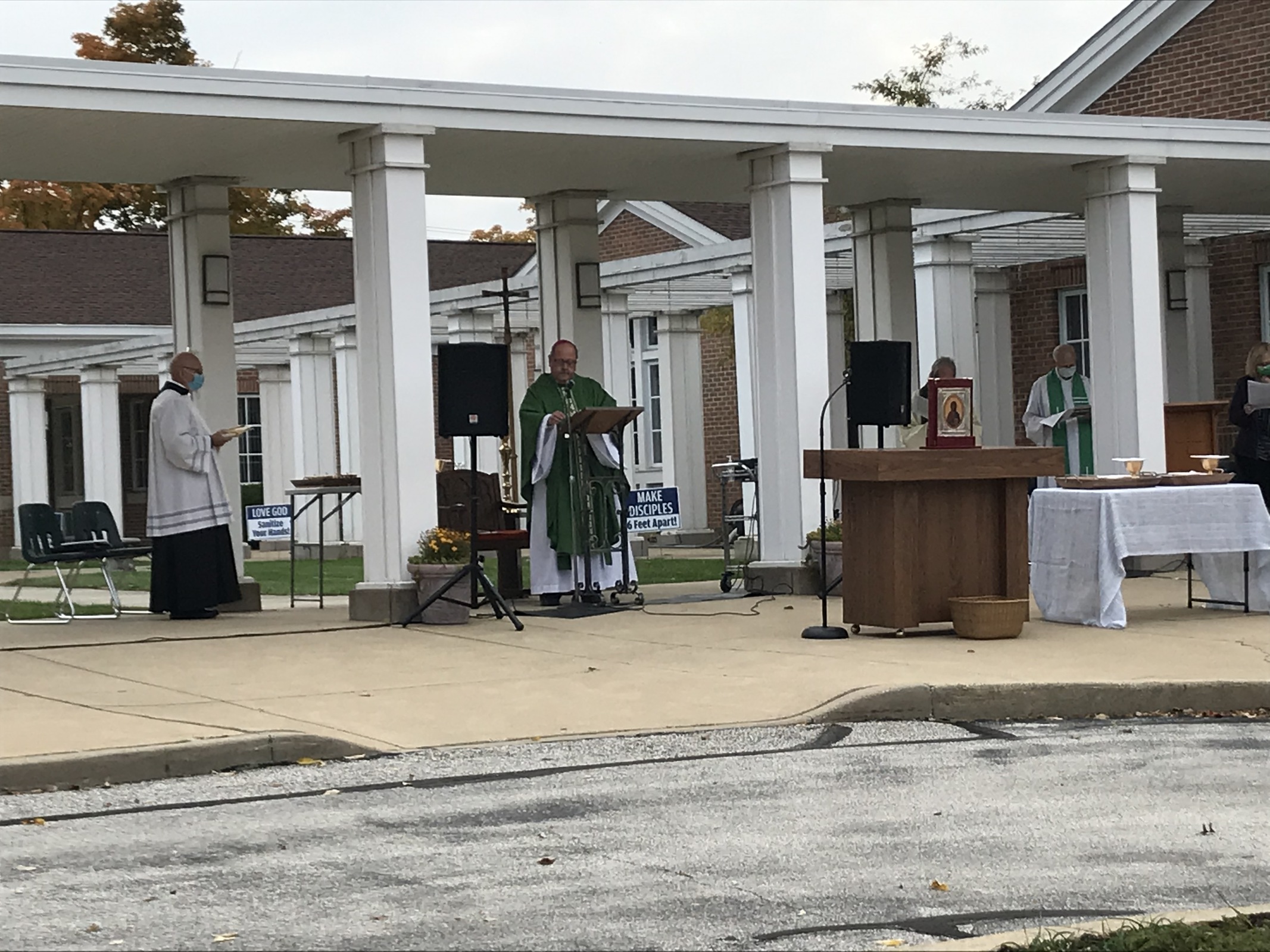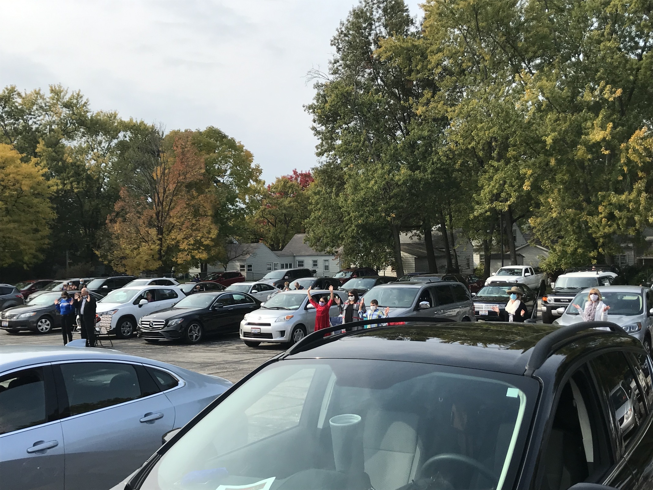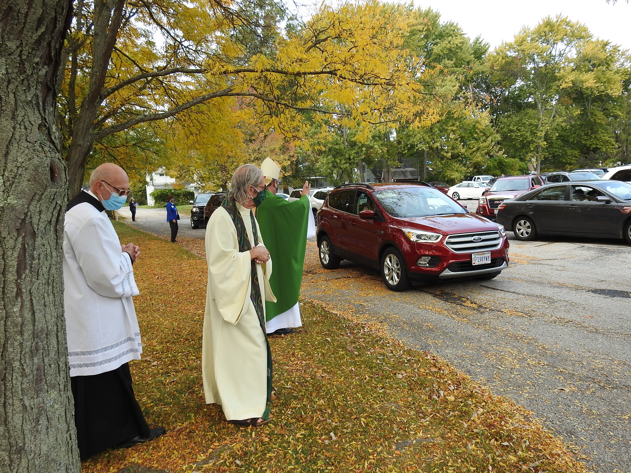 About 75 cars gathered on Oct. 11 in the parking lot of Our Lady of Victory Parish in Tallmadge for one of the parish's regular (weather permitting) 11 a.m. outdoor Masses. Skies were slightly overcast and the 60-degree temperature was fall-like, as were the colorful leaves. Some parishioners sat in lawn chairs while other stayed in their cars and prepared to listen to Mass on the radio.