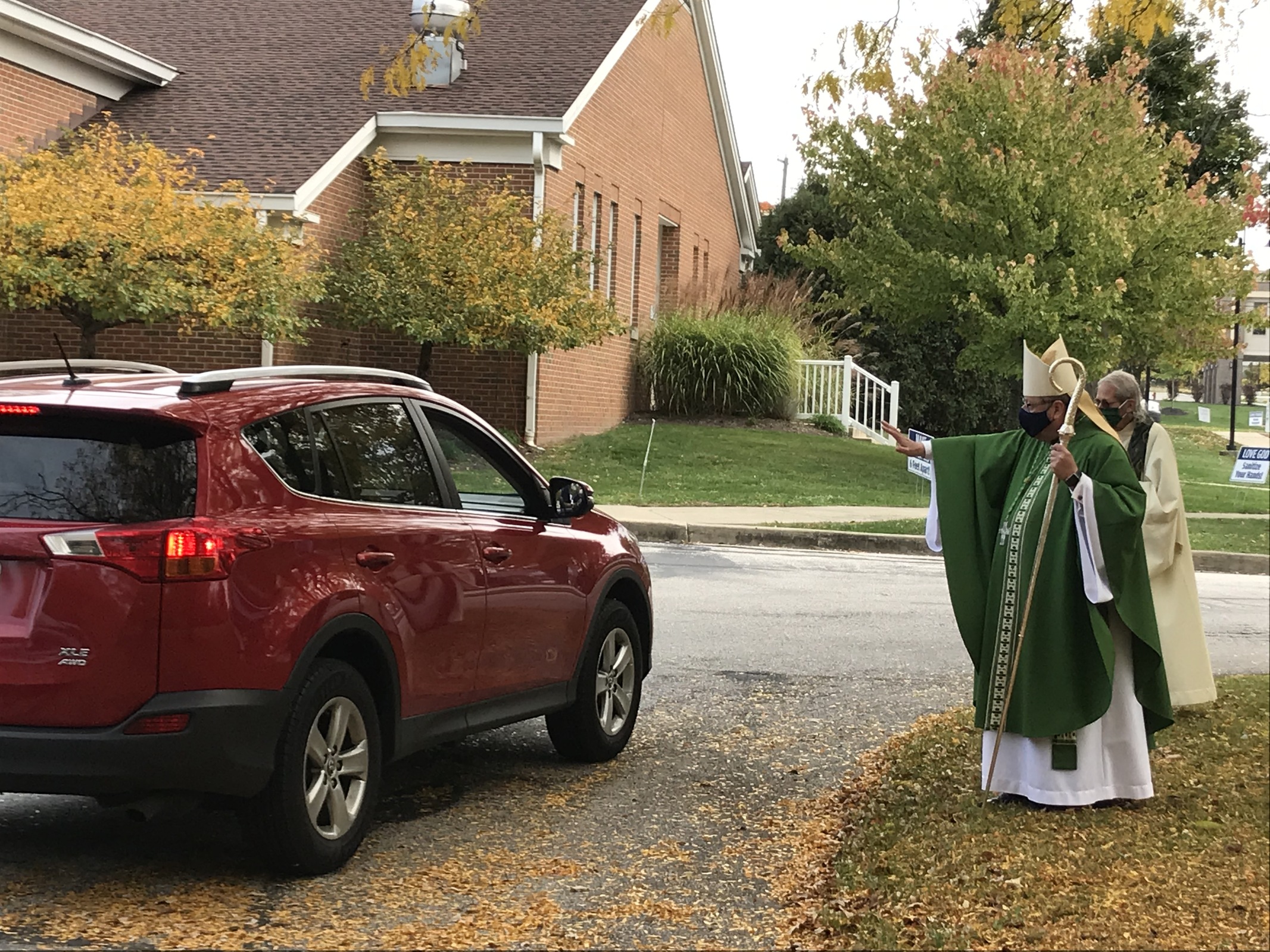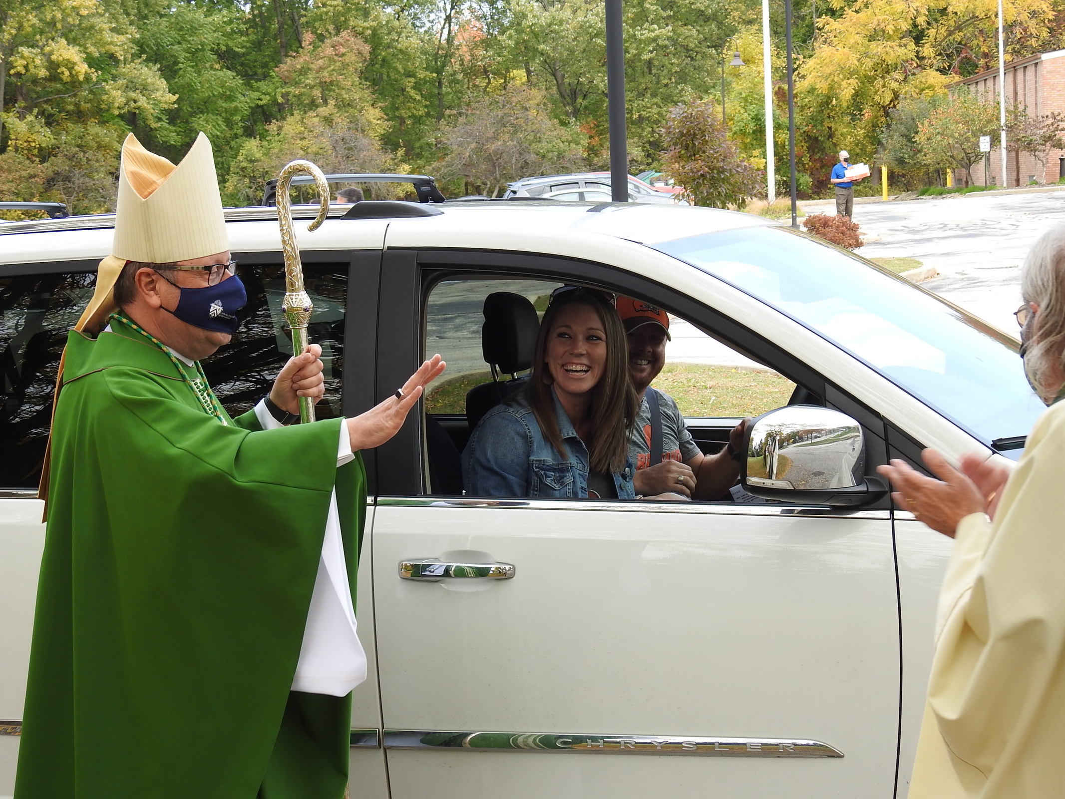 The bishop and Father Matusz greeted parishioners as the cars lined up to leave the parking lot. Several called out greetings and good wishes to the bishop, who waved back.