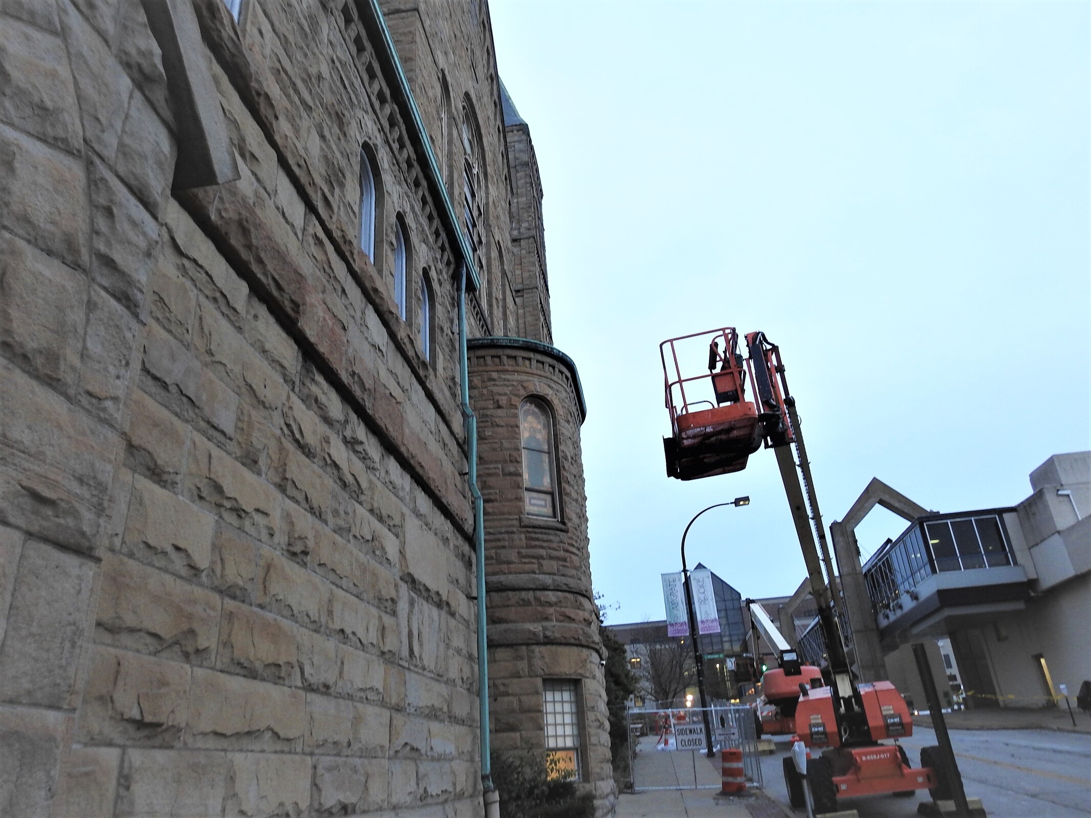 Father Zerucha said after the large stone fell in early 2019, a protective scaffold was erected around the base of the bell towers as a safety precaution. Other stones were temporarily secured until permanent repairs could be made. Structural engineers examined the bell towers, exterior stone walls and roof of the church and made recommendations on the needed work.