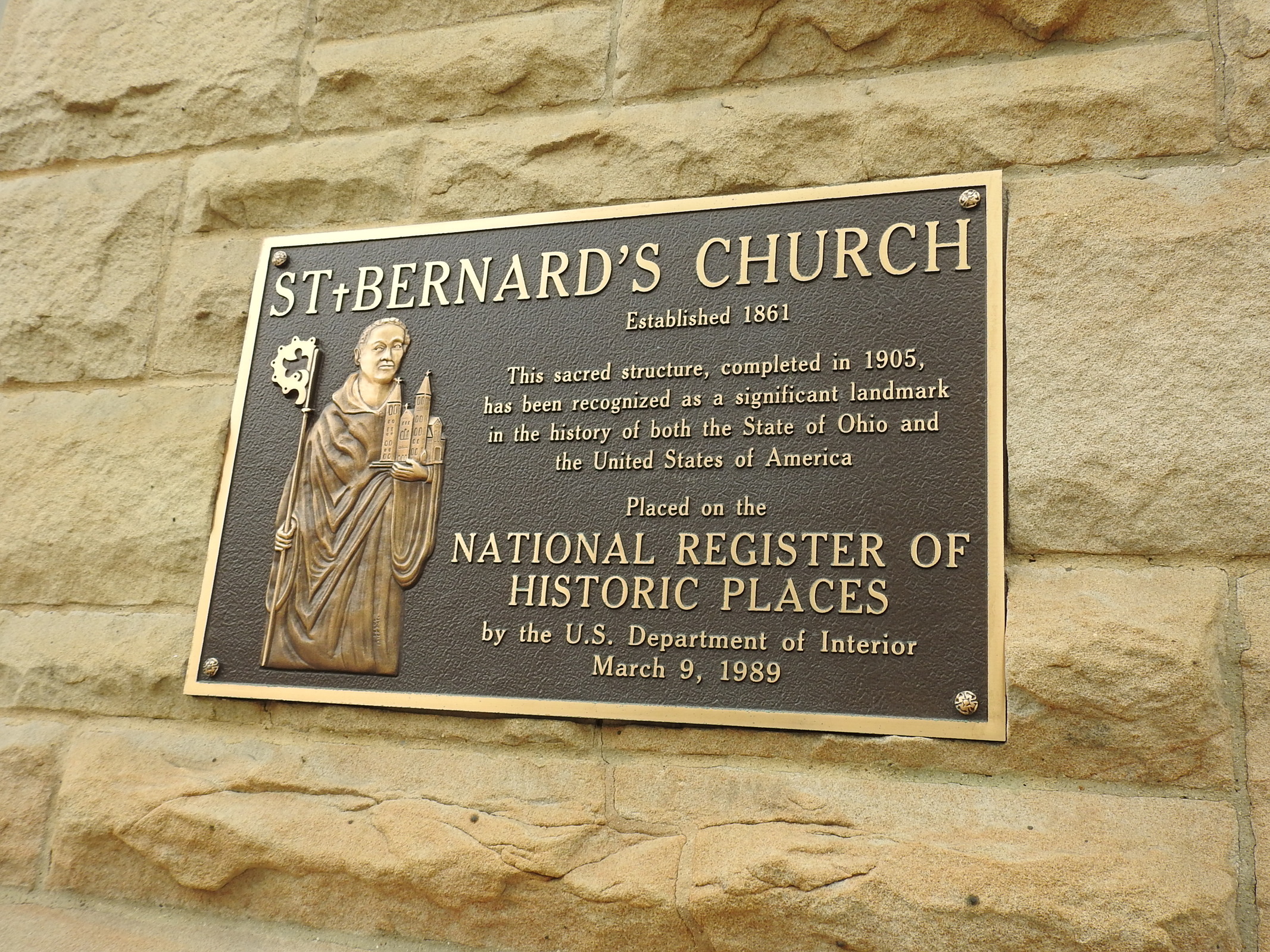 St. Bernard, a German-Romanesque structure with a Baroque influence, is patterned after many cathedrals in the Rhineland region of Europe. It reflects the Romanesque revival style with symmetrical massing, monochromatic stone and many round and semi-circular arches. The twin bell towers, each with five string courses, are typical elements of this architectural style, as are the recessed windows and random courses of the rock-faced exterior walls.