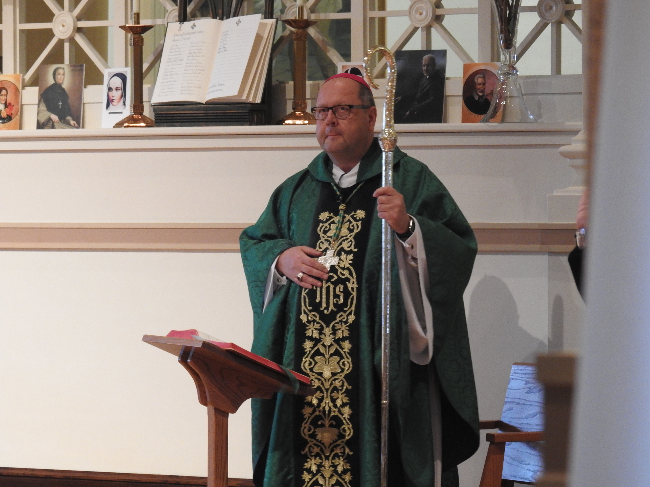 After Mass, he chatted – socially distanced and wearing a face mask – with parishioners. Several families greeted him and one young boy relished the opportunity to hold the bishop’s crosier and try on his zucchetto (the fuchsia skullcap-type hat bishops wear under their miter).