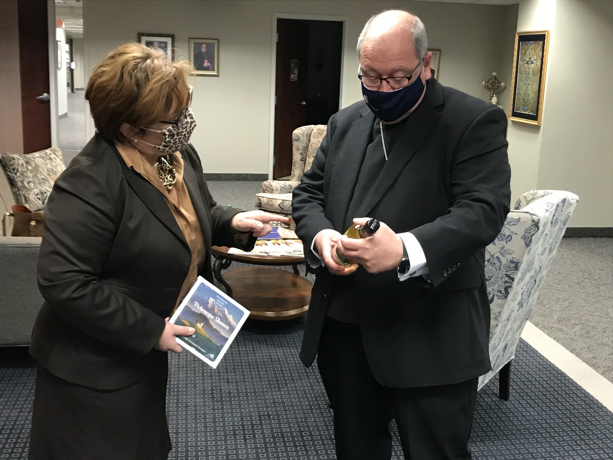 During her short visit, Jerak also presented Bishop Malesic with a book of photos from Slovenia and a bottle of wine from the Bela Krajina region, which was home to the bishop’s grandparents before they immigrated to the United States.