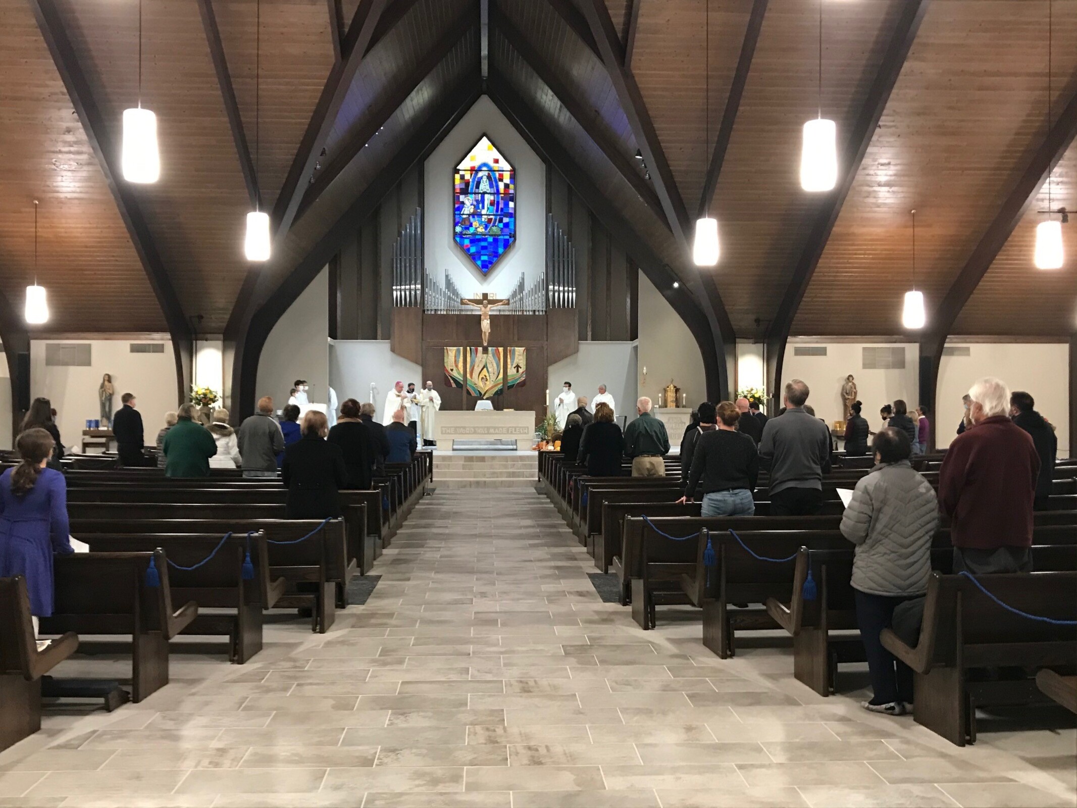 Father Racco noted the large crucifix that hangs over the altar is from the original church, which was dedicated in 1952 and repurposed when the current church was built to accommodate the growing parish. The chalice used at Mass is the parish chalice that belonged to Father Joseph Dempsey, the founding pastor.