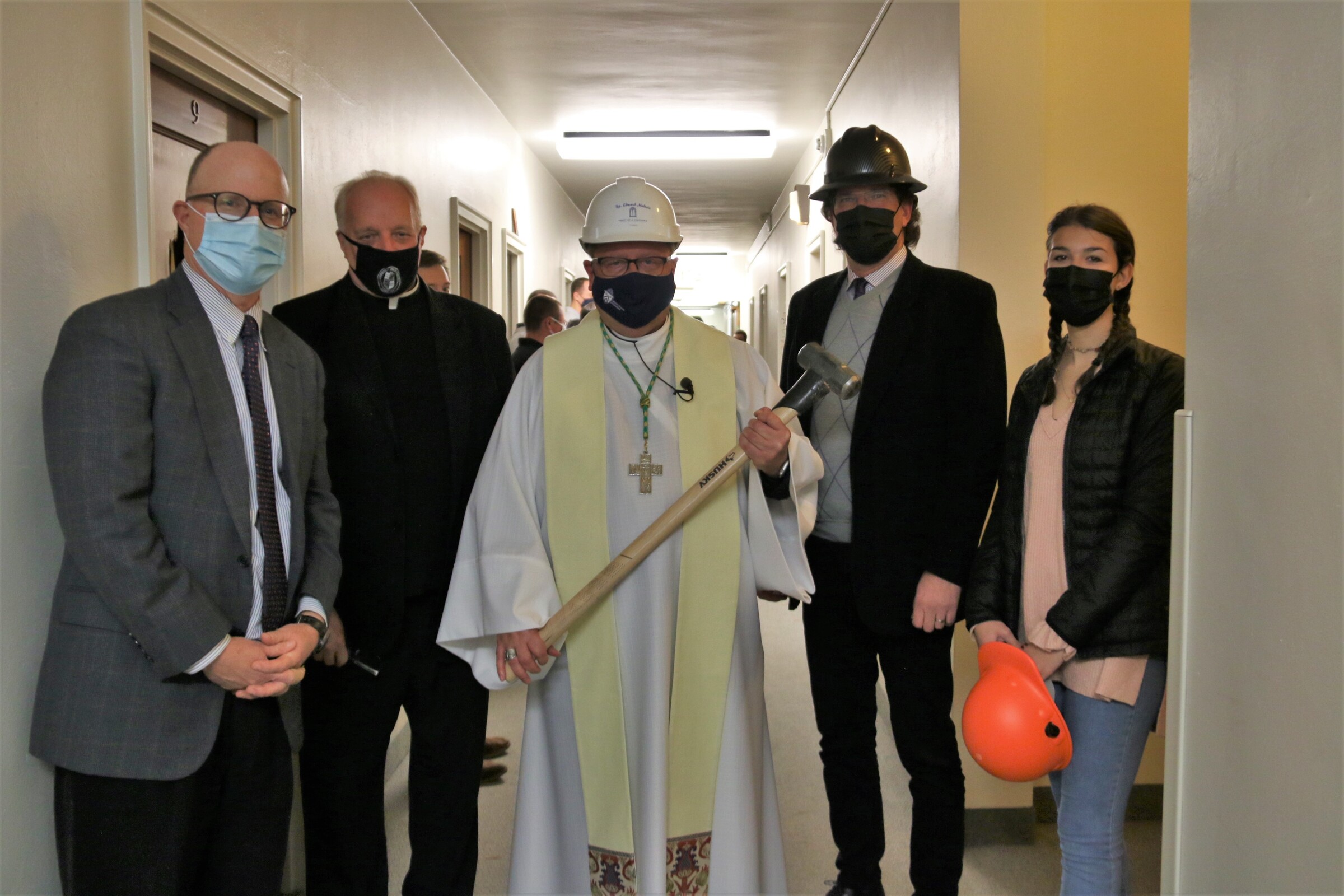 Bishop Edward Malesic took the first ceremonial swing with a sledgehammer to begin a major renovation project on the Saint Mary Seminary wing at the Center for Pastoral Leadership.