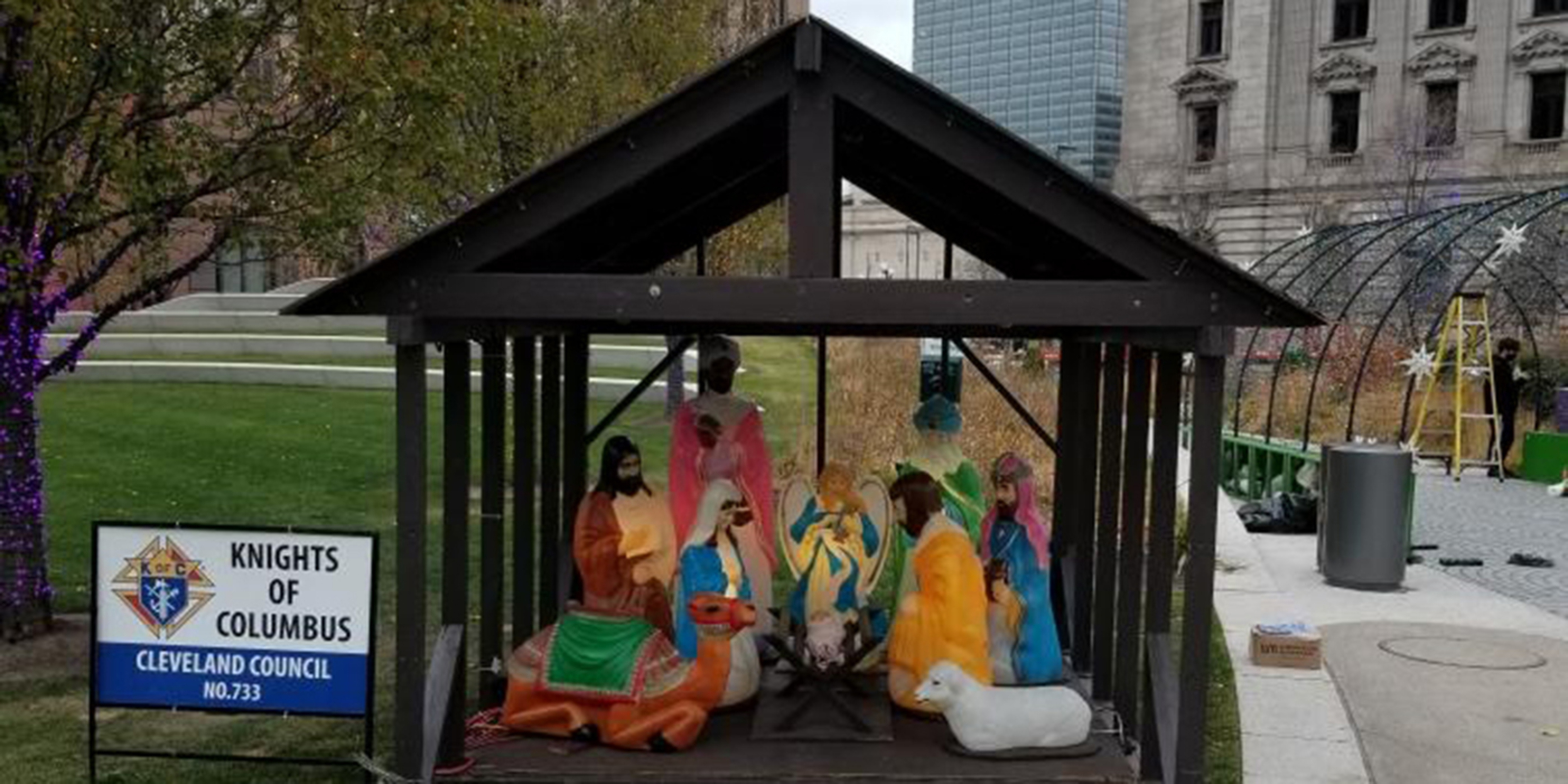 If viewers looked closely, they could see the 400-square-foot outdoor crèche in the northeast block of Public Square. The 10-piece display was assembled the week prior to the lighting ceremony by volunteers from the Knights of Columbus, Cleveland Council No. 733.