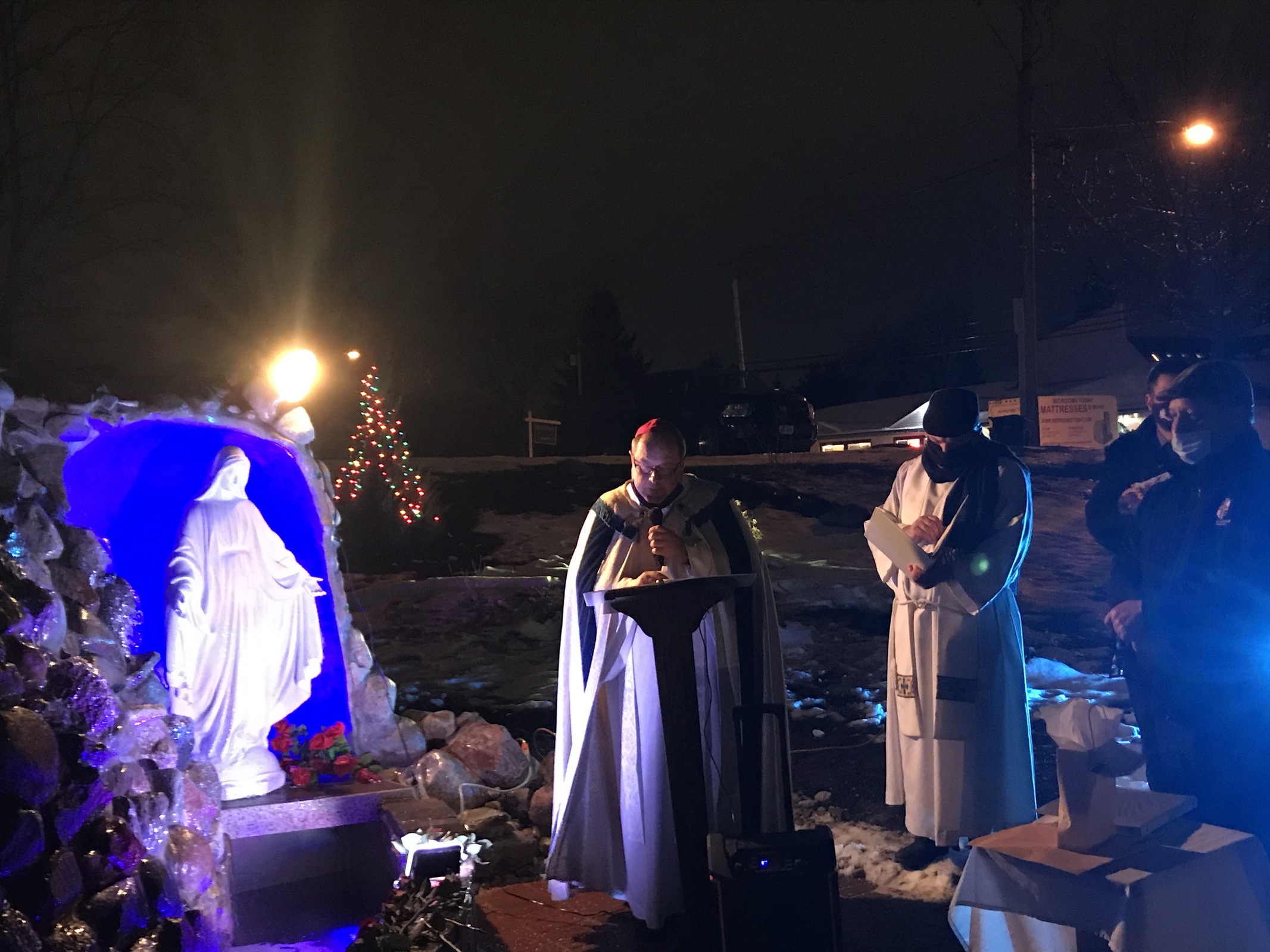 Bishop Edward Malesic dedicated the grotto during a brief outdoor ceremony on Dec. 8, the feast of the Immaculate Conception. The ceremony was livestreamed on the parish Facebook page.