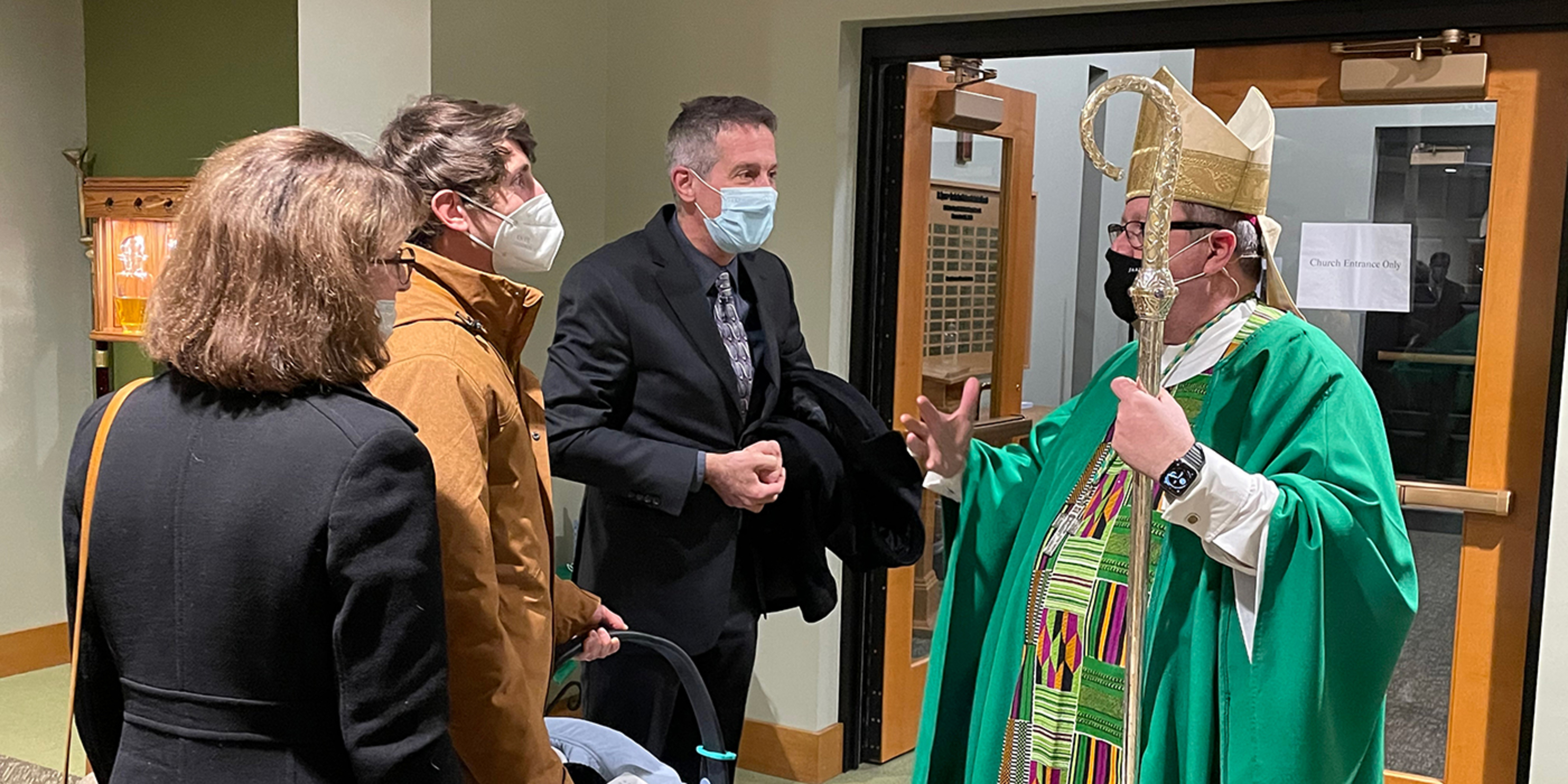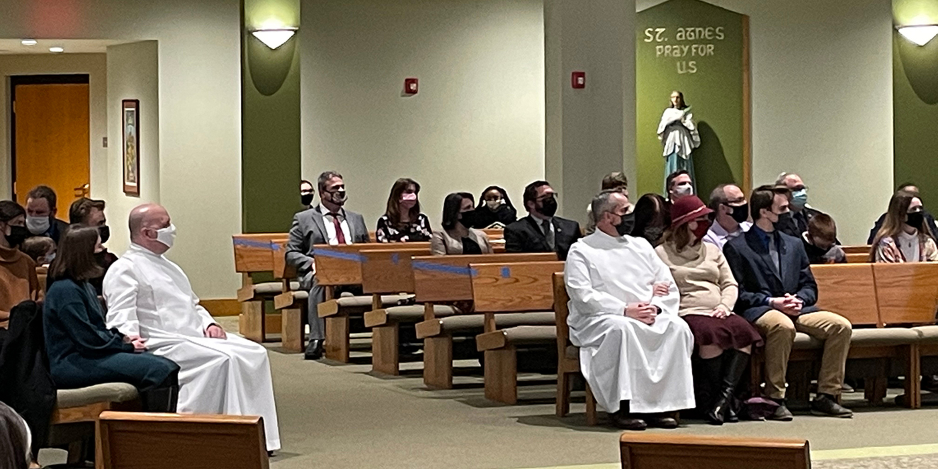 Father Bob Marva, OFM, pastor of St. Agnes + Our Lady of Fatima Parish in Cleveland, welcomed Bishop Edward Malesic to the parish on Feb. 6. The bishop celebrated the vigil Mass and instituted two candidates for the permanent diaconate -- Scott Cerrito of Our Lady of Grace Parish in Hinckley and Michael Costantini of St. Barnabas Parish, Northfield – in the ministry of acolyte.