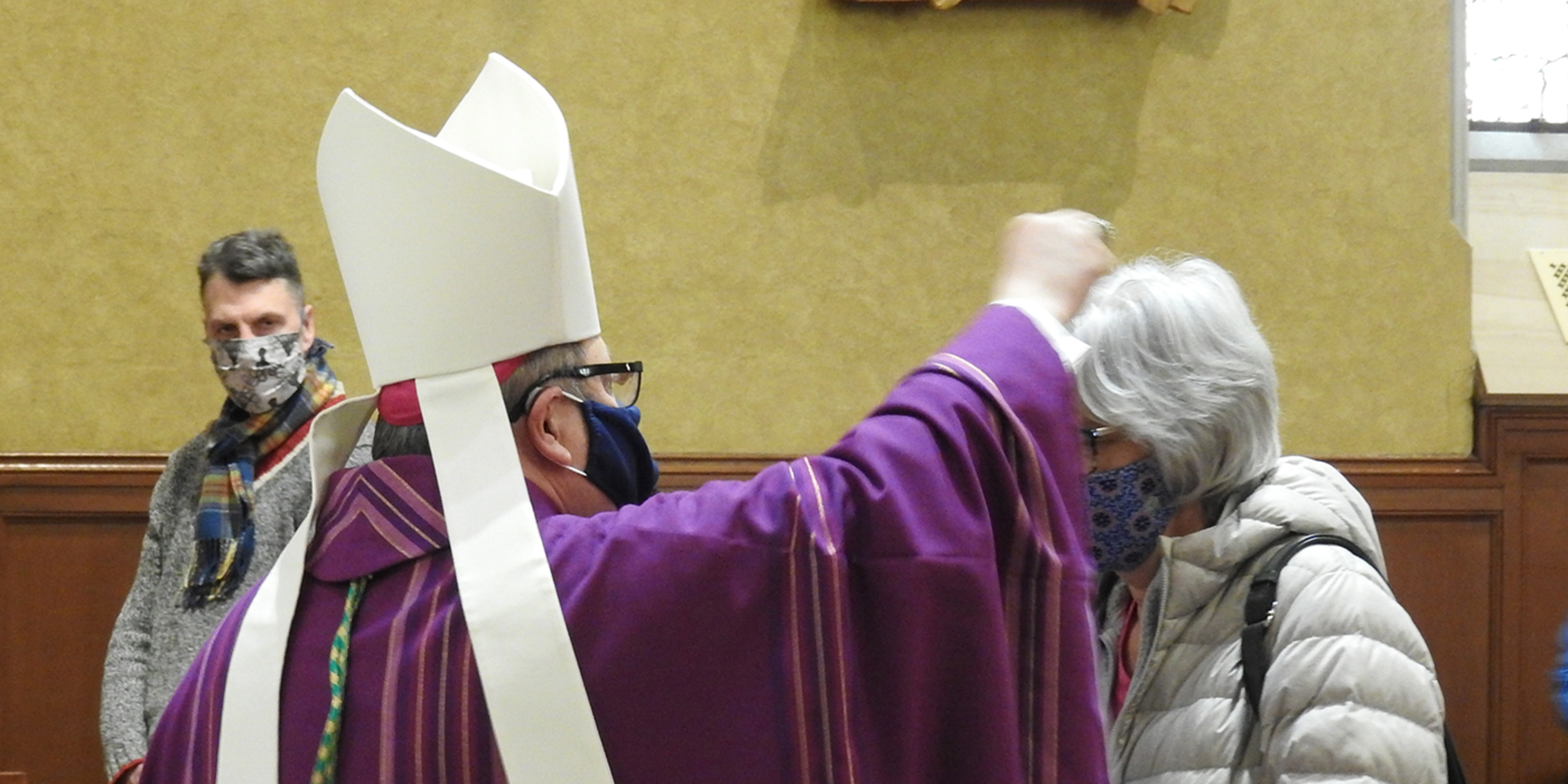 The Mass included the traditional blessing and distribution of ashes. In deference to the pandemic, ashes were sprinkled on the heads of the faithful rather than being applied in a cross shape to foreheads.
