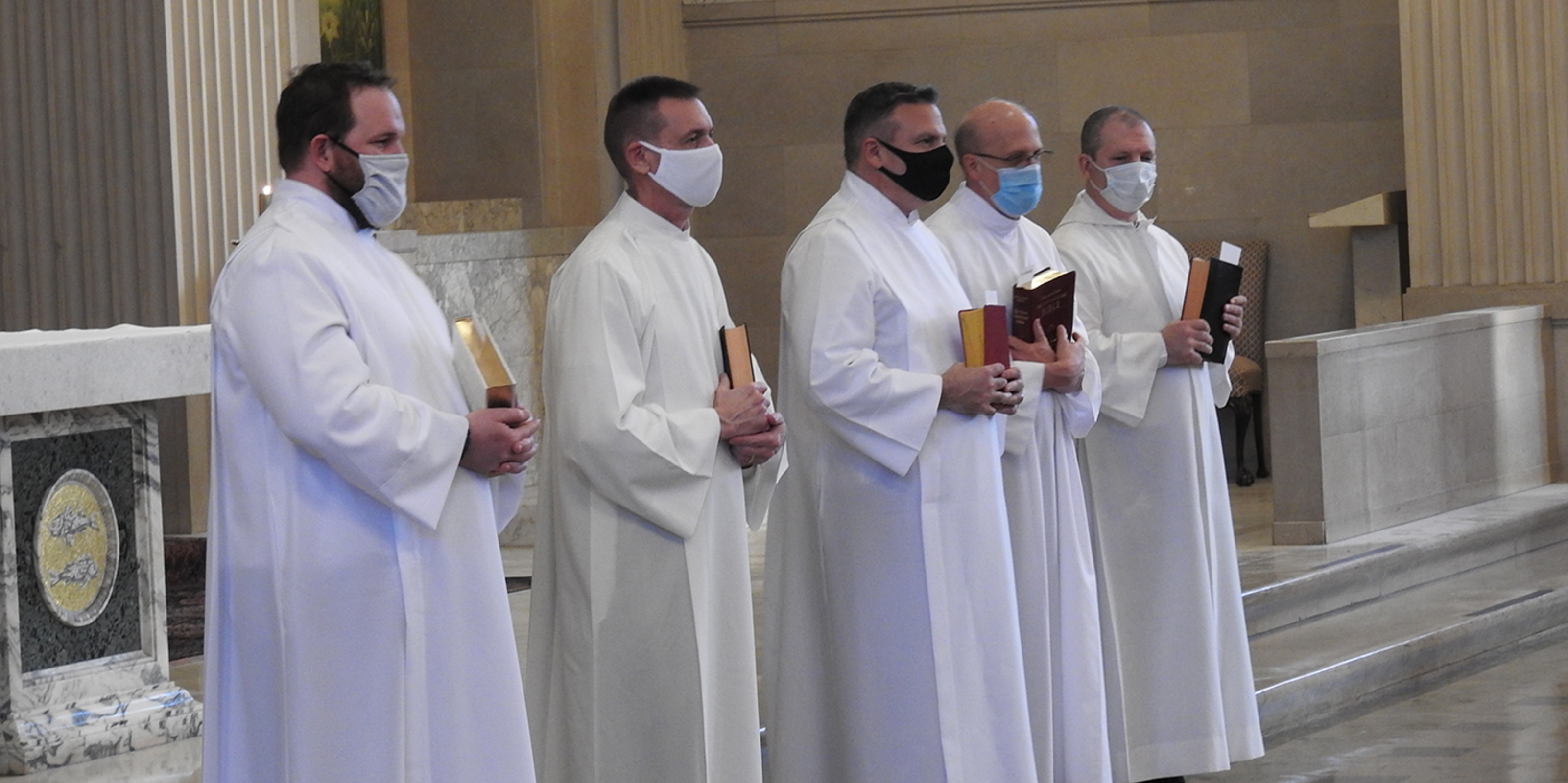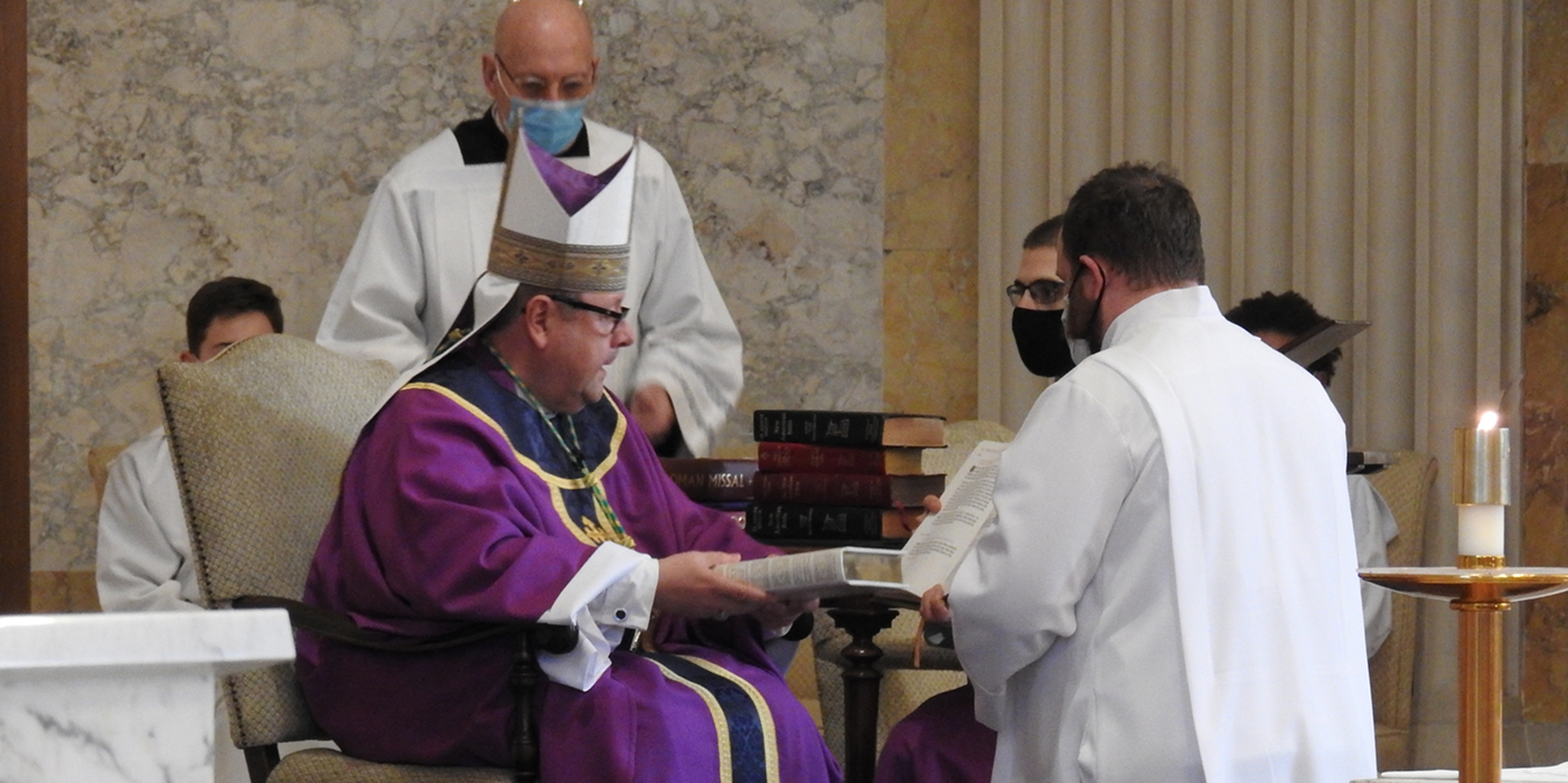 As lectors – ministers of the Word – the newly instituted will proclaim that word in the liturgical assembly, instruct children and adults in the faith and prepare them to receive the sacraments, the bishop told the men. He said they also will bring the message of salvation to those who have not yet received it. “Do the work of an evangelist,” he instructed them. “We support you, we pray for you, we long for what you are willing to tell us. We desire to see God speak through you.”