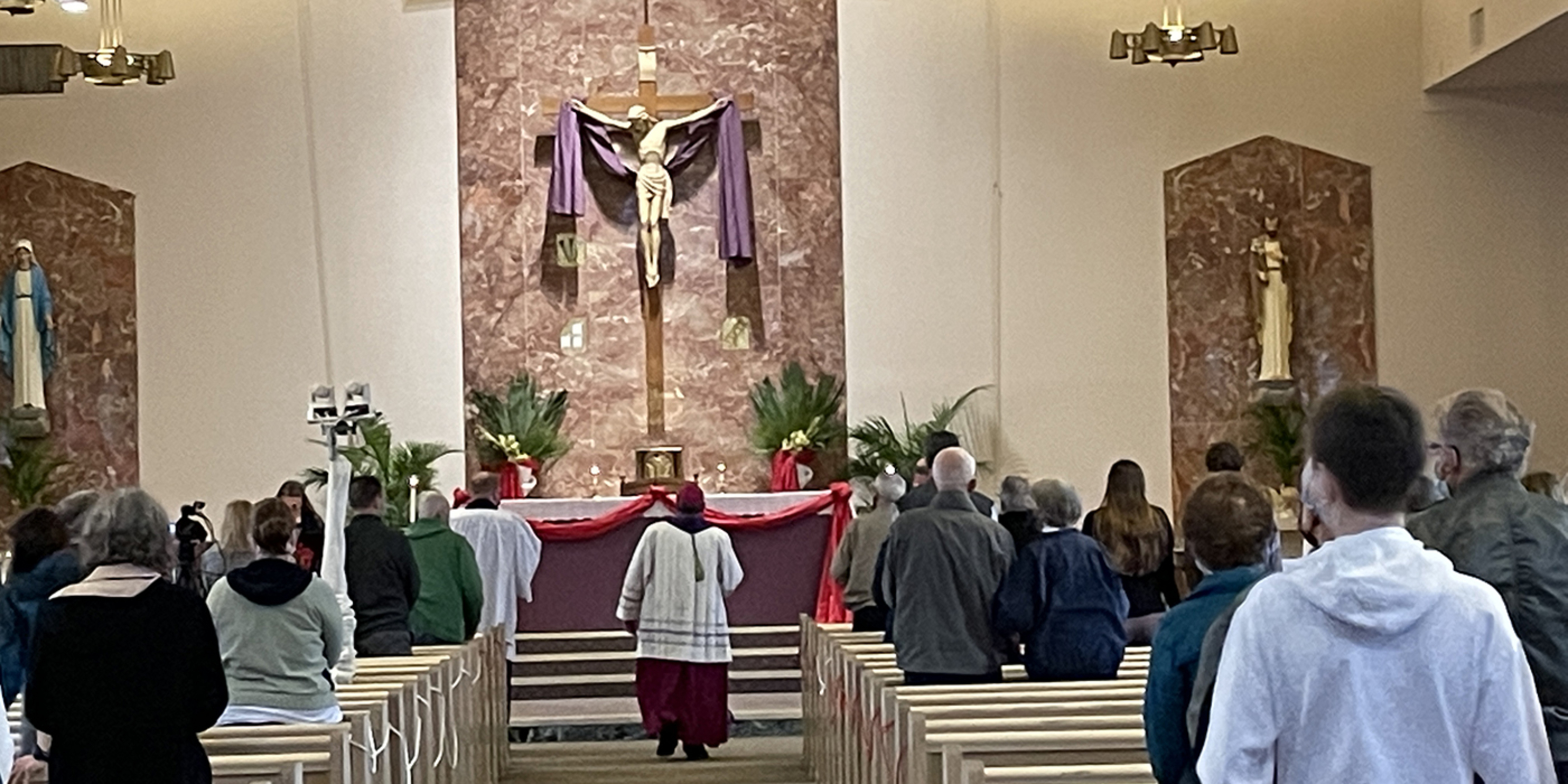 The deacon and two servers walked the perimeter of the church, stopping at each of the 14 stations, while the bishop remained at the altar with Father Ausperk and a narrator at podiums as they prayed and read portions of the stations.