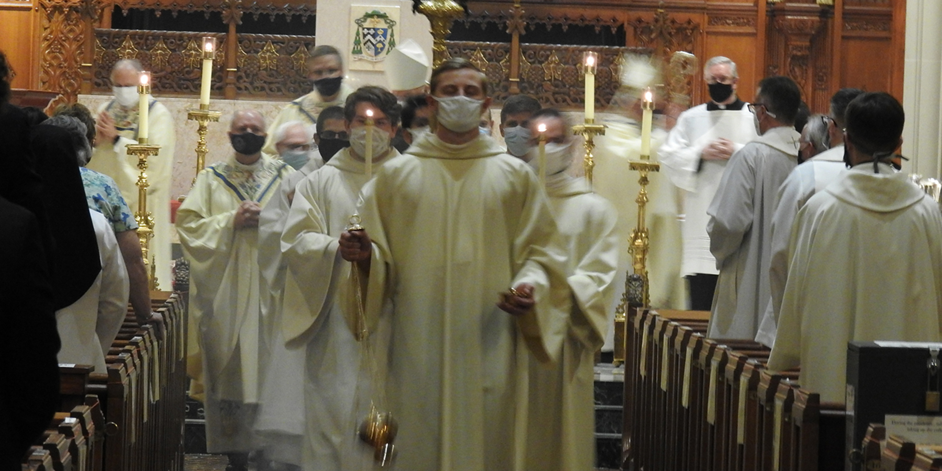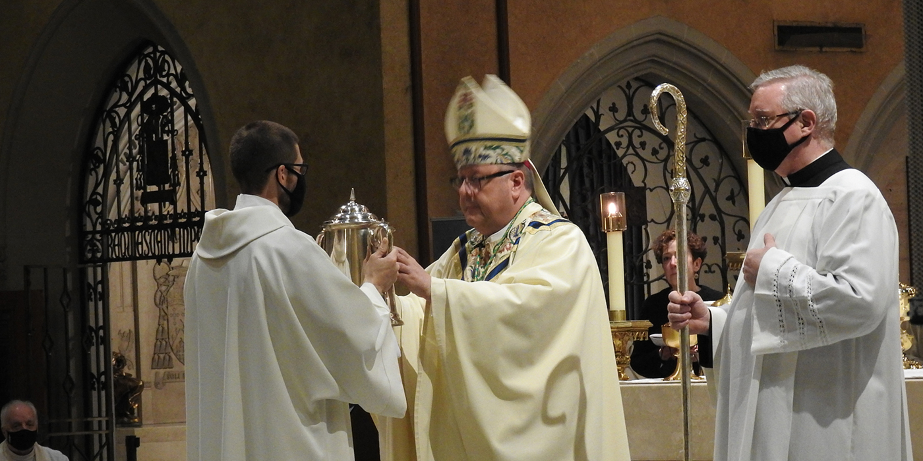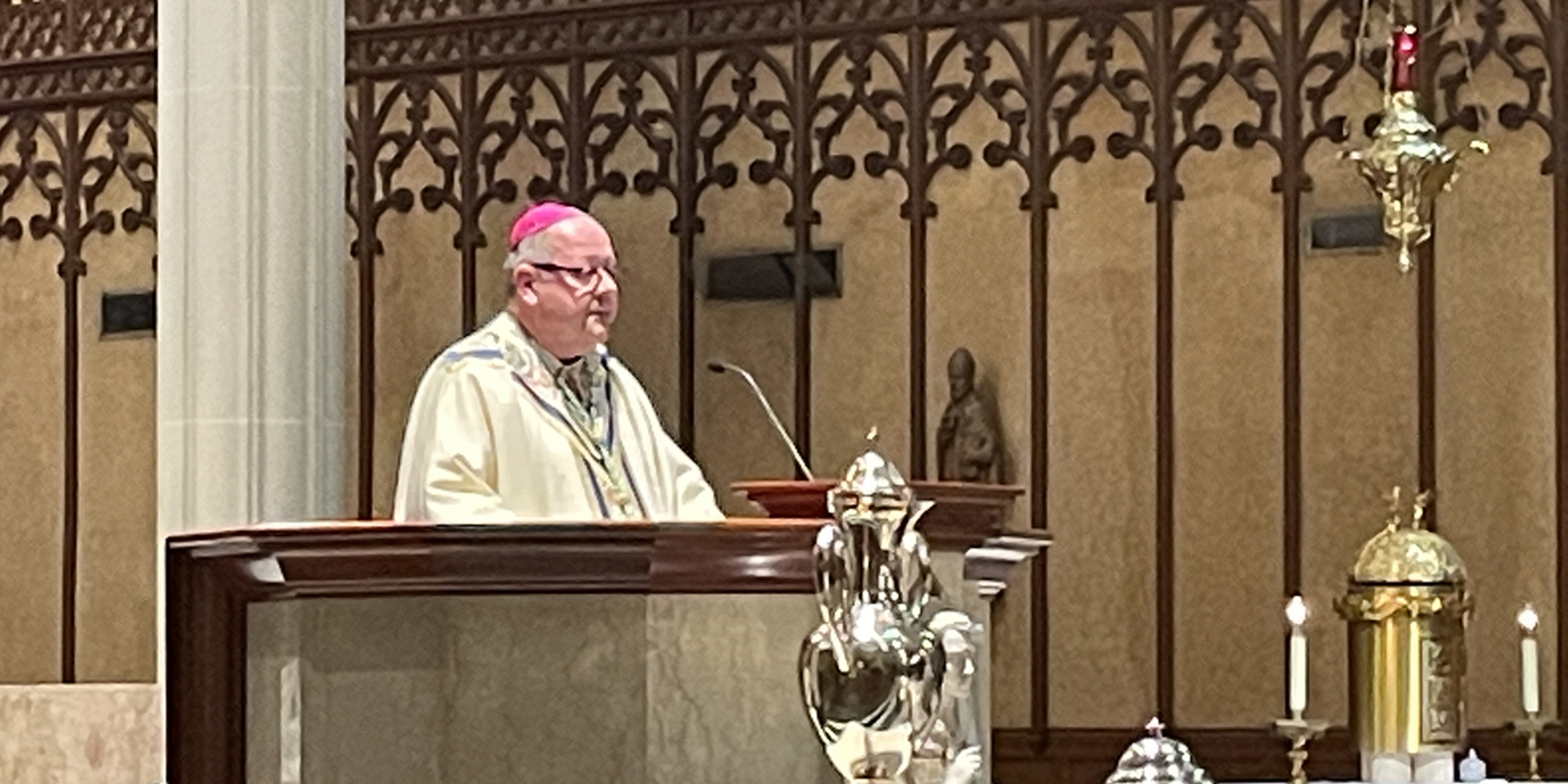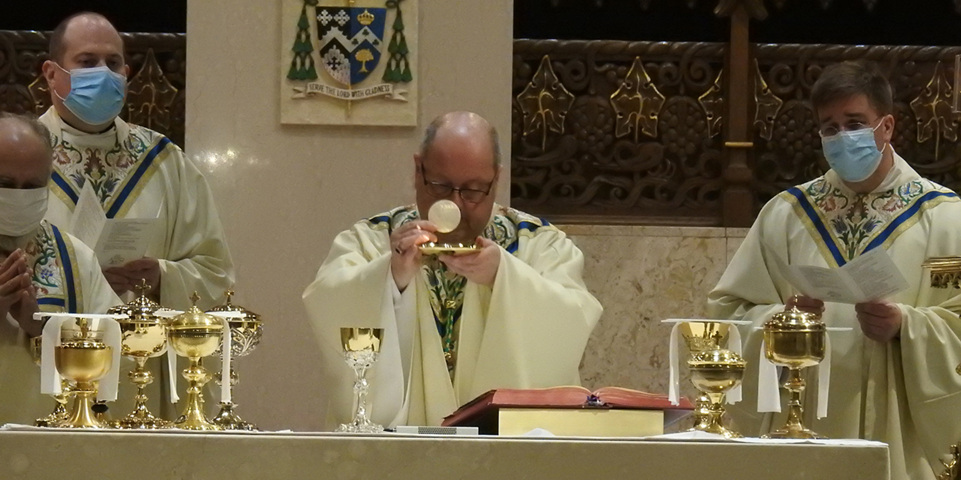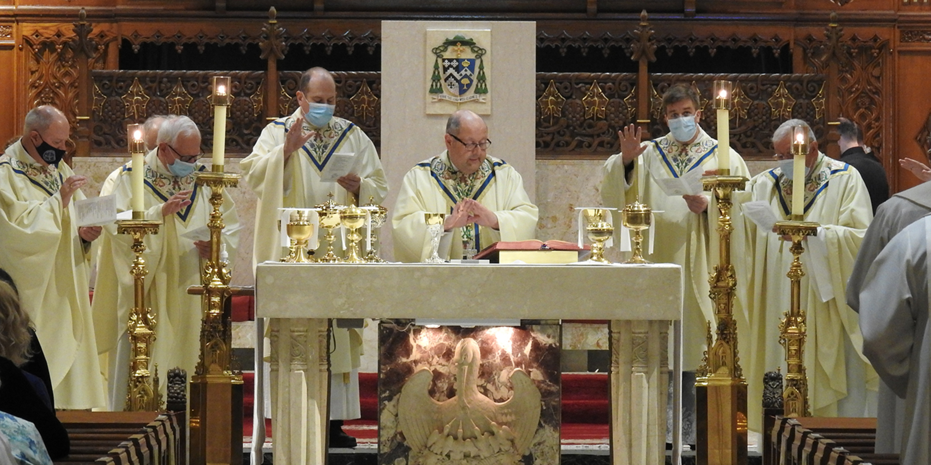 Acknowledging the limited attendance, Bishop Malesic said he knows that the cathedral “is filled to the brim by the blessing of the Holy Spirit. And at this Mass, we can know that this sacred space is filled with Mary, the mother of God, and all the saints who intercede for us, choirs of angels who adore God with us, Jesus who never leaves us as orphans and many others who are sitting around their computer screens praying along with us right now, including so many of our priests.”