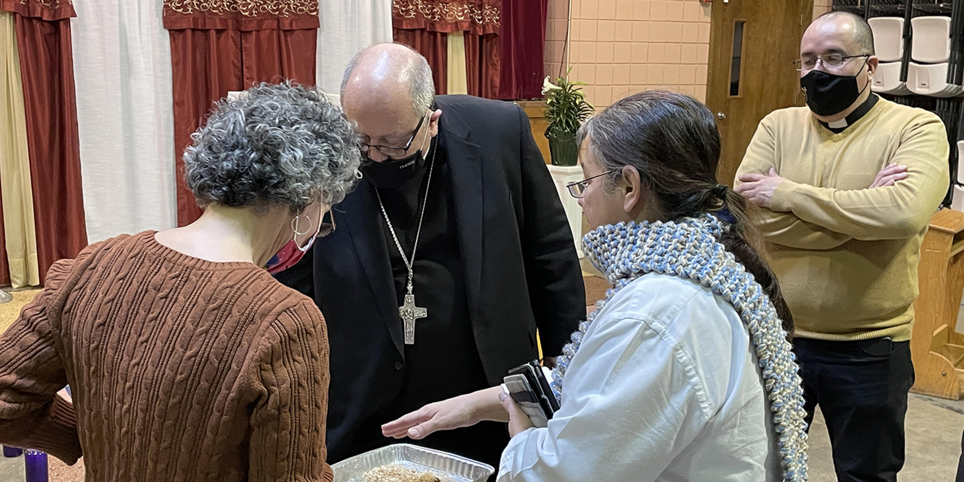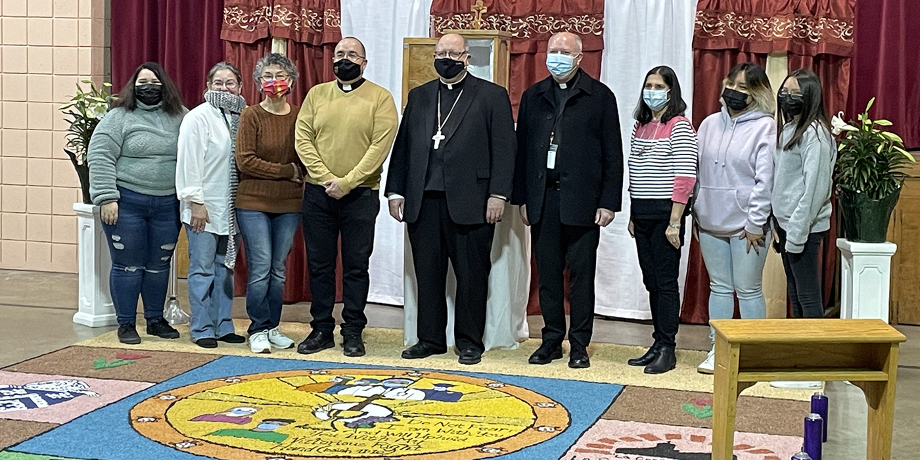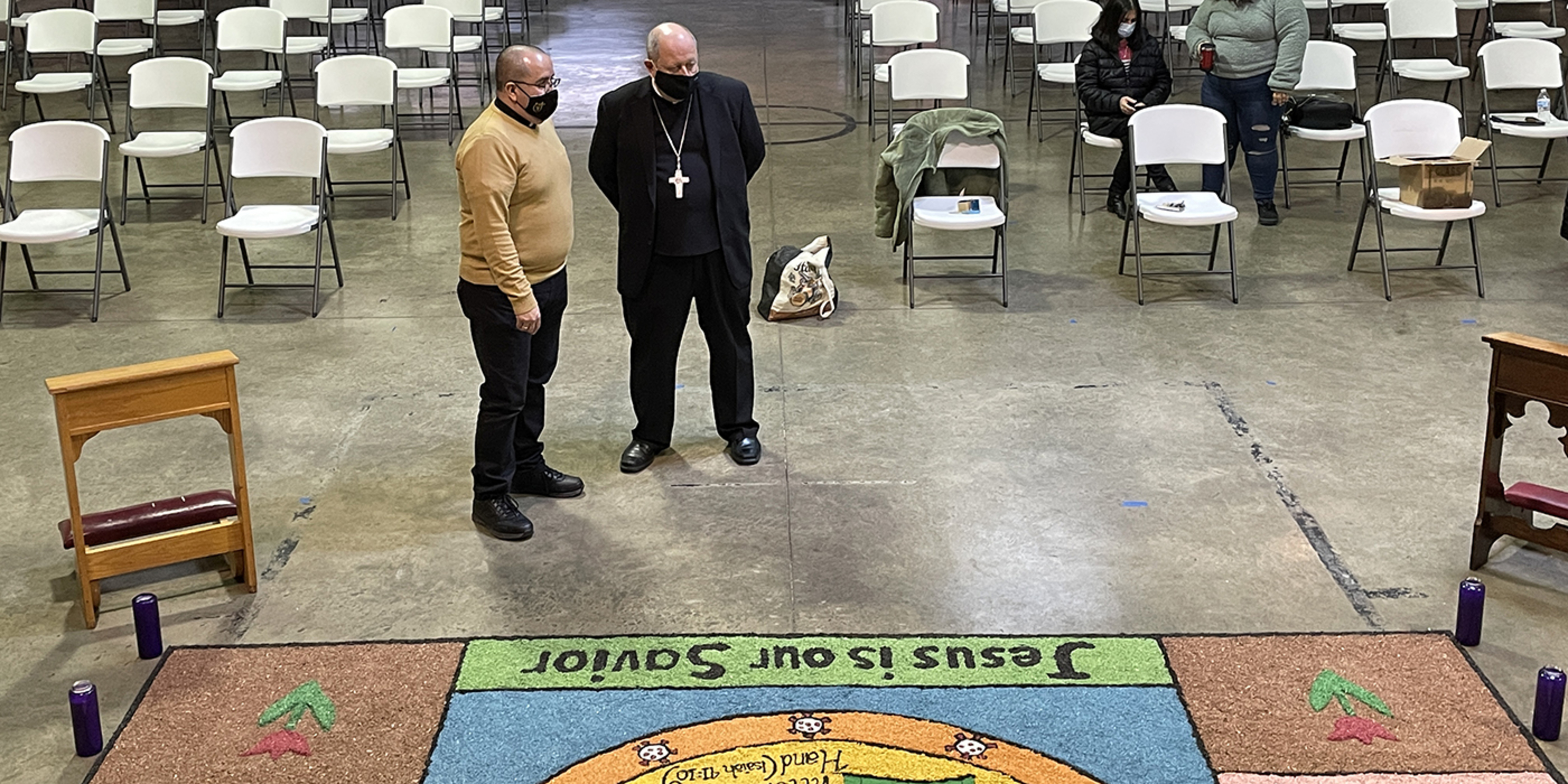 Bishop Edward Malesic and Father Dan Schlegel, vicar for clergy and religious, stopped by on Holy Thursday to admire the project. Parishioners and Father Francisco “Paco” Garnica, CSJ, Sagrada Familia administrator, explained the significance and creation of the carpets to them.