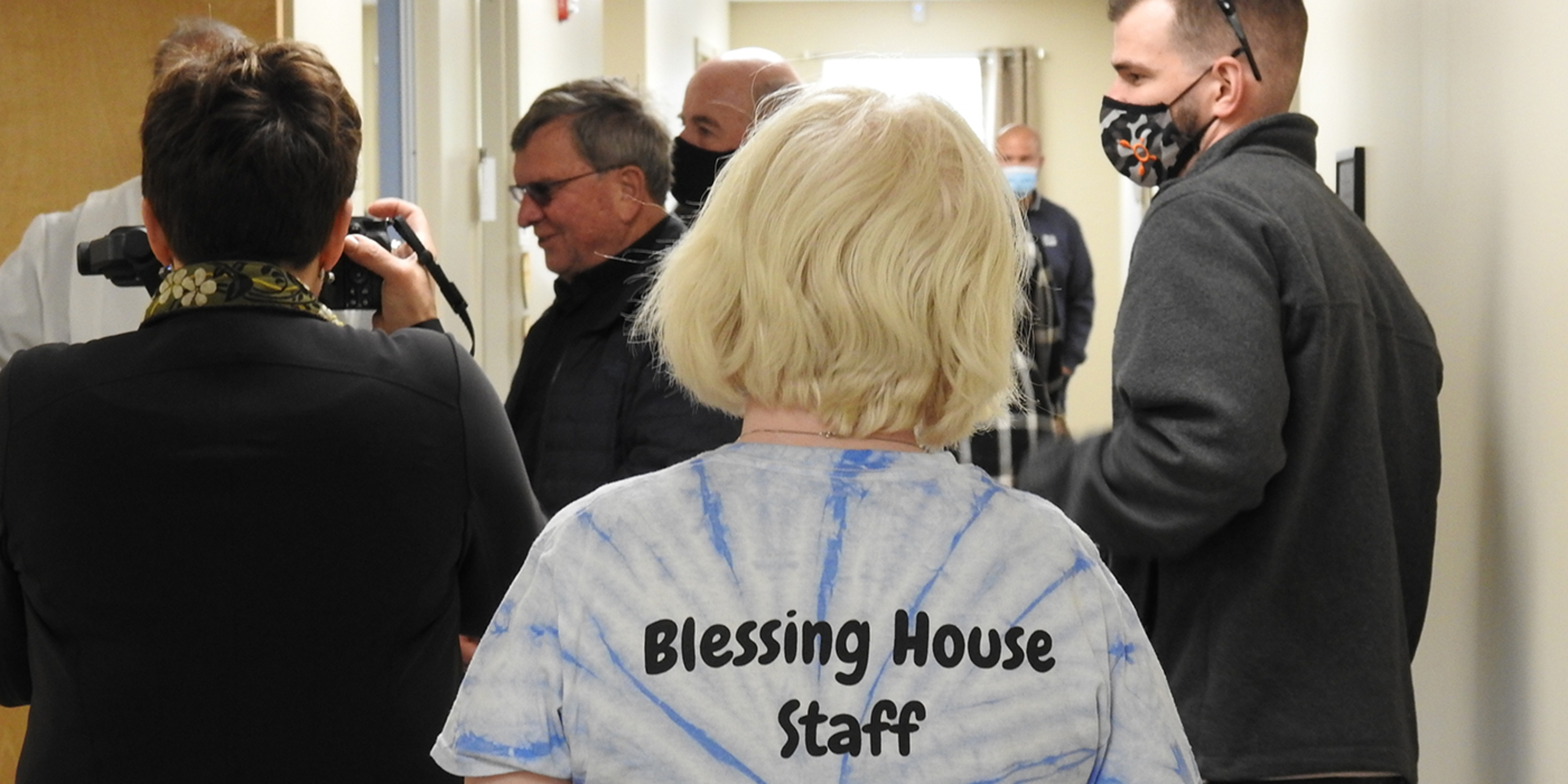 About two hours before the dedication and blessing of the new Blessing House, the skies cleared and the sun began to shine. Notre Dame Sister Mary Berigan, co-founder and executive director of Blessing House, beamed as she greeted staff, volunteers, members of the board of directors, vendors and other visitors.