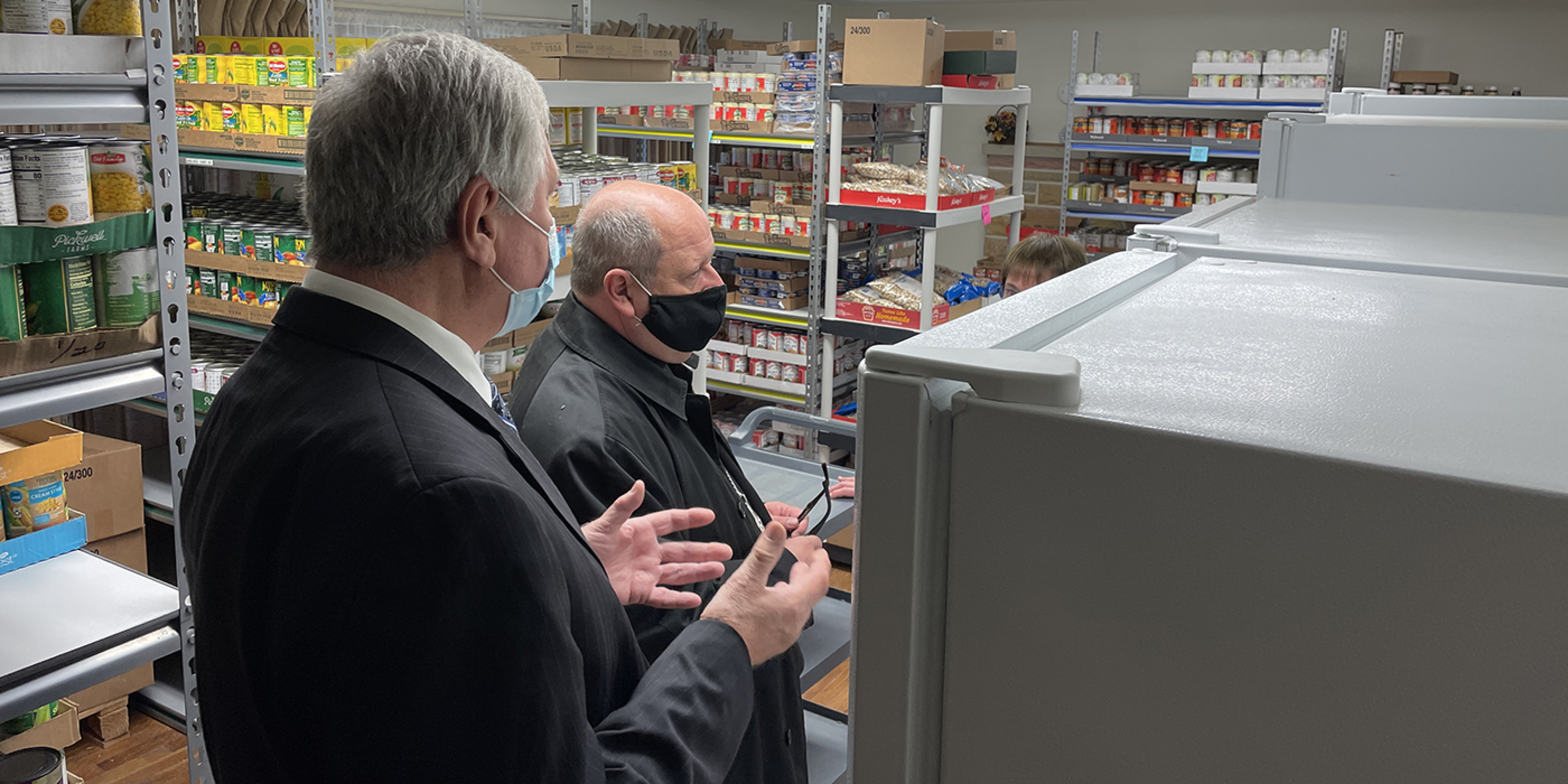 One large room was stacked with the pre-filled boxes of non-perishable food, received through a collaboration with Second Harvest Food Bank. Parishioners, St. Jude School students and others also donate non-perishable food, personal hygiene products and cleaning supplies that pantry volunteers organize and neatly stack on shelves. Meat is stored in several large freezers